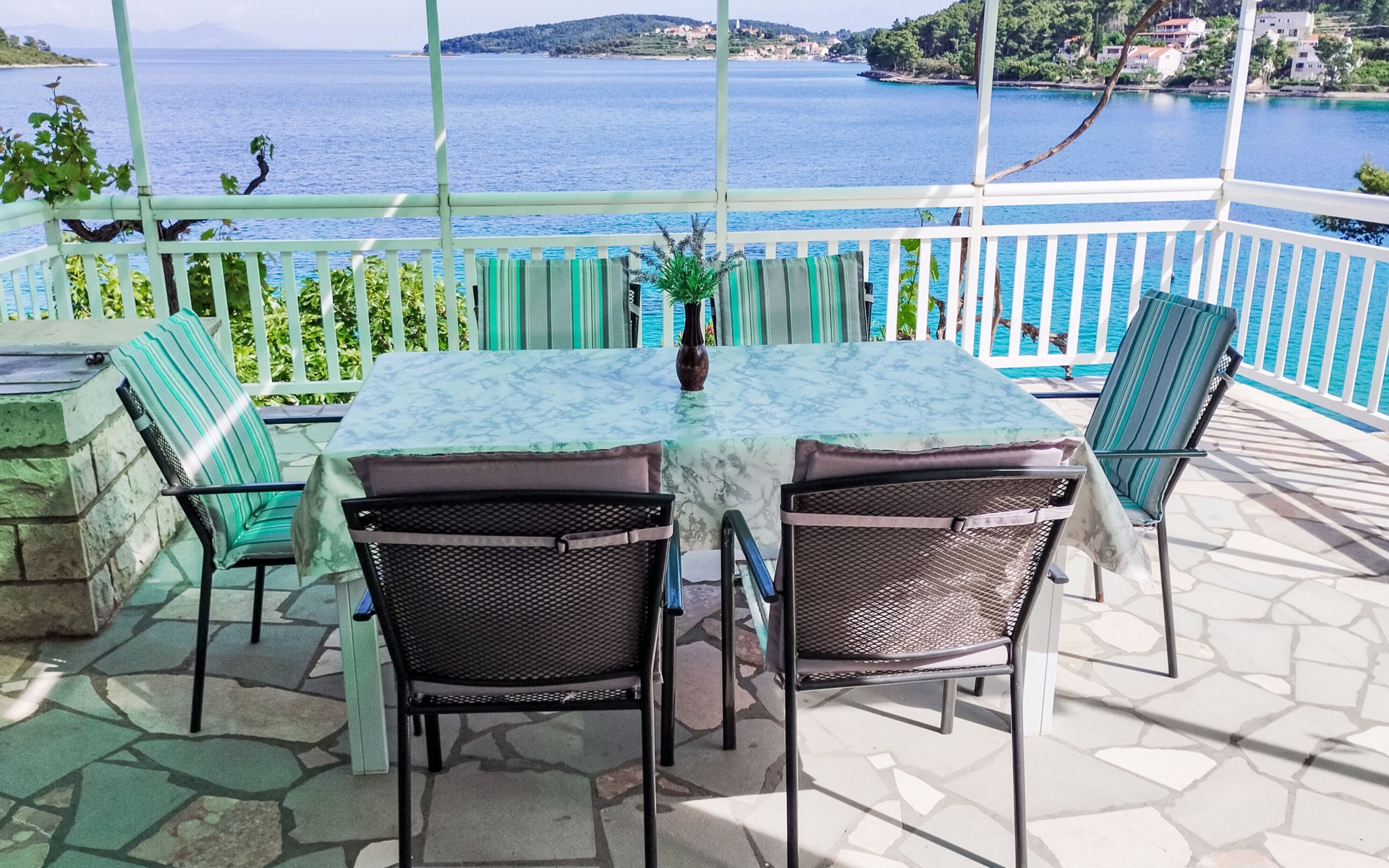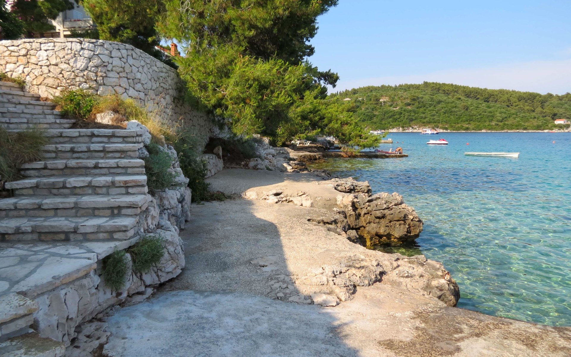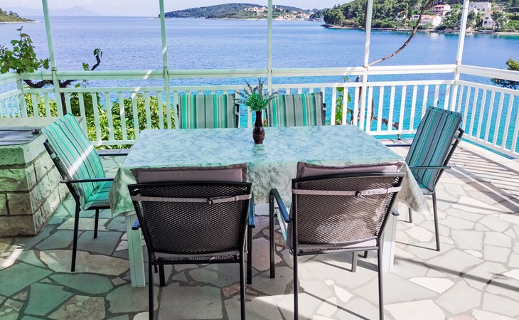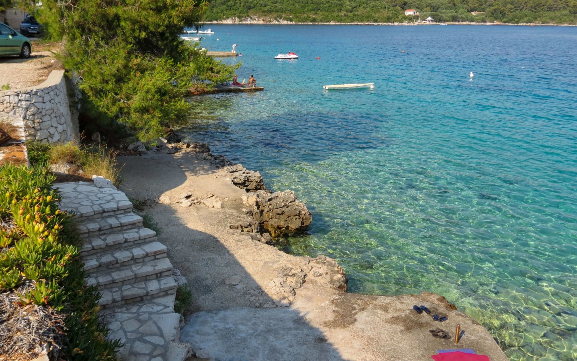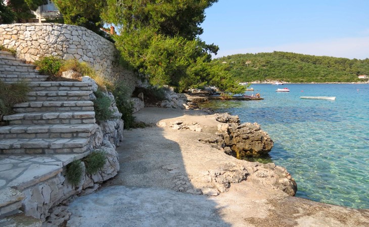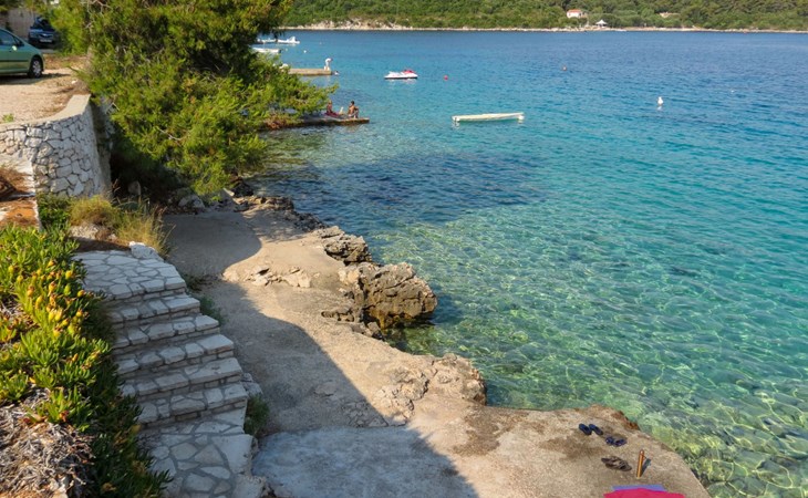 Beautiful single-family house "Bernardi", 2 storeys. In the district of Lumbardijsko Račišće 1.5 km from the centre of Lumbarda, in a sunny position on a slope, 15 m from the sea, 15 m from the beach, in a cul-de-sac, in the countryside, south facing position. Private: property 550 m2 (fenced). Outdoor shower, barbecue. In the house: internet access. Parking at the house on the premises. Shop 1.5 km, restaurant 1.5 km, bus stop 1.7 km, sandy beach 2 km pebble beach 2 km, concrete beach 15 m. The house is situated in a nice, quiet bay. Stairs leading from the house over the small local cul-de-sac street to the concrete beach.