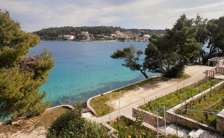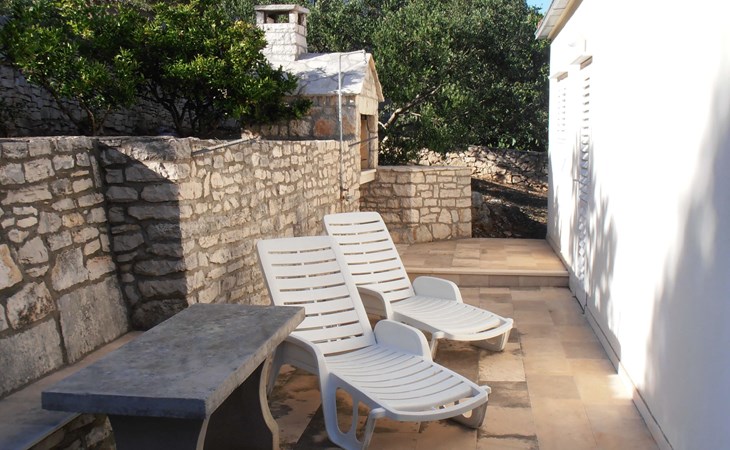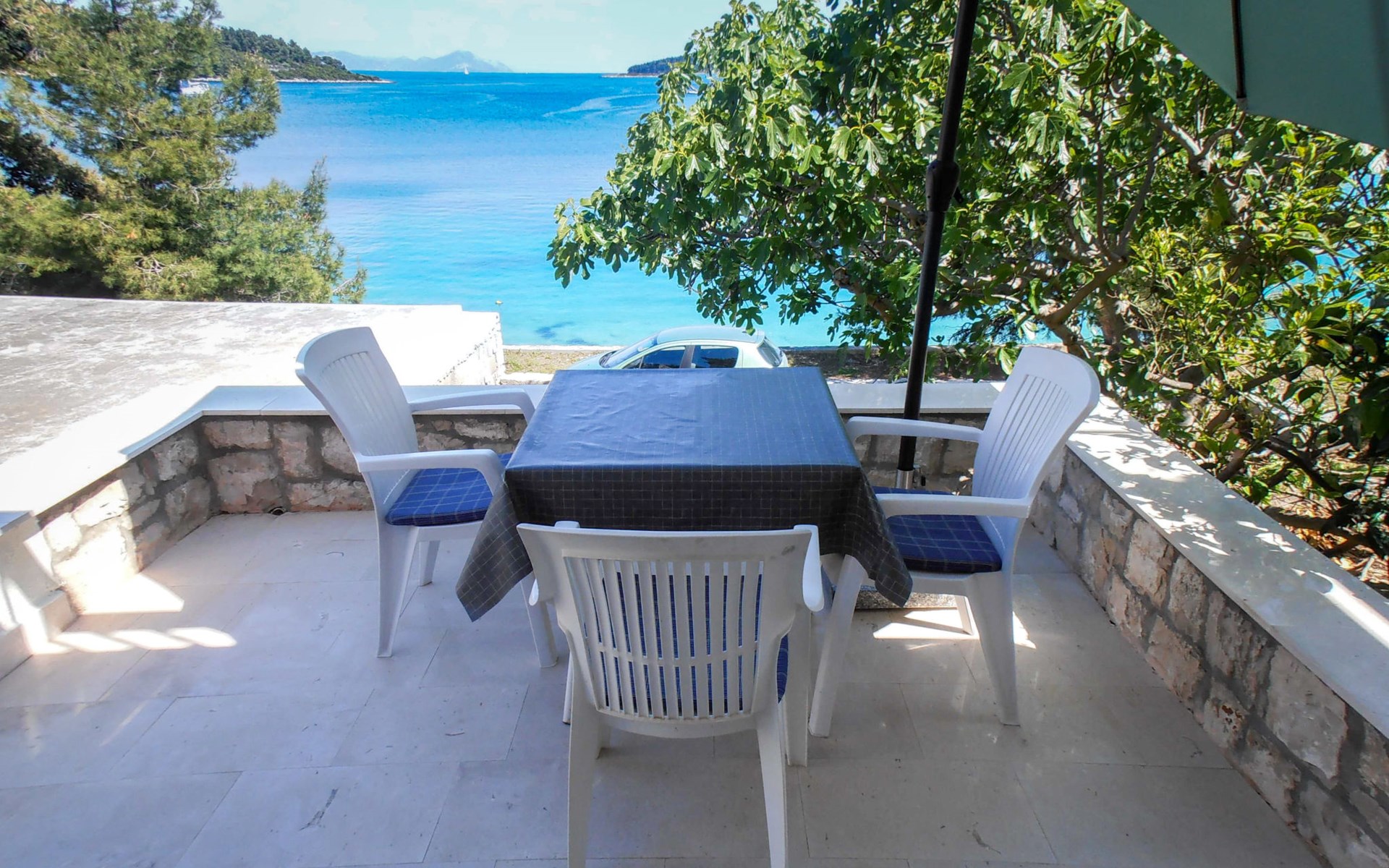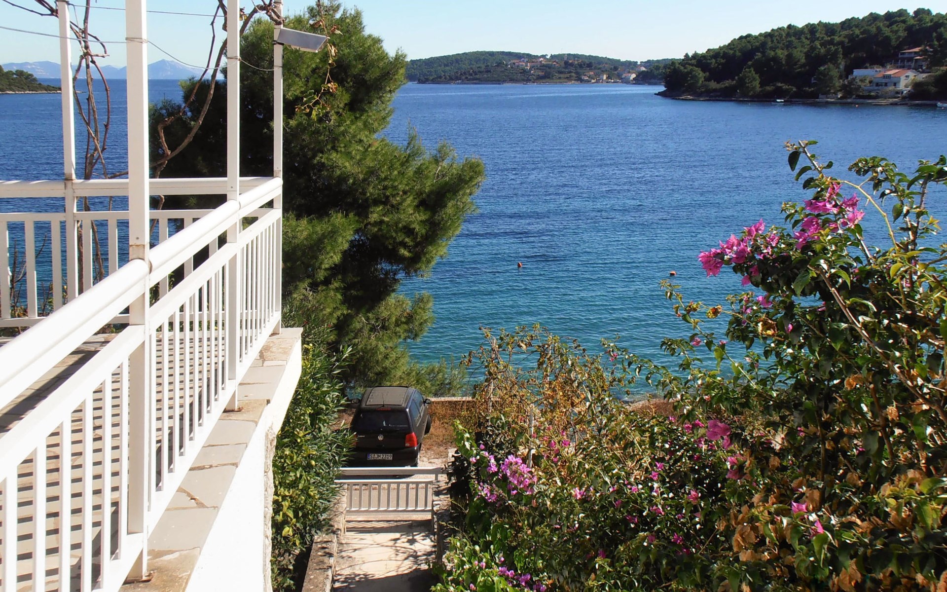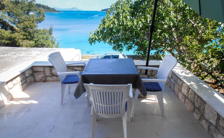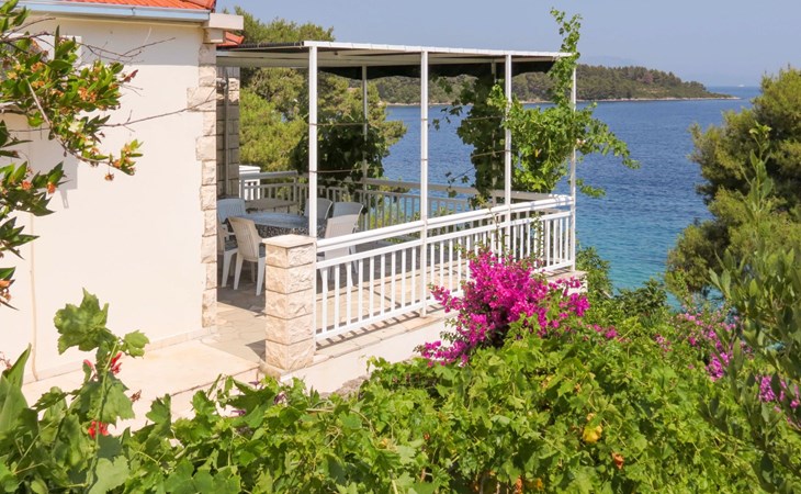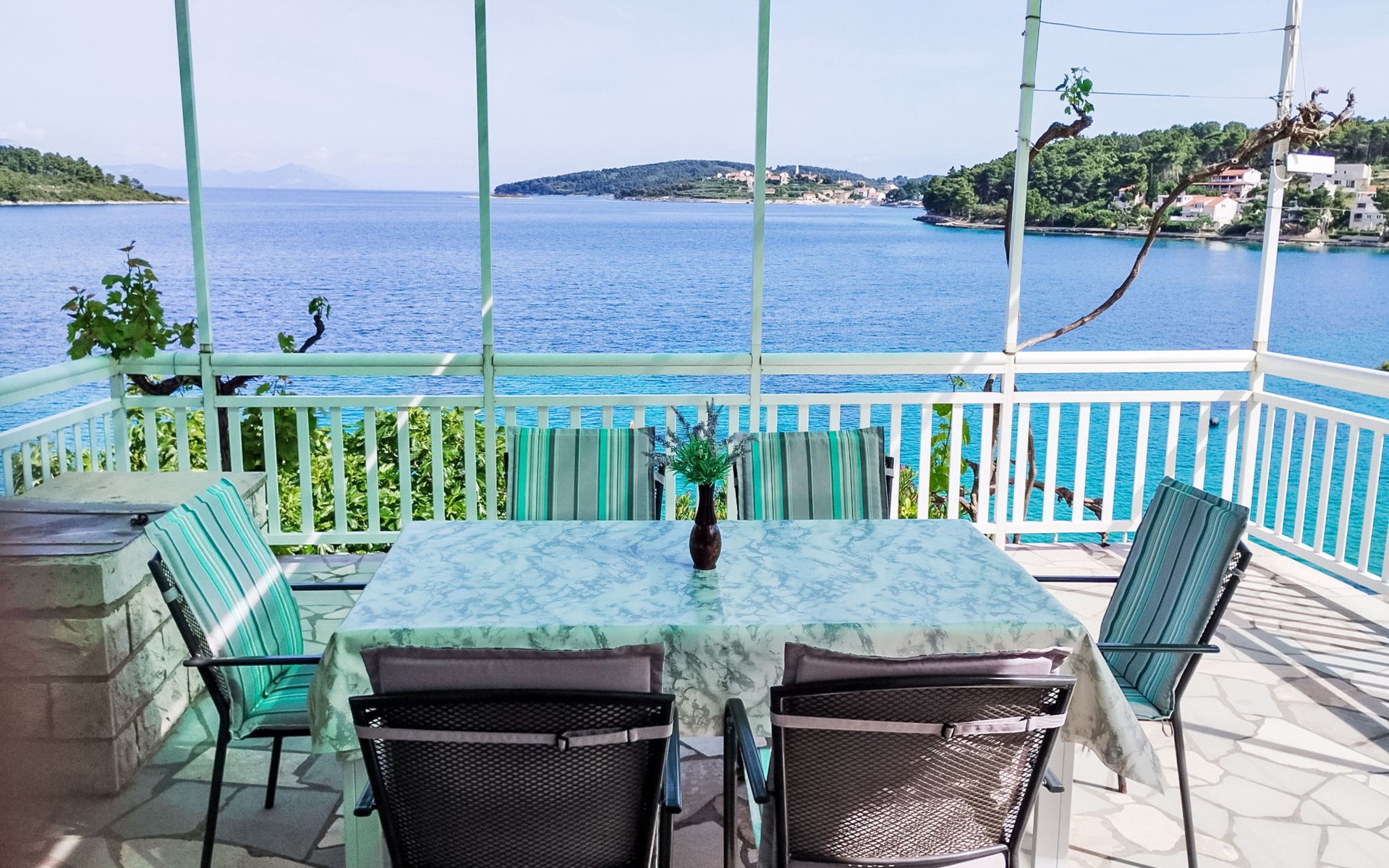 Beautiful single-family house "Bernardi", 2 storeys. In the district of Lumbardijsko Račišće 1.5 km from the centre of Lumbarda, in a sunny position on a slope, 15 m from the sea, 15 m from the beach, in a cul-de-sac, in the countryside, south facing position. Private: property 550 m2 (fenced). Outdoor shower, barbecue. In the house: internet access. Parking at the house on the premises. Shop 1.5 km, restaurant 1.5 km, bus stop 1.7 km, sandy beach 2 km pebble beach 2 km, concrete beach 15 m. The house is situated in a nice, quiet bay. Stairs leading from the house over the small local cul-de-sac street to the concrete beach.