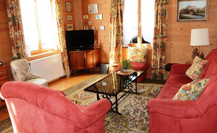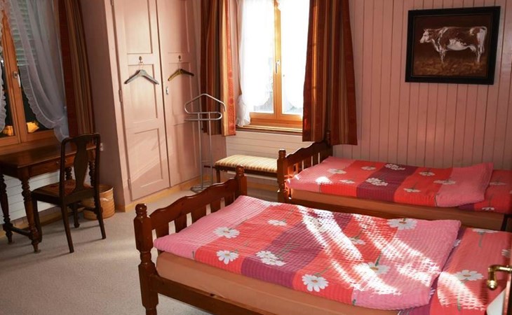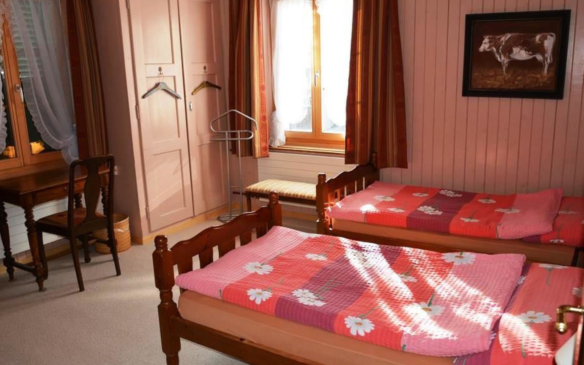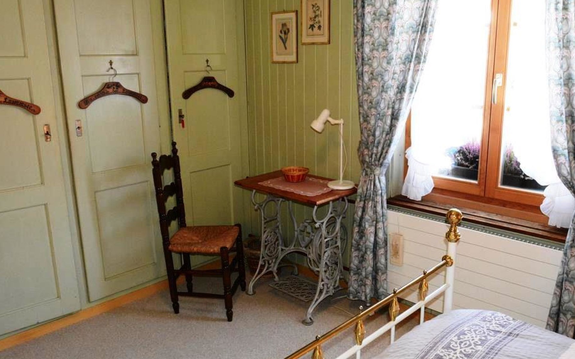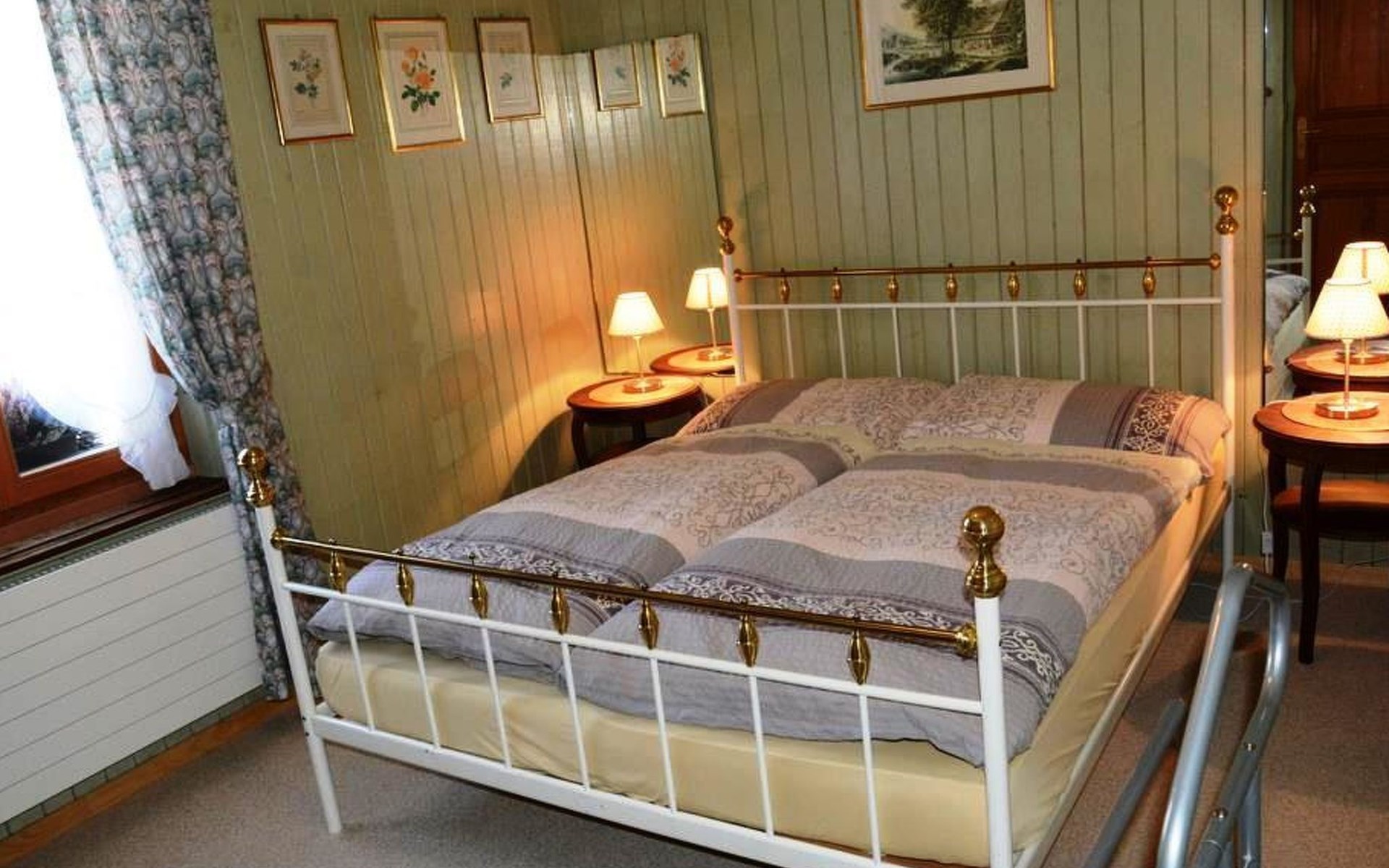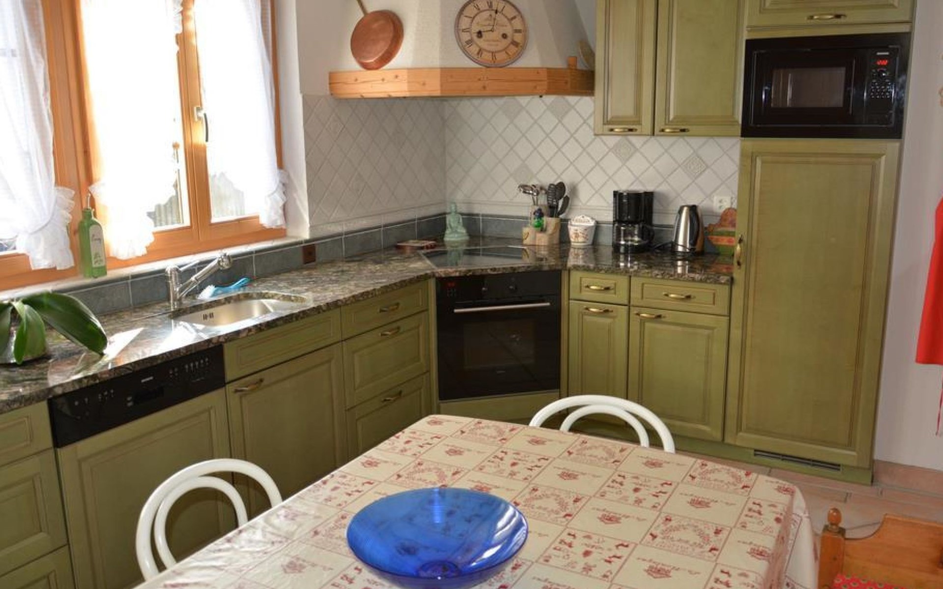 A simply furnished double bedroom (180x200cm) with cupboard, a simple bedroom with 2 beds (90x200cm each). Large rustic furnished living room with couch, radio/TV/video recorder and table with chairs. Separate kitchen equipped with ceramic stove, dishwasher, oven, refrigerator with freezer, coffee machine, fondue-raclette set (up on request) and dining table. Bathroom with bathtub and toilet. Non-smoking apartment! Baby cot (70x120cm) incl. bed linen available.