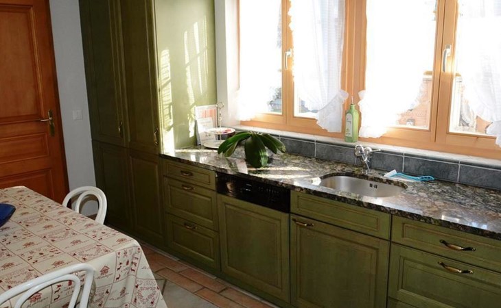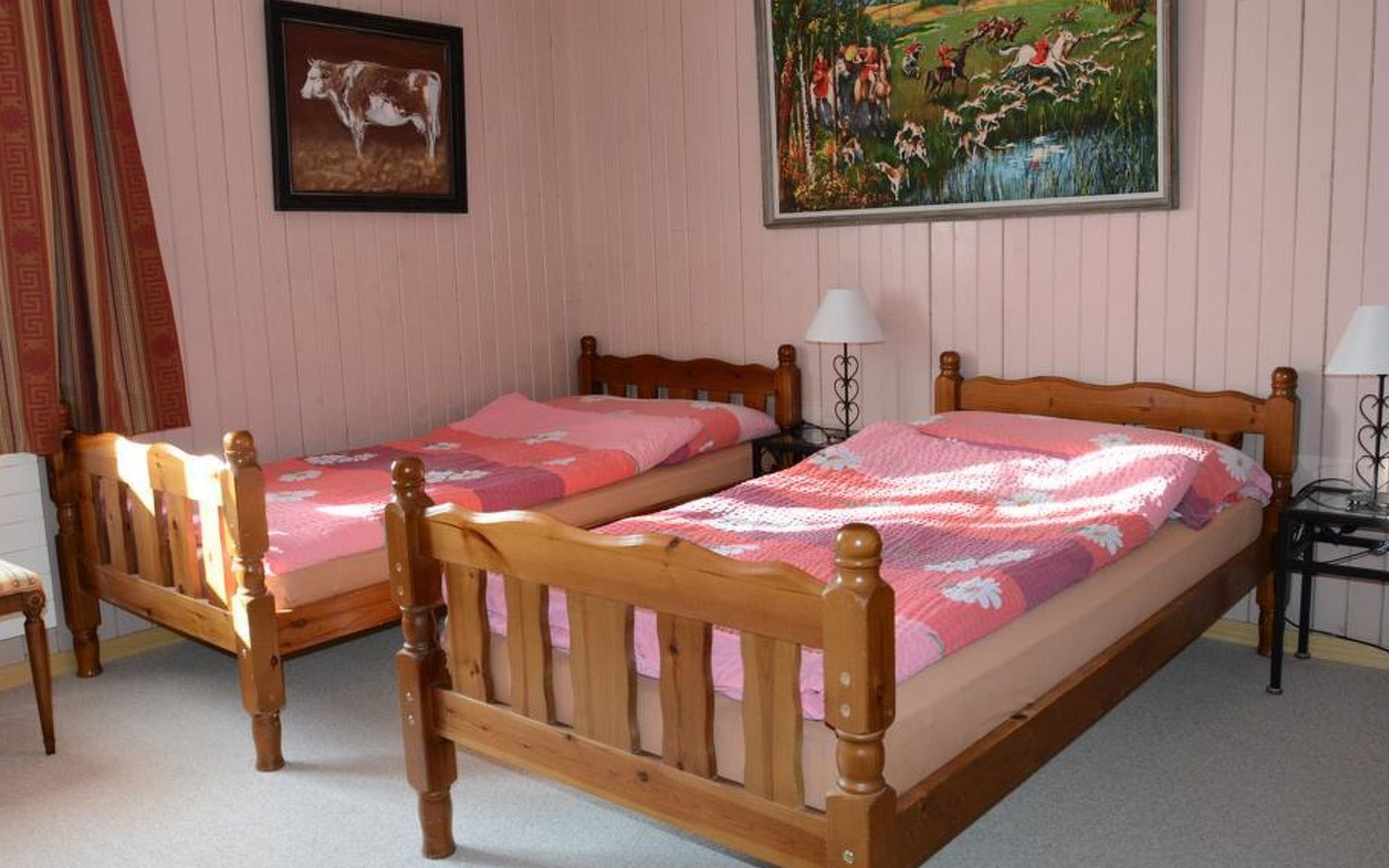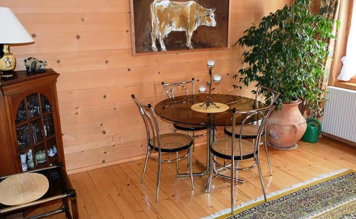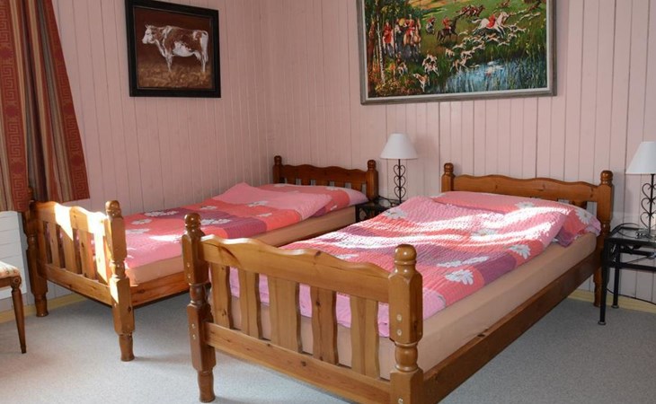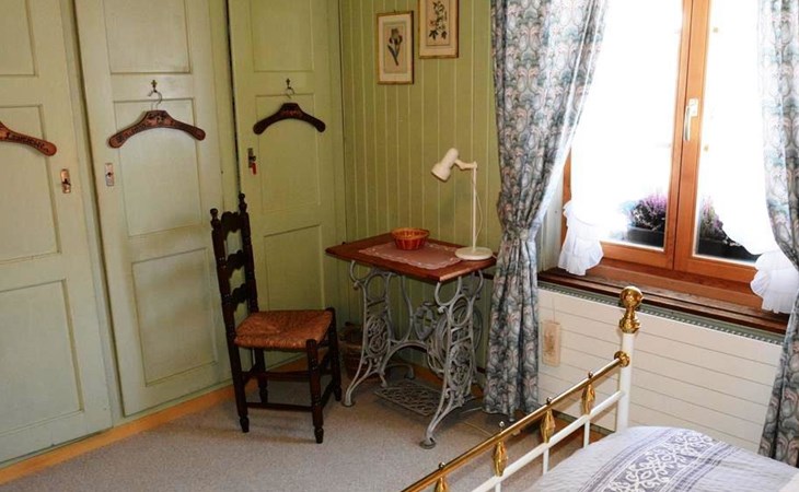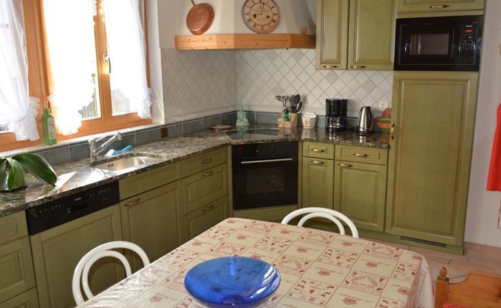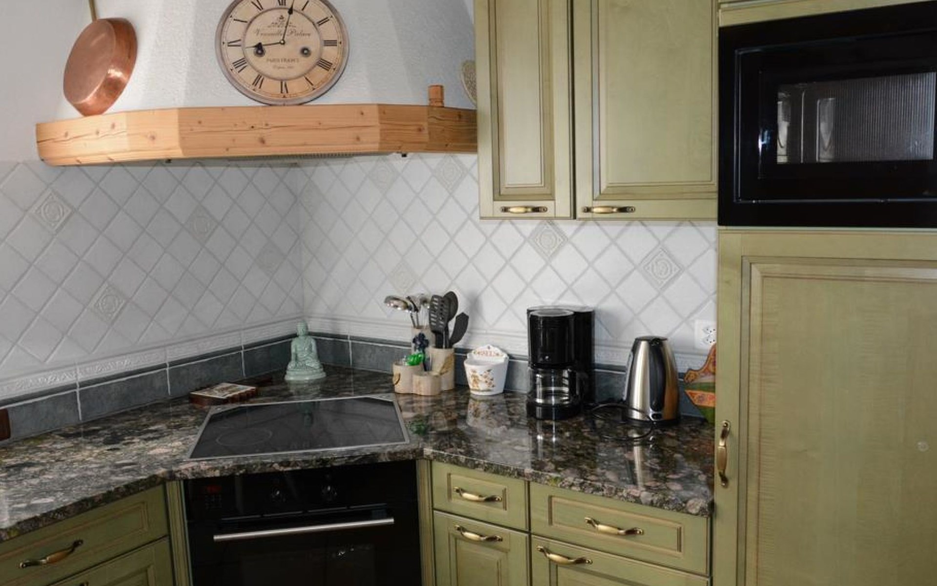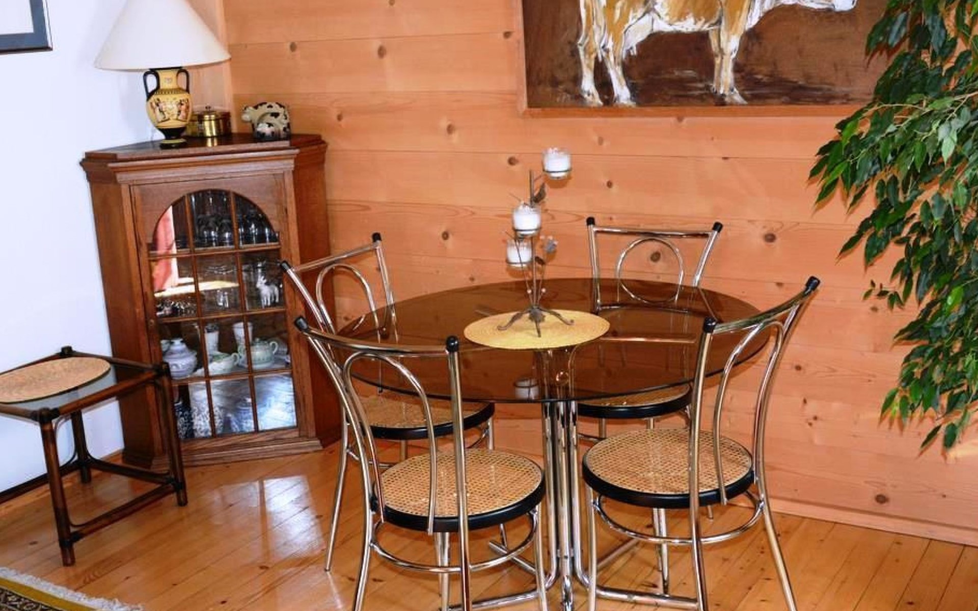 A simply furnished double bedroom (180x200cm) with cupboard, a simple bedroom with 2 beds (90x200cm each). Large rustic furnished living room with couch, radio/TV/video recorder and table with chairs. Separate kitchen equipped with ceramic stove, dishwasher, oven, refrigerator with freezer, coffee machine, fondue-raclette set (up on request) and dining table. Bathroom with bathtub and toilet. Non-smoking apartment! Baby cot (70x120cm) incl. bed linen available.