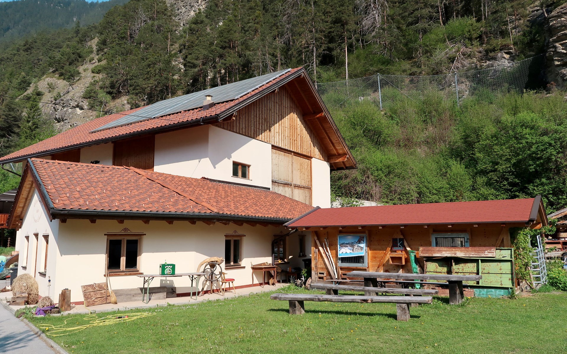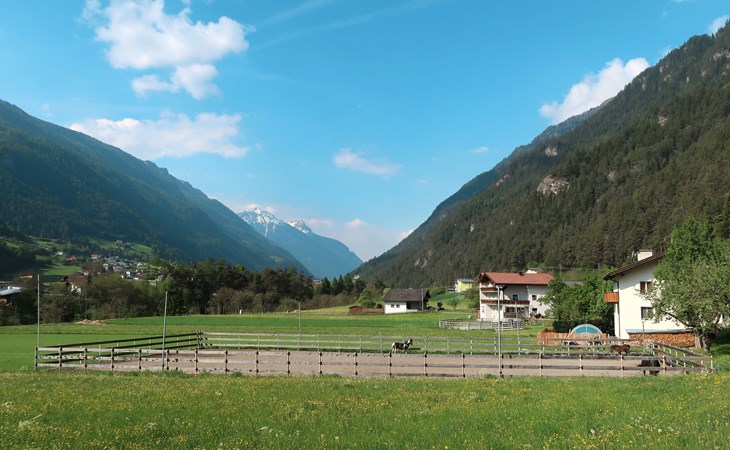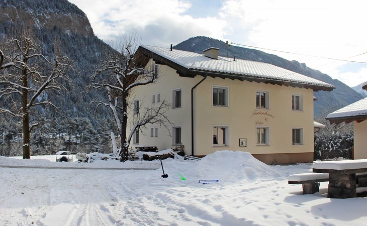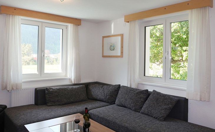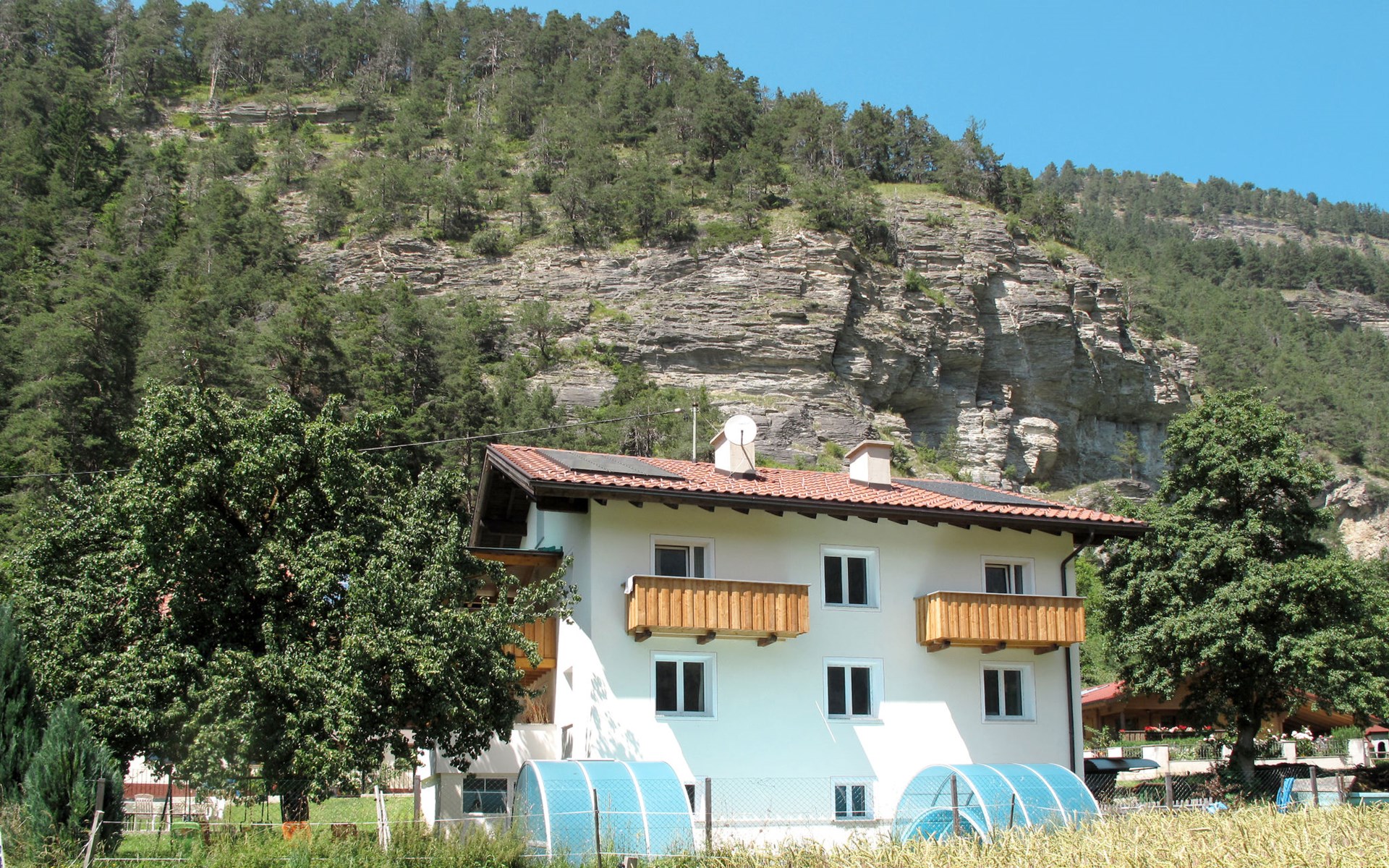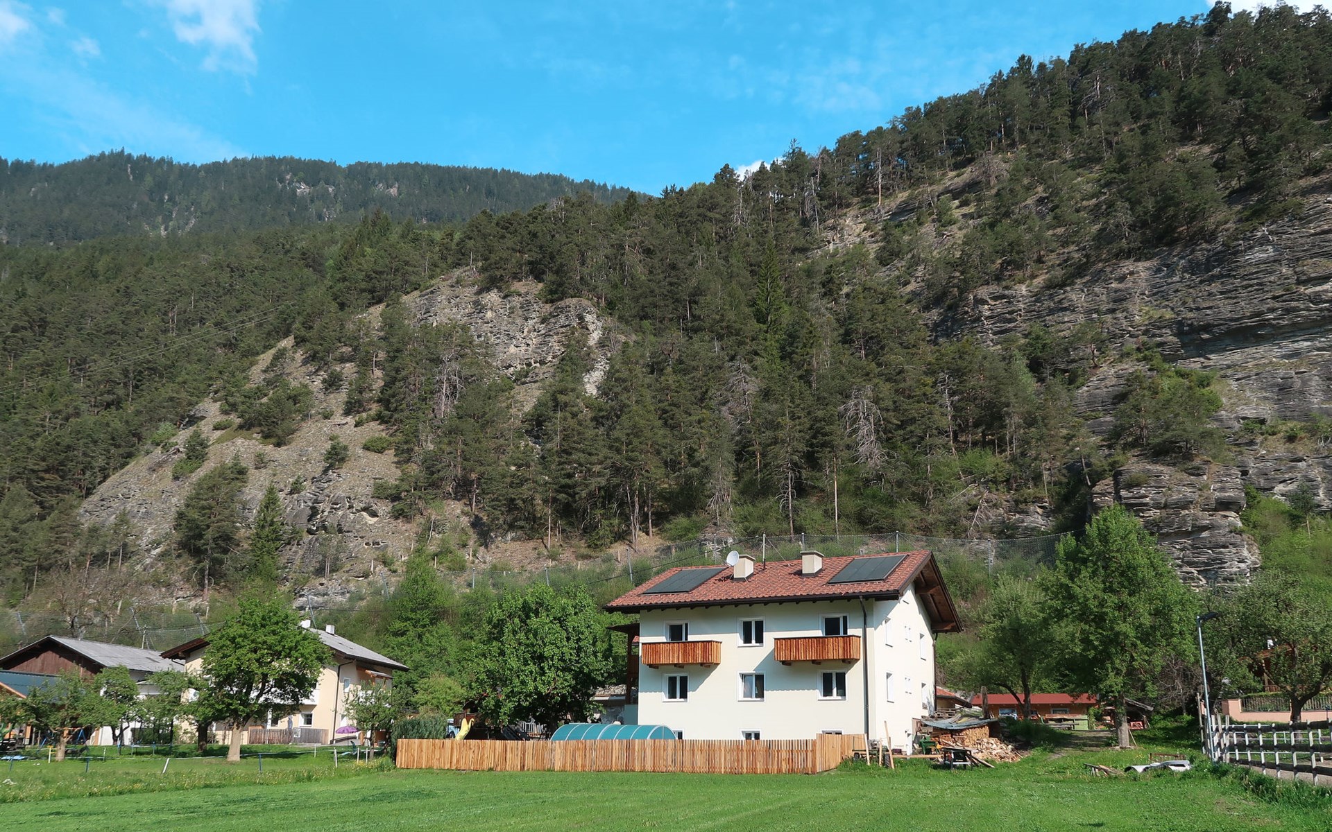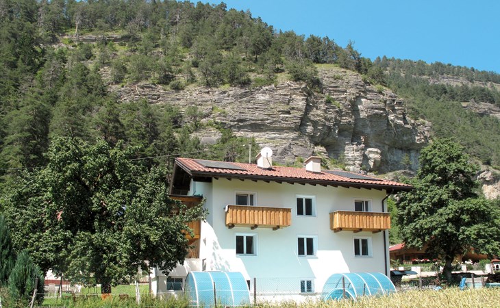 Tösens 7 km from Ried: Single-family house "Aster", 900 m a.s.l., 2 storeys, detached, surrounded by meadows and fields. In the hamlet Untertösens 1 km from the centre of Tösens, 7 km from the centre of Ried, 23 km from the centre of Landeck, 7 km from the lake, 7 km from the skiing area, in a cul-de-sac. Private: property (fenced), garden with trees, meadow, swimming pool heated (30 m2, seasonal availability: 01.May. - 15.Sep.). Children's playground. Bread roll service possible. Stepped path to the house. Parking (for 6 cars) on the premises. E-charging station. Shop 1 km, supermarket 8 km, bus stop 1 km, railway station "Landeck" 23 km, outdoor swimming pool 8 km, indoor swimming pool 22 km, bathing lake "Ried" 7 km. Golf course (9 hole) 44 km, walking paths from the house, cycle lane 50 m, mountain railway 7 km, ski lift 7 km, slopes 7 km, ski school 7 km. Well-known ski regions can easily be reached: Fendels 7 km, Fiss-Serfaus-Ladis 13 km, Nauders, Samnaun (Silvretta Skiarena) 25 km. Well-known lakes can easily be reached: Reschensee 35 km. Local sale of farm products. Please note: the owner lives on the same property. Owner uses some rooms in the house. Animals in the neighbourhood.