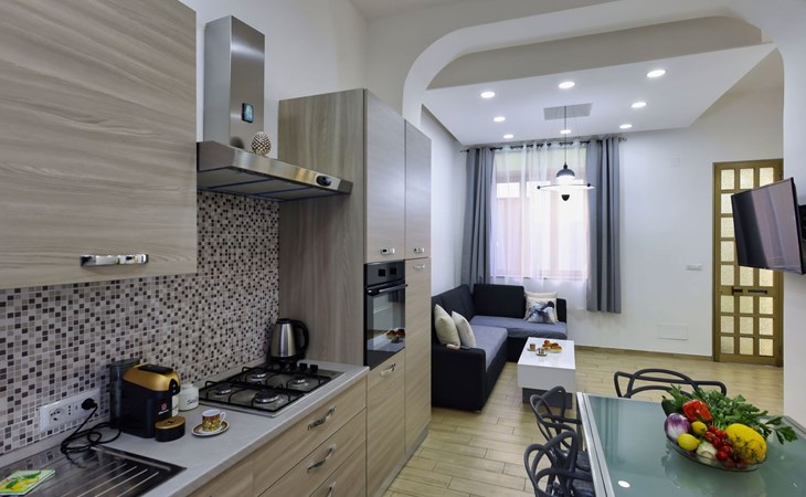 The kitchen is fully equipped, perfect for preparing meals on your own. There is also a private terrace with views of the city and the characteristic surrounding neighbourhood, ideal for an al fresco breakfast or to relax at the end of the day.