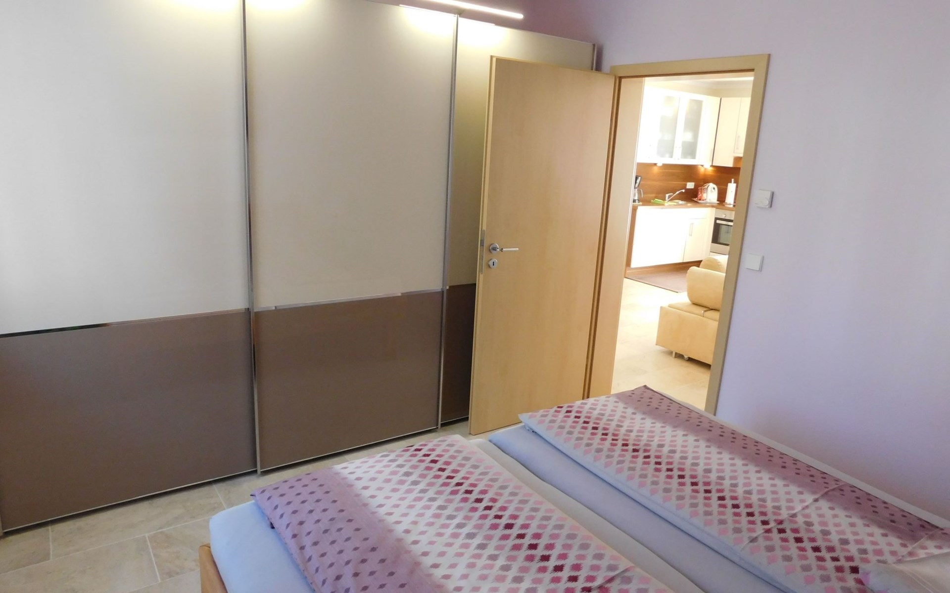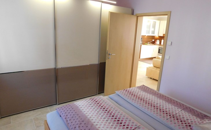 Spacious ground floor - garden holiday flat 63 m² with very quiet bedroom, raised double bed and a large, stylish sliding door wardrobe.