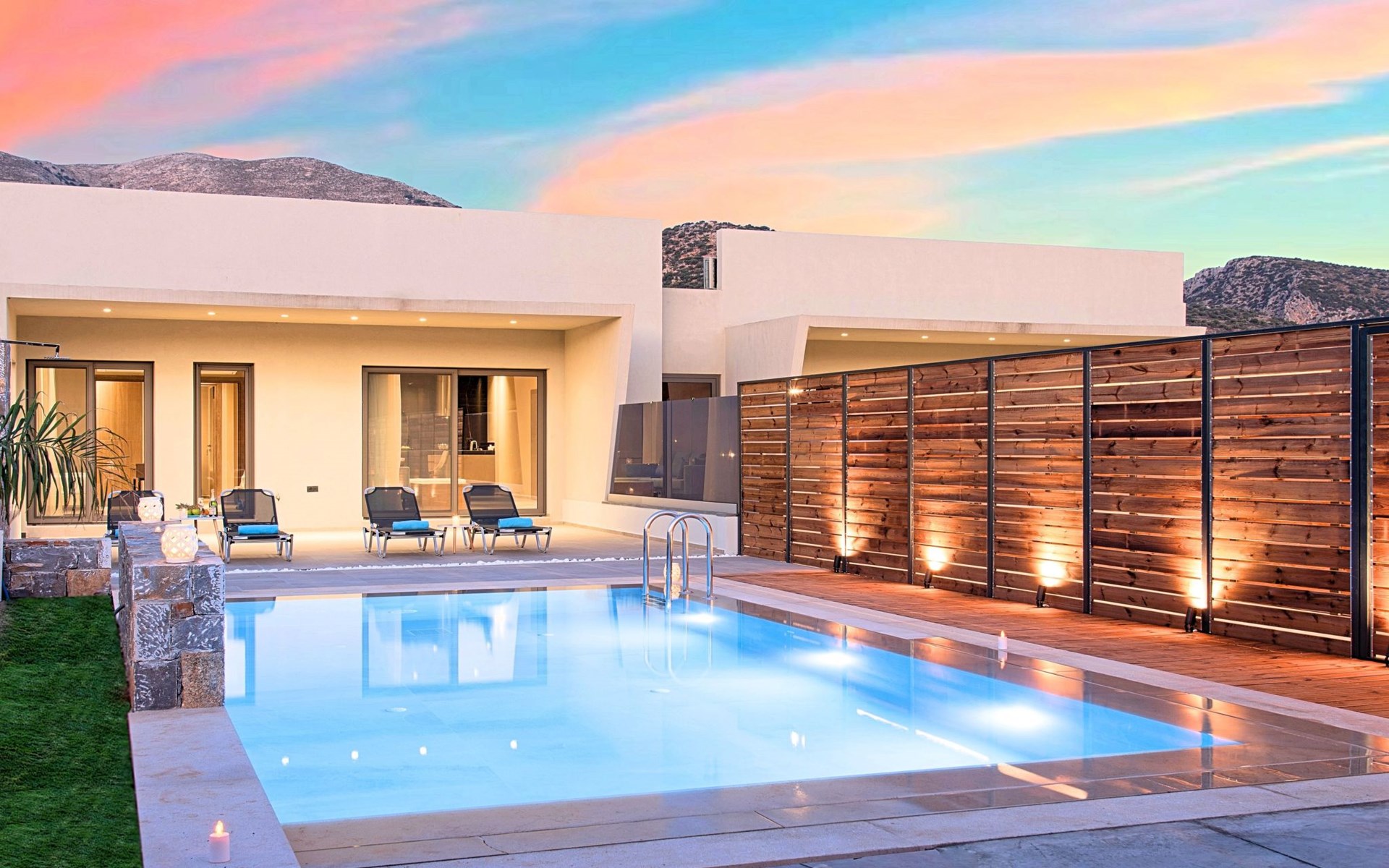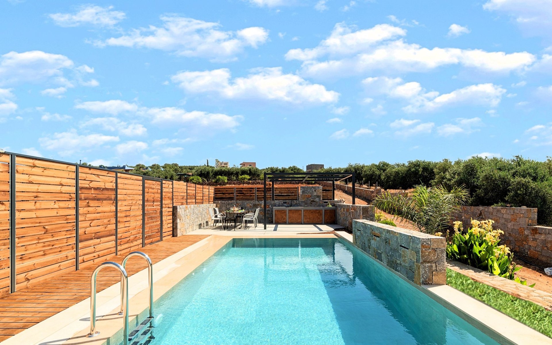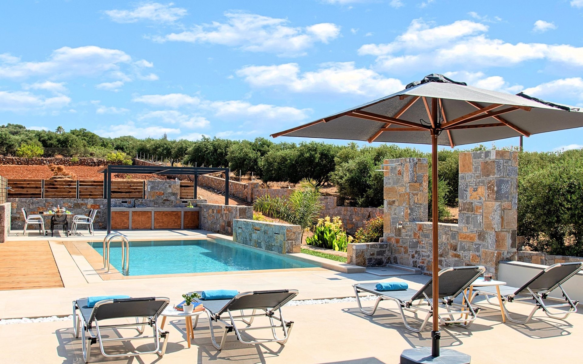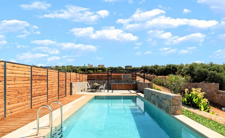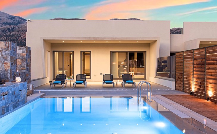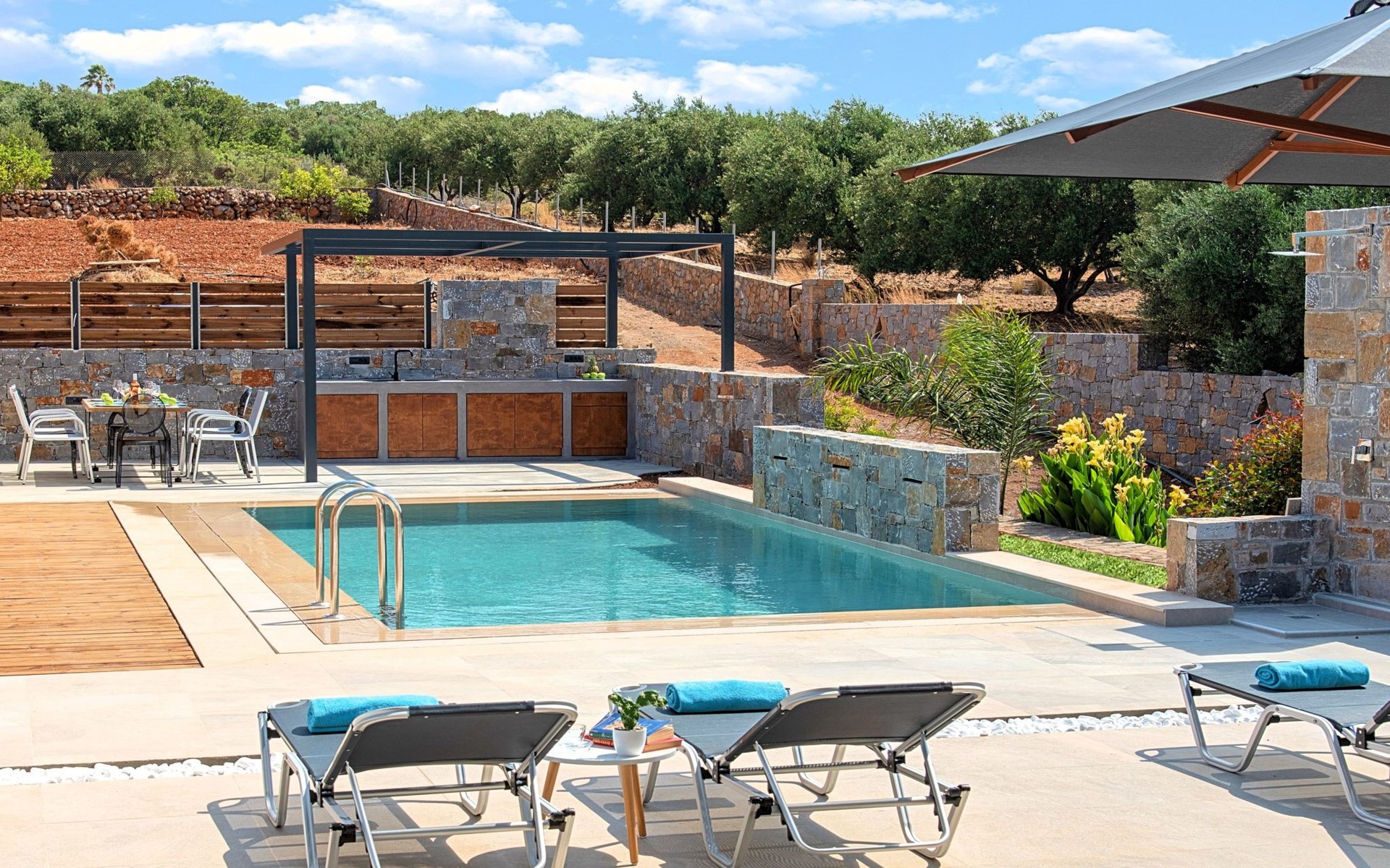 Ground floor● A bedroom with two single pushed together beds and private bathroom.● A bedroom with two single pushed together beds and private bathroom Upper floor● A living room with a large corner sofa (can accommodate two beds) and direct access to the terrace and the pool area.● Smart TV at the living room● Large Kitchen / dining area with an oven, a fridge, a coffee maker, tea facilities, a juicer, a toaster and a dish set.● A bedroom with a queen-size double bed. ● A second bedroom with two single beds pushed together. ● A large bathroom with shower.● Washing machine / Dryer● Large terrace overlooking the swimming pool● Air-conditioning in all areas.● Free WiFi internet access.● Outdoor dining set (table with chairs).● Iron and ironing board.● Safe deposit box.● Hair dryer.● Linen and towels.● Toiletries.● Swimming pool towels.● Baby cot.● High chair for children.● Towels and bed linen changed and cleaned every 3 or 4 days.● Private parking area.● Direct access to the swimming pool area.● Private swimming pool.● Sun lounge area with sun beds and umbrellas.● BBQ with cooking and dining area next to the swimming pool.Omega Sissi Lux Villa can accommodate up to 10 guests.Guests of Omega Sissi Lux Villa can also be provided with the following services, upon request and at extra cost:● Daily cleaning.● Daily linen and towel change.● Daily swimming pool cleaning.● Car rental service.● Transfer service.● Travel services.● Daily delivery of groceries.● Water sports.● Yacht cruises.● Babysitting.