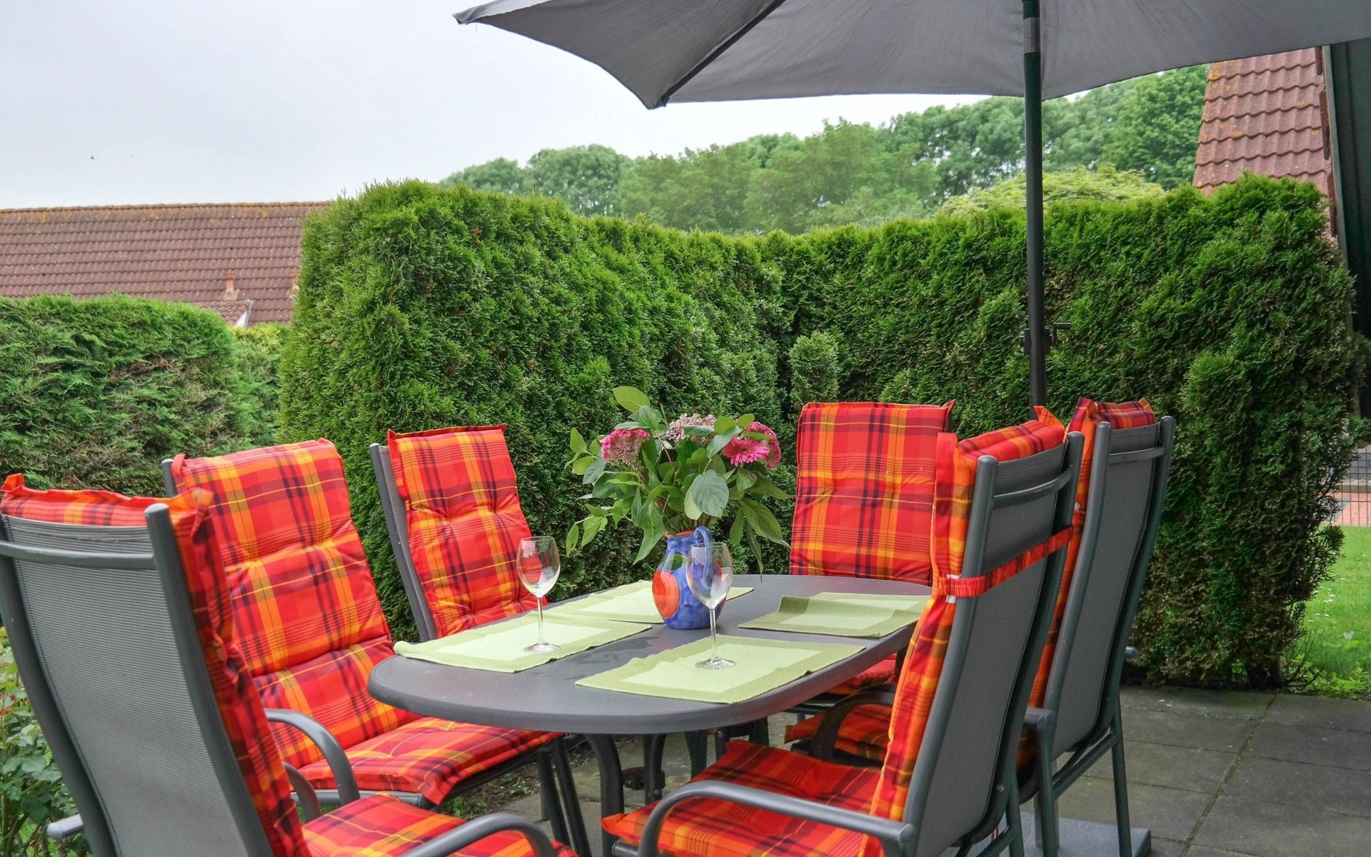 The house is furnished for up to 6 people. Upstairs in the house there are 2 bedrooms, one of which has a small balcony. Downstairs is the very cosy living room with integrated kitchen and access to the terrace, the third bedroom and the bathroom (shower over the bath) and a separate WC.