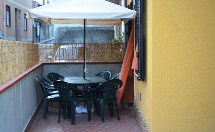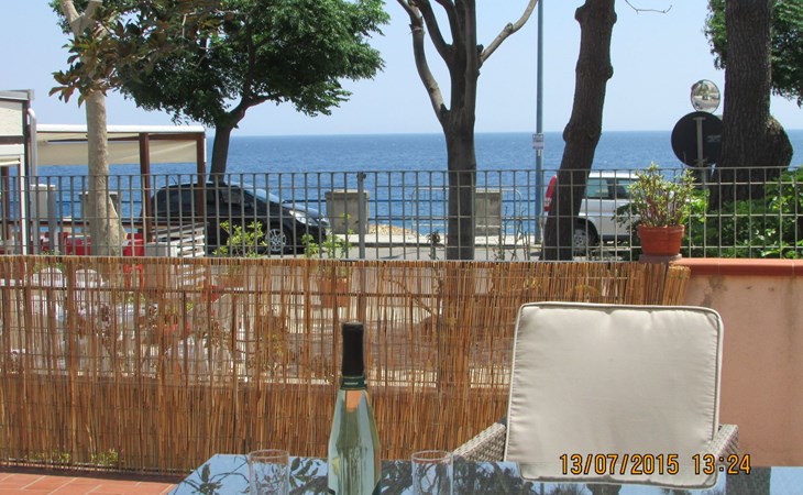 The small but lovely terrace offers guests a sea view and is furnished with a sun umbrella, table and chairs.