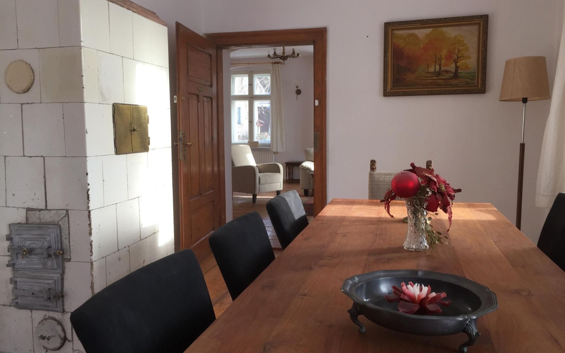 The interior of the house offers a warm welcome with inviting furnishings. On the ground floor, a fully equipped kitchen with everything you need to cook your own meals, bake cakes and organise drinks evenings. In the dining room there is a long table with 12 chairs where you can dine together. And in the authentic living room, you can watch your favourite programmes from the sofa on a huge TV screen or end the day together.