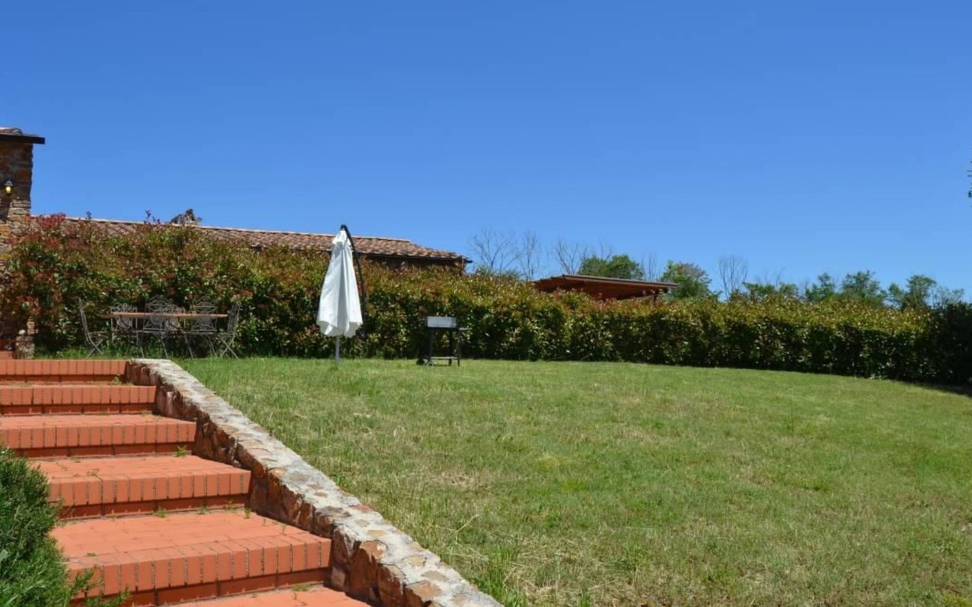 Private garden with a grill, table, chairs and sunshade, which invites you to enjoy convivial meals in the open air.
