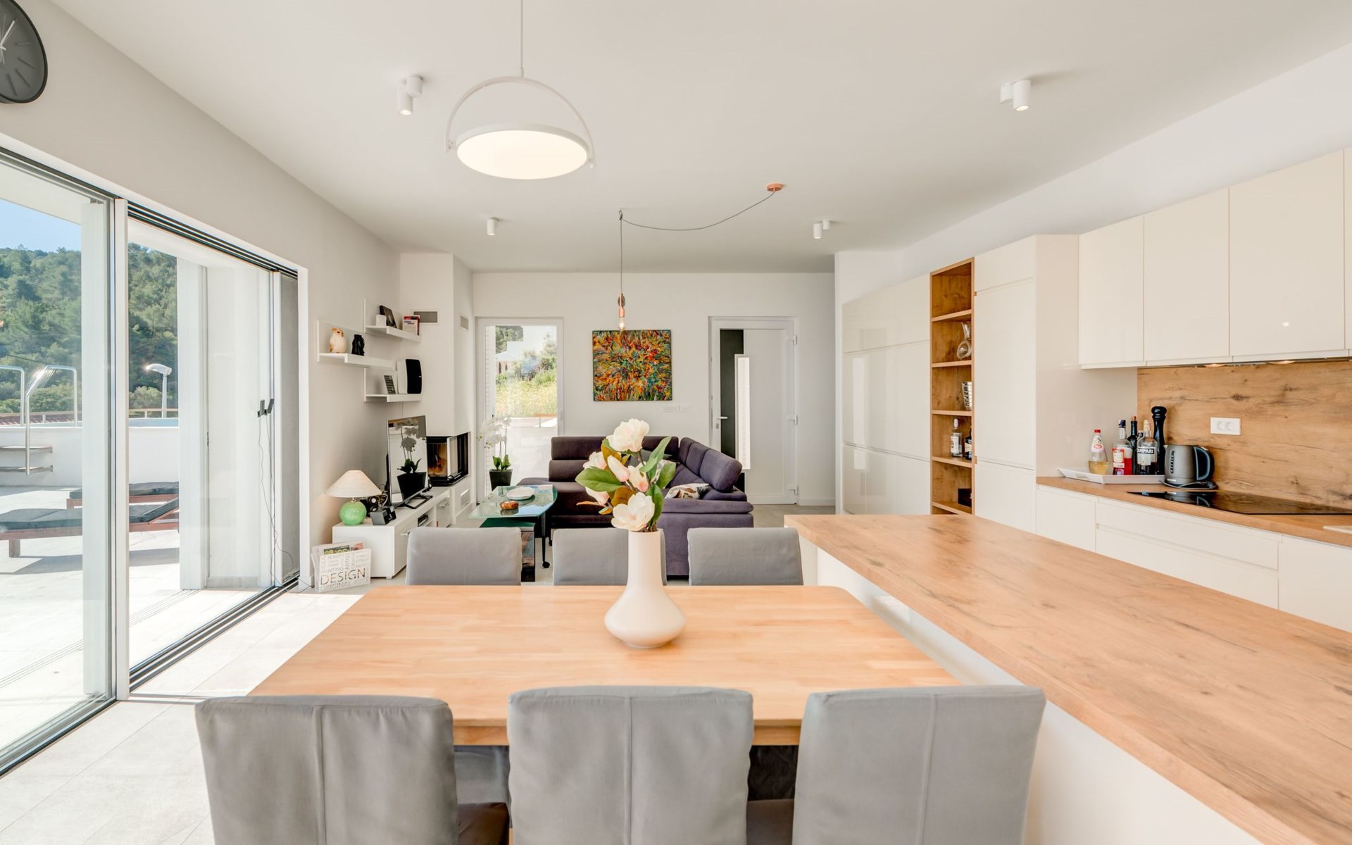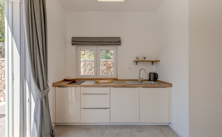 The kitchen, with its hardwood cabinetry and laminate flooring, is fully equipped for you to prepare delicious meals. Enjoy your meals on the balcony or terrace, surrounded by breathtaking views of azure skies and lush landscapes.