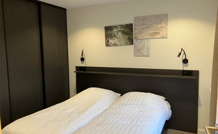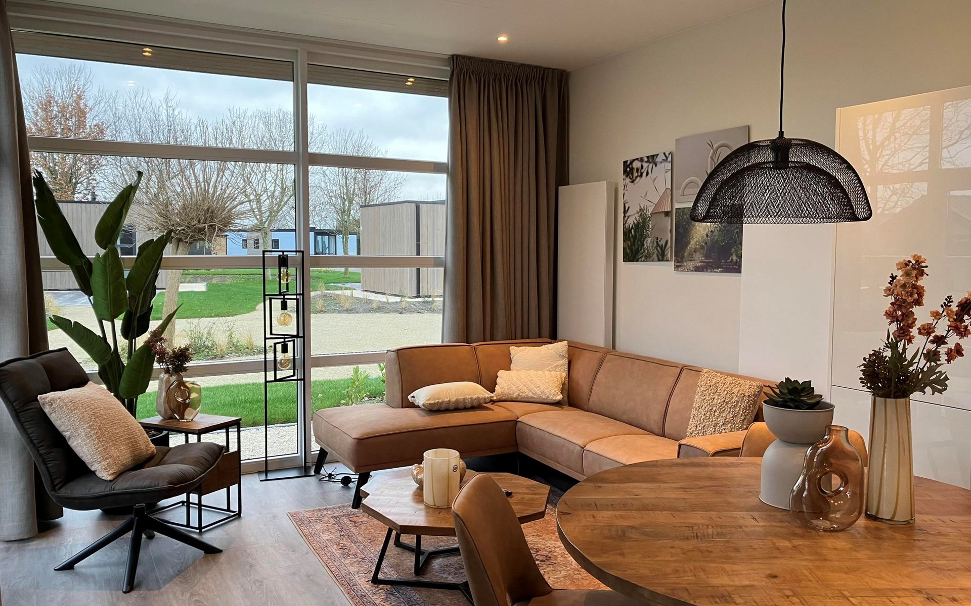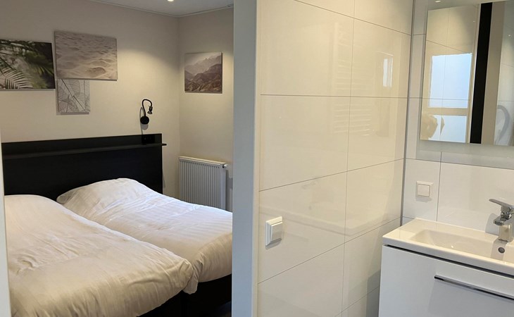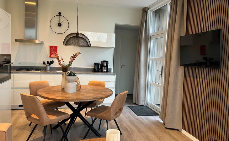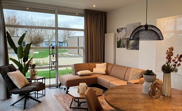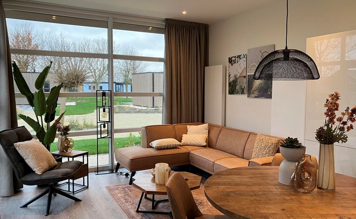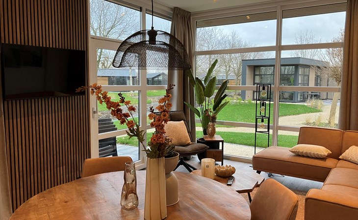 This single-storey, detached chalet can accommodate up to 4 people. The chalet's name says it all: the chalet is L-shaped. Thanks to the high windows and ceilings, this chalet has plenty of light and gives a feeling of space. In the living room you will find a lovely sitting area with television, dining area suitable for 4 and a modern open-plan kitchen. The kitchen is fully equipped, including an induction hob, combination microwave, oven, filter coffee maker, dishwasher and fridge-freezer. The chalet has 2 bedrooms, one bedroom has a double bed (with twin single box spring beds) and the other bedroom has 2 single beds. The bathroom is modern and includes a sink, toilet and walk-in shower. The master bedroom also has an ensuite bathroom. Furthermore, this chalet has a separate toilet. Outside you can enjoy the garden with terrace. You can park your car near the chalet.