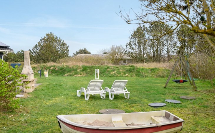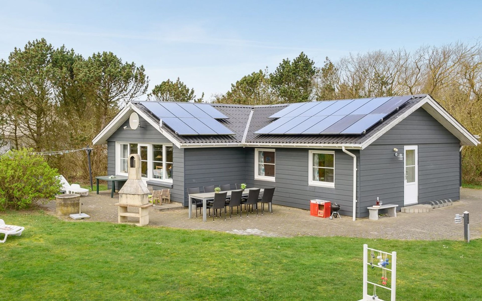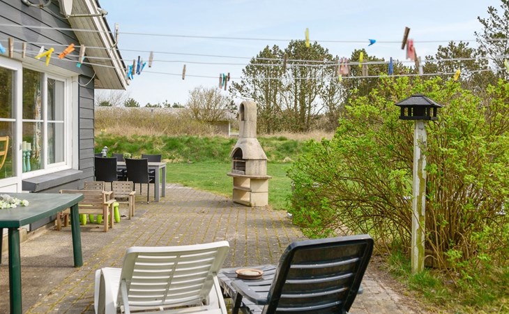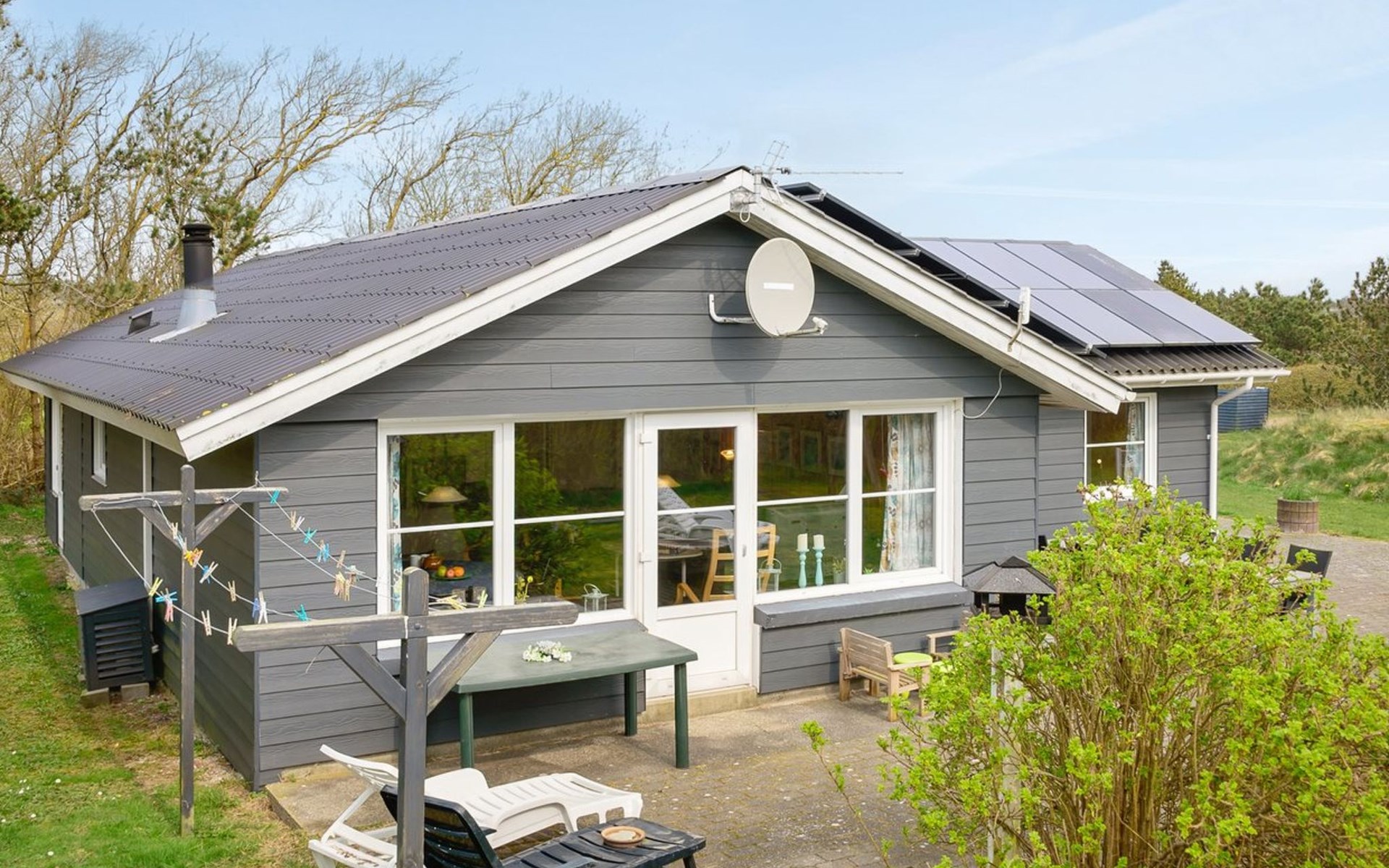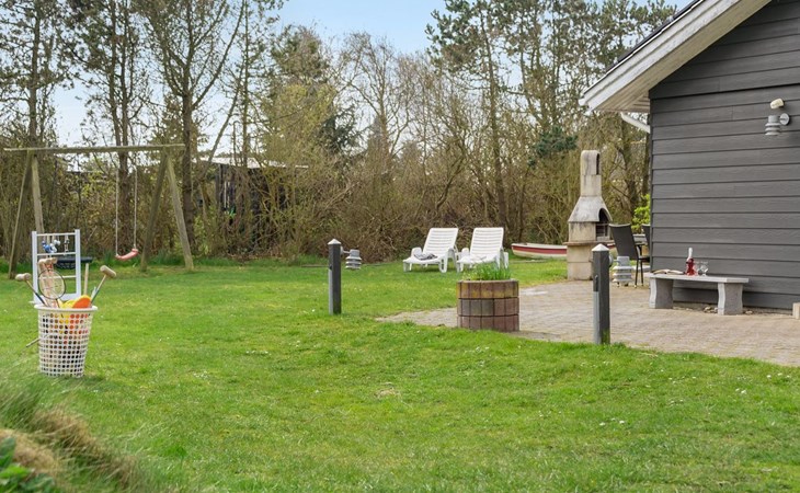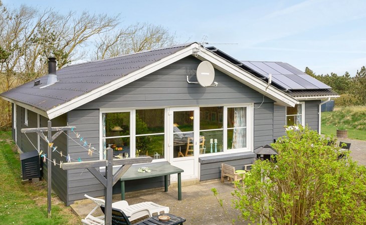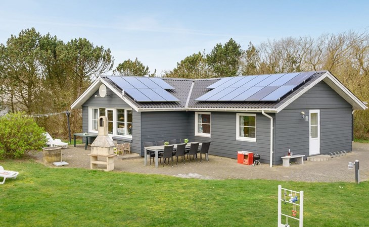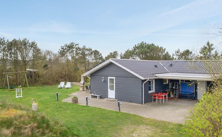Single-family house, built in 1995. 700 m from the sea. Private: natural state property 1'200 m2. Terrace (100 m2), fireplace, children's playground (swing). In the house: sauna, washing machine, tumble dryer. Parking at the house. Carport. Grocery 300 m. Golf course 20 km. The owner does not accept any youth groups.