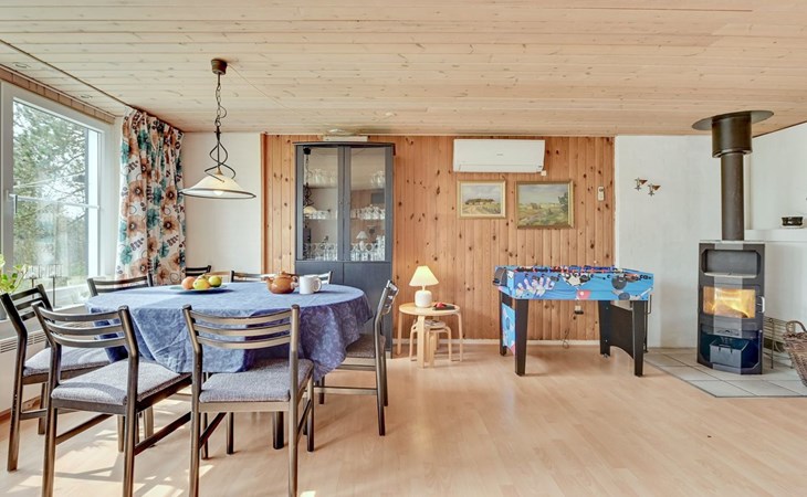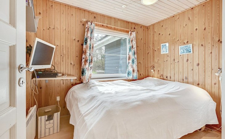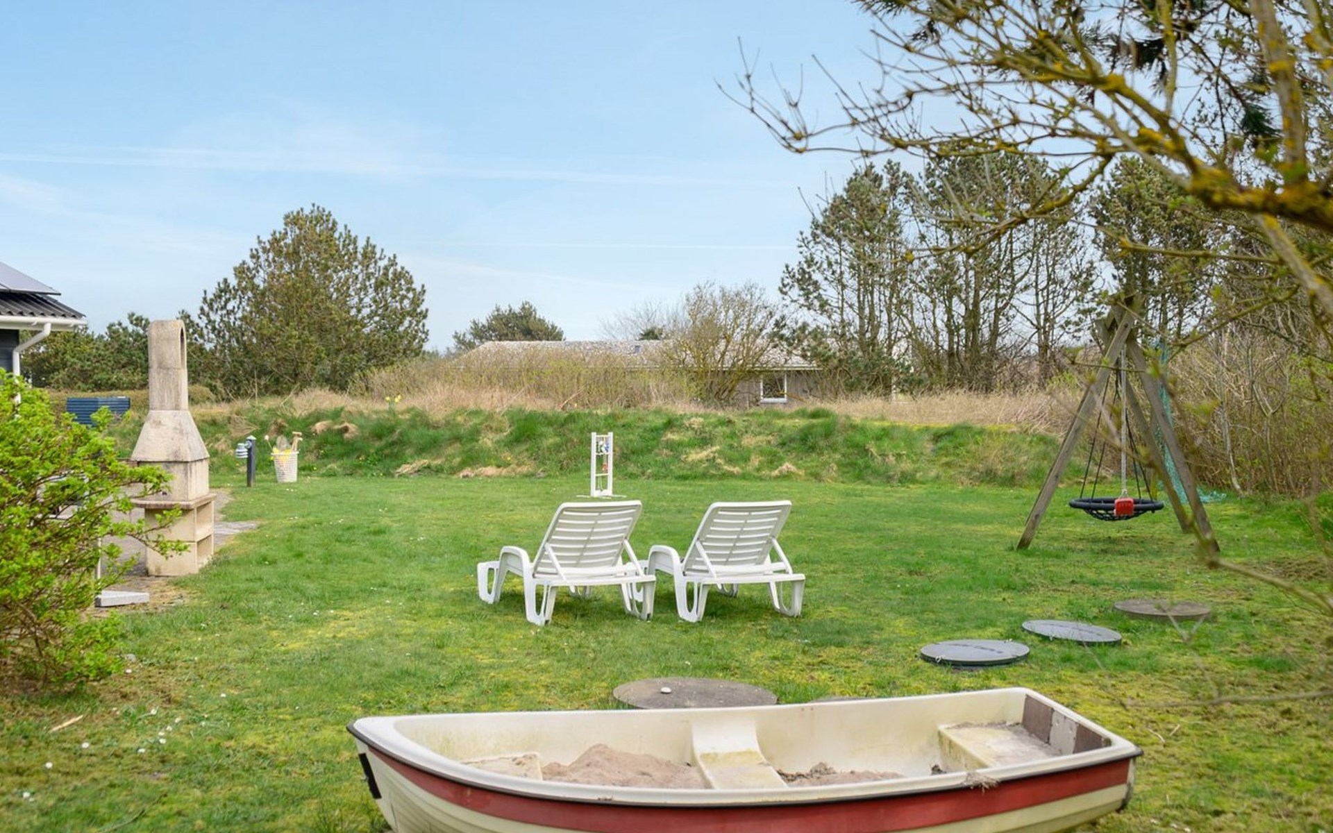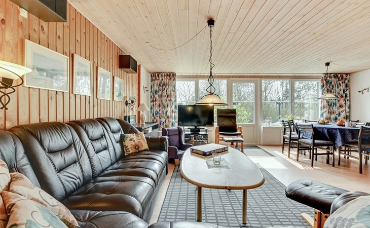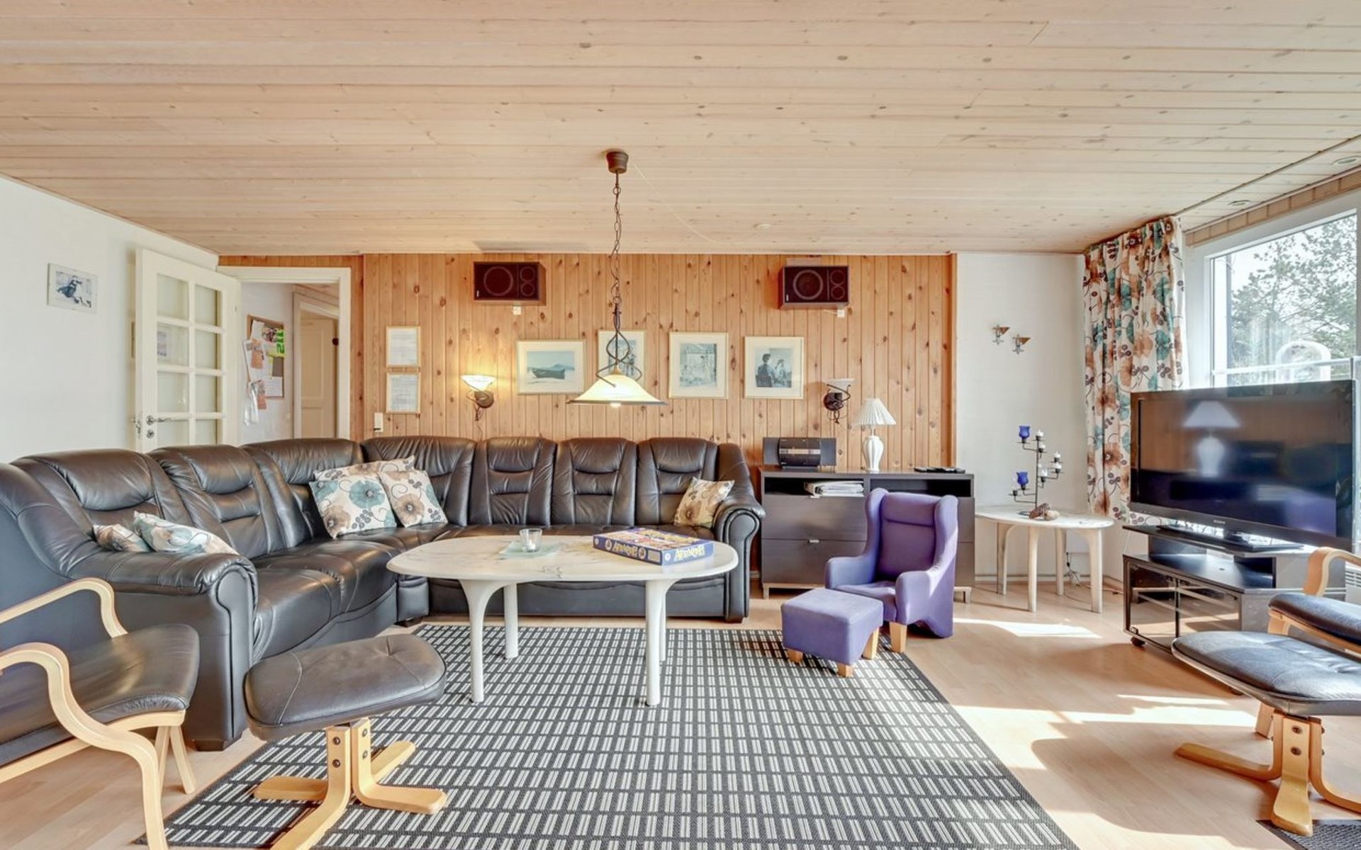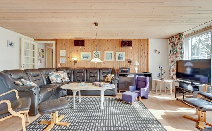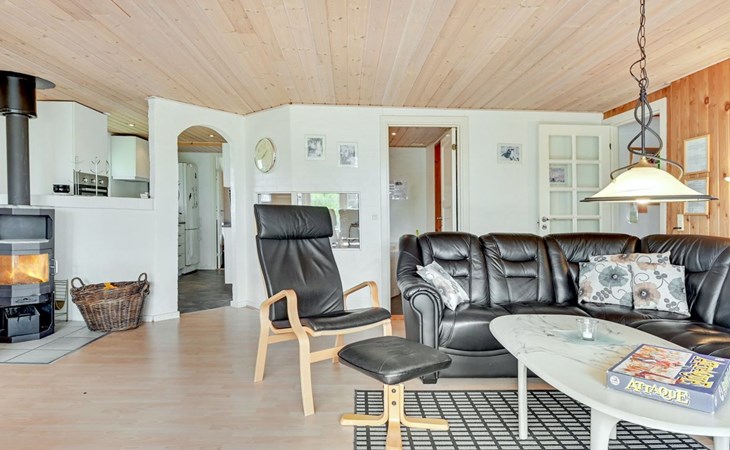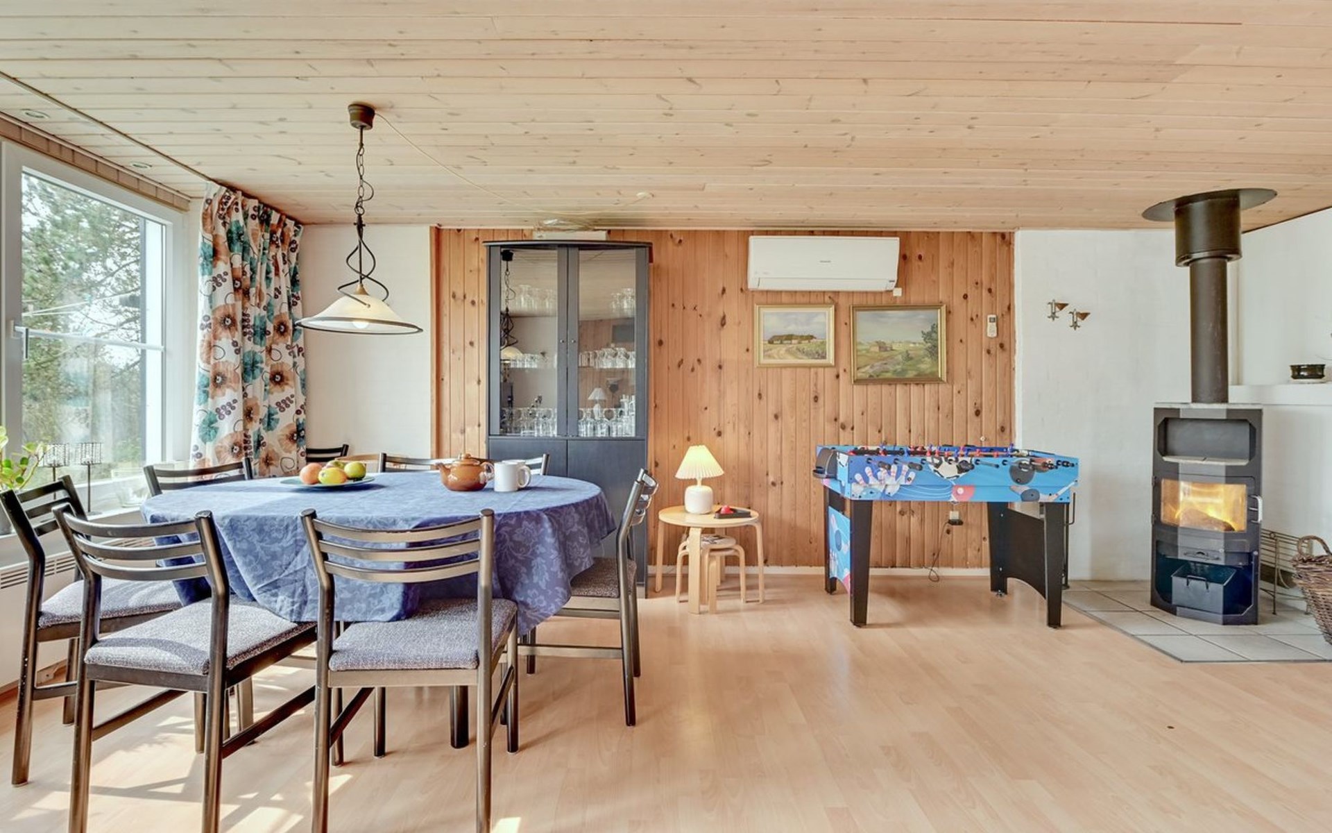 Single-family house, built in 1995. 700 m from the sea. Private: natural state property 1'200 m2. Terrace (100 m2), fireplace, children's playground (swing). In the house: sauna, washing machine, tumble dryer. Parking at the house. Carport. Grocery 300 m. Golf course 20 km. The owner does not accept any youth groups.