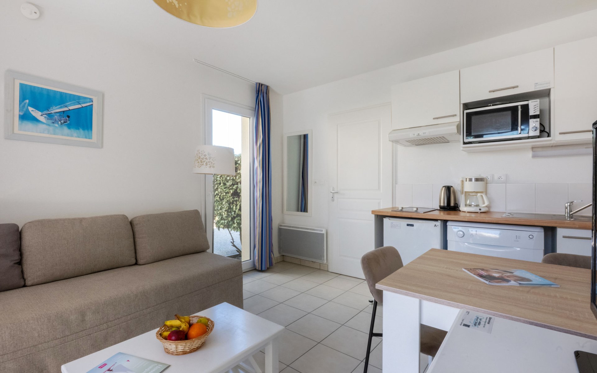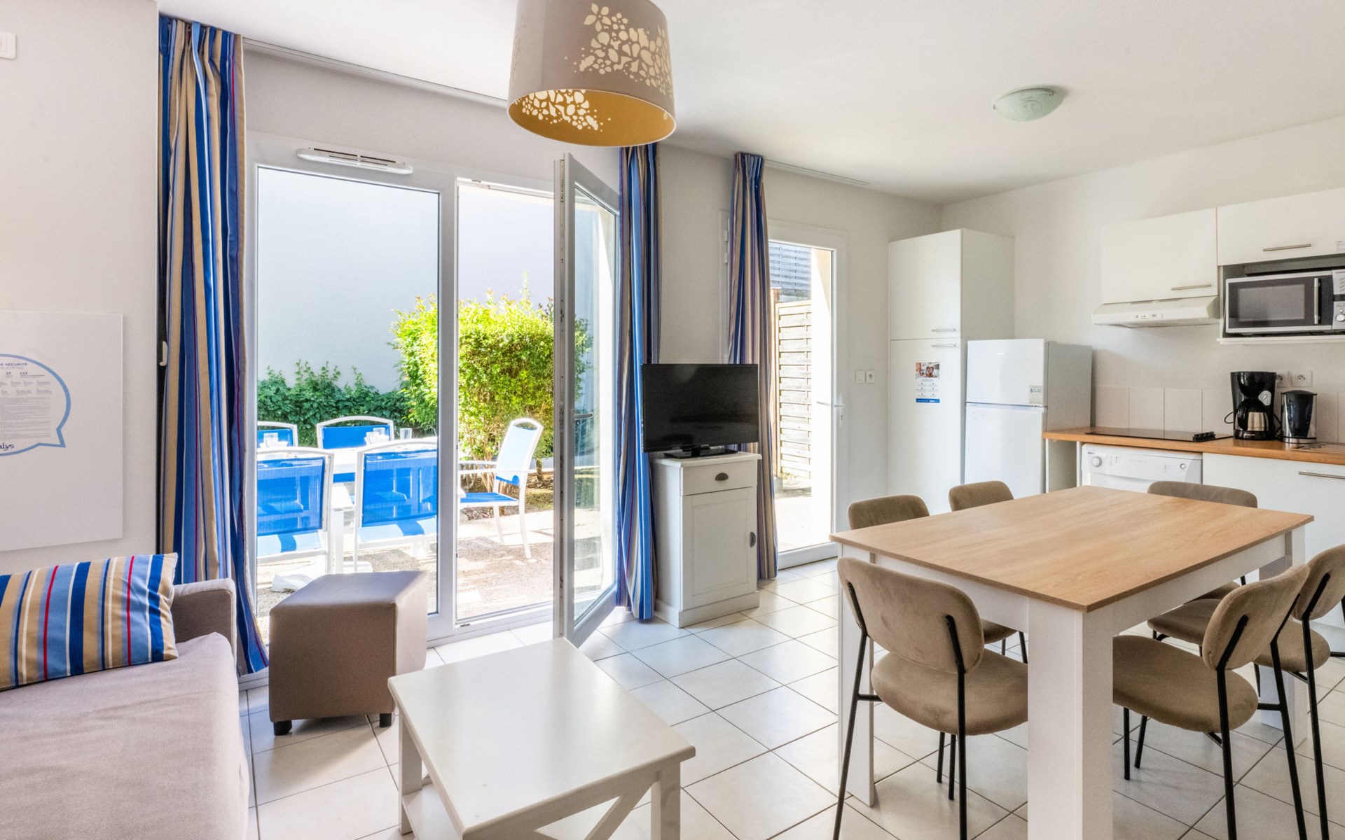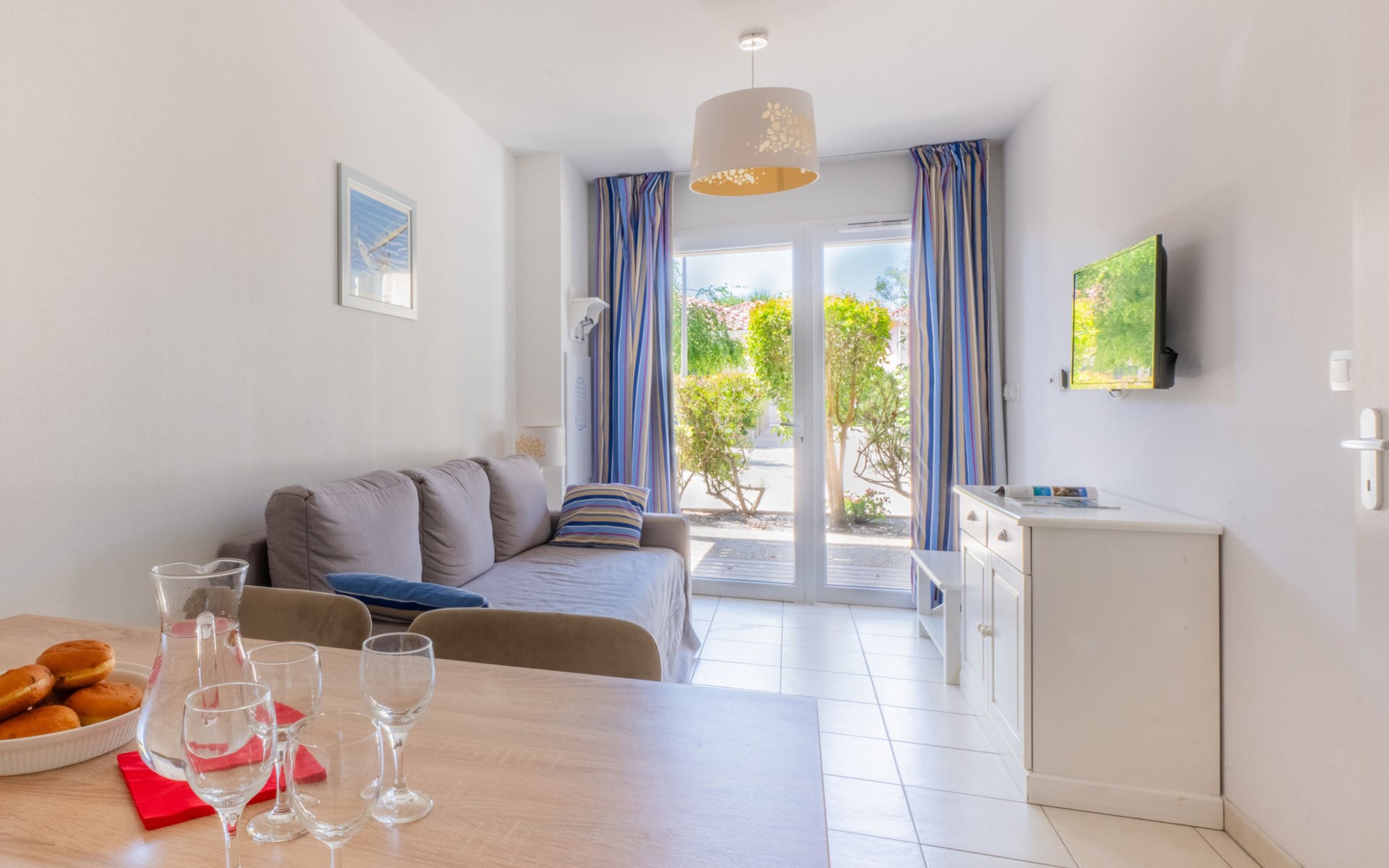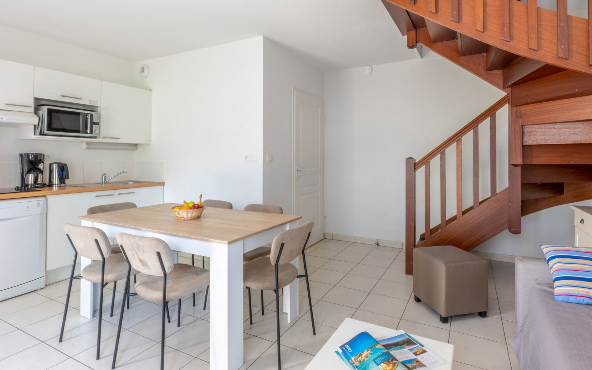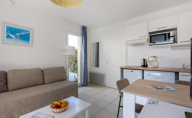 Resort "Le Petit Pont", 3 storeys. 79 apartments in the residence. In the district of Hourtin-Port 400 m from the centre of Hourtin-Port, 2.5 km from the centre of Hourtin, 65 km from the centre of Bordeaux, 12 km from the sea, 700 m from the lake, 12 km from the beach. For shared use: property (fenced) with lawn and trees, swimming pool heated, fenced (14 x 5 m, seasonal availability: 01.May. - 31.Sep.). Children's pool, table tennis, boccia, beach volleyball, children's playground. In the complex: reception, fitness room, steam room (extra). Storage room for bicycles, washing machine, tumble dryer (for shared use, extra). Parking on the premises. Shop 400 m, bus stop 3 km, sandy beach "Hourtin-Plage" 12 km, bathing lake "Lac d'Hourtin" 700 m. Please note: the photograph shows a typical example. The holiday properties may differ in living space, floorplan, equipment and furnishing.
