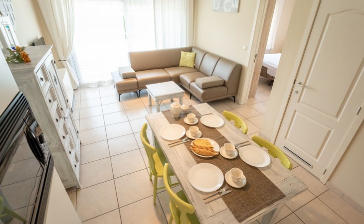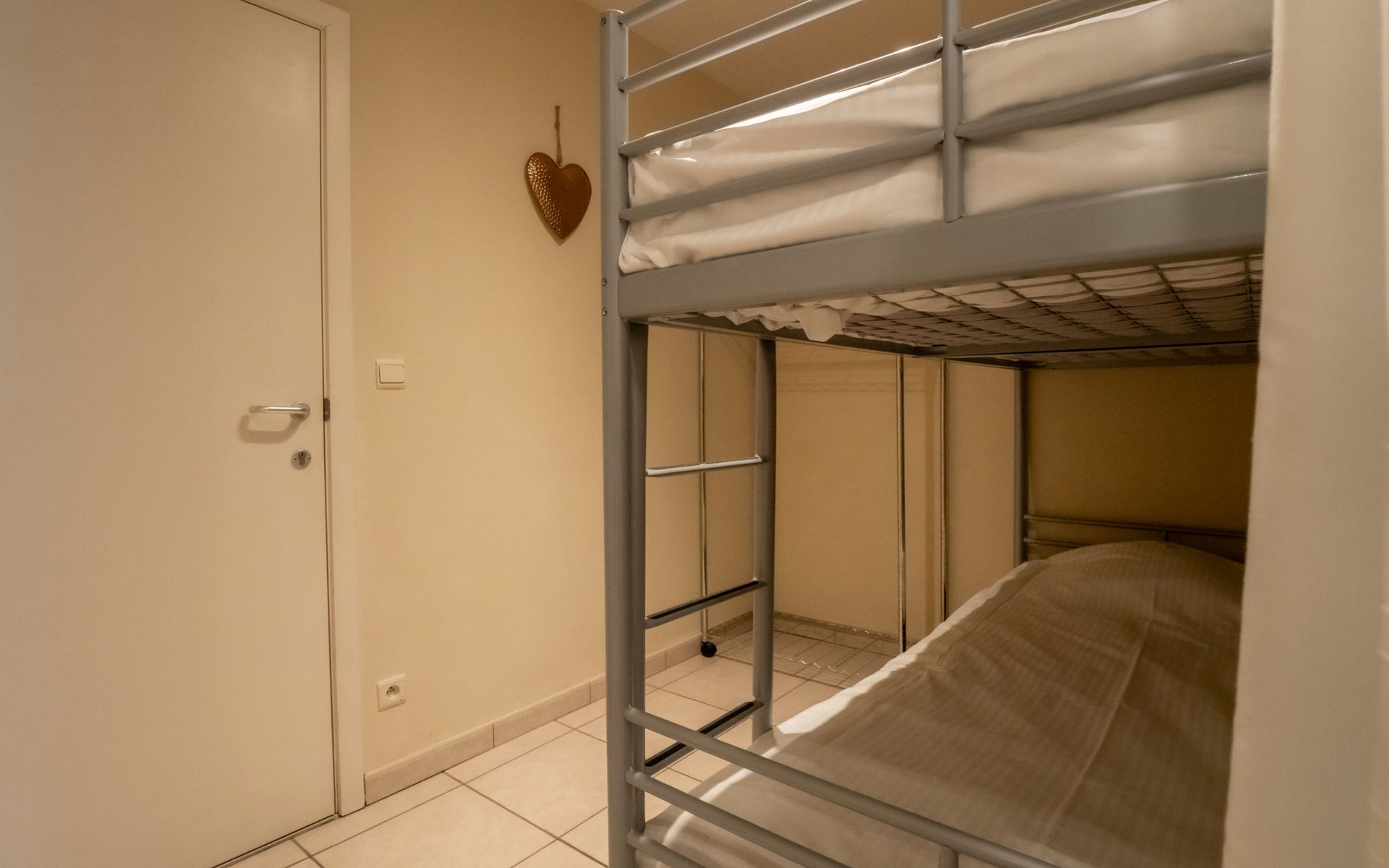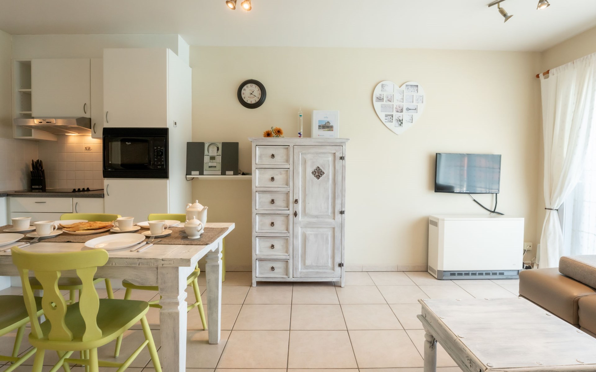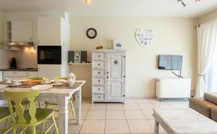 De Haan: Child friendly, modern holiday development "Green Garden", 2 storeys. 750 m from the centre of De Haan, 1.3 km from the sea, 1.3 km from the beach. For shared use: beautiful garden to relax, pond, swimming pool (20 x 10 m, seasonal availability: 16.Jun. - 15.Sep. pool opening hours: 08:00-20:00). Boccia. In the house: lift. Linen change (suppl. charge extra). Towel change (suppl. charge extra). Public parking on the road. Supermarket 700 m, restaurant 500 m, bakery 700 m, bicycle rental 1.5 km, tram "De Haan aan Zee" 700 m, bus stop "De Haan aan Zee" 700 m, railway station "Oostende" 12 km, sandy beach "De Haan" 1 km, park "La Potinière" 1 km. Golf course (18 hole) 1.4 km, surf school 2 km, sailing school 2 km, tennis 1 km, indoor tennis centre 2 km, minigolf 1 km, riding stable 3 km, sports centre 2 km. Nearby attractions: Oostende 10 km, Sea Life 12 km, Brugge 20 km, Plopsaland De Panne 52 km. Please note: suitable for families. The owner does not accept any youth groups. Loading and unloading of baggage is possible at the holiday house. The apartment is located in a zone with limited traffic. Neighbourhood highly sensitive to noise. Quietness and good behaviour expected.