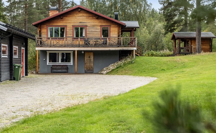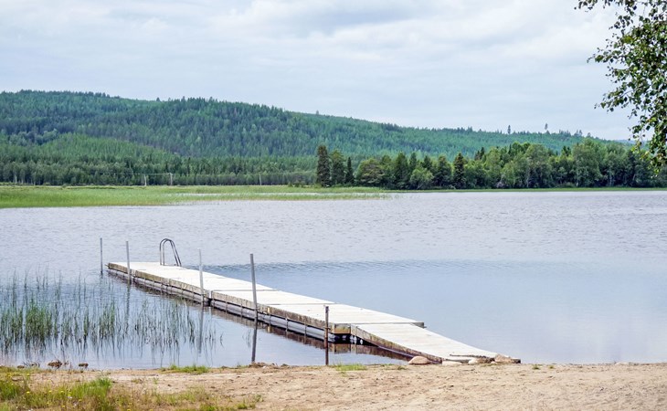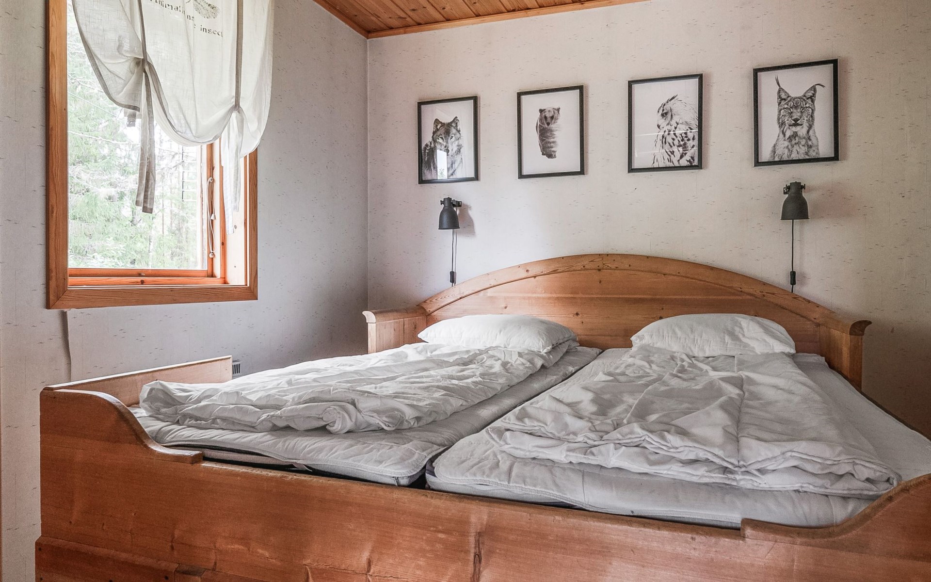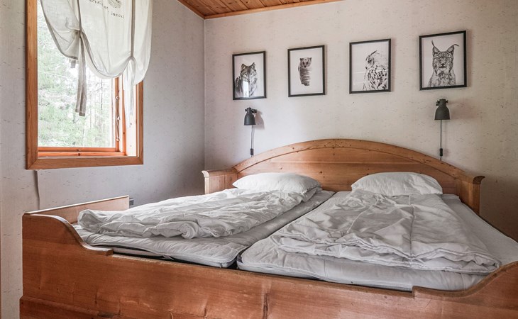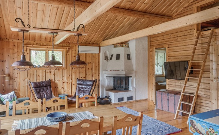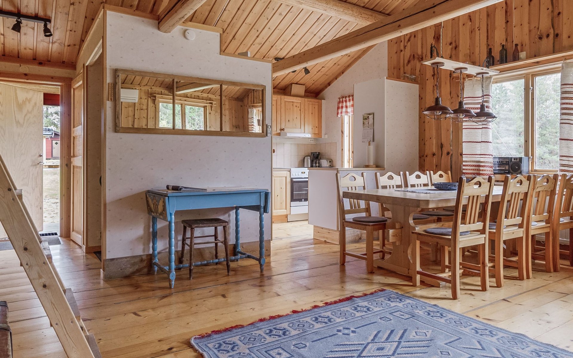 Timber house "Kvisthån Tallen", 390 m a.s.l.. In the hamlet Vemhån, 6 km from the centre, 14 km from the centre of Vemdalen, 45 km from the centre of Sveg, on a slope, 6 km from the lake, 300 m from the river. Private: natural state property 1'000 m2 with trees, meadow. Garden furniture, barbecue. Stepped path (5 steps) to the house. Parking (for 3 cars) on the premises. Shop 6 km, supermarket 45 km, railway station "Sveg" 45 km, ferry "Helsingborg" 840 km, sandy beach "Håsjön" 6 km, indoor swimming pool 45 km.