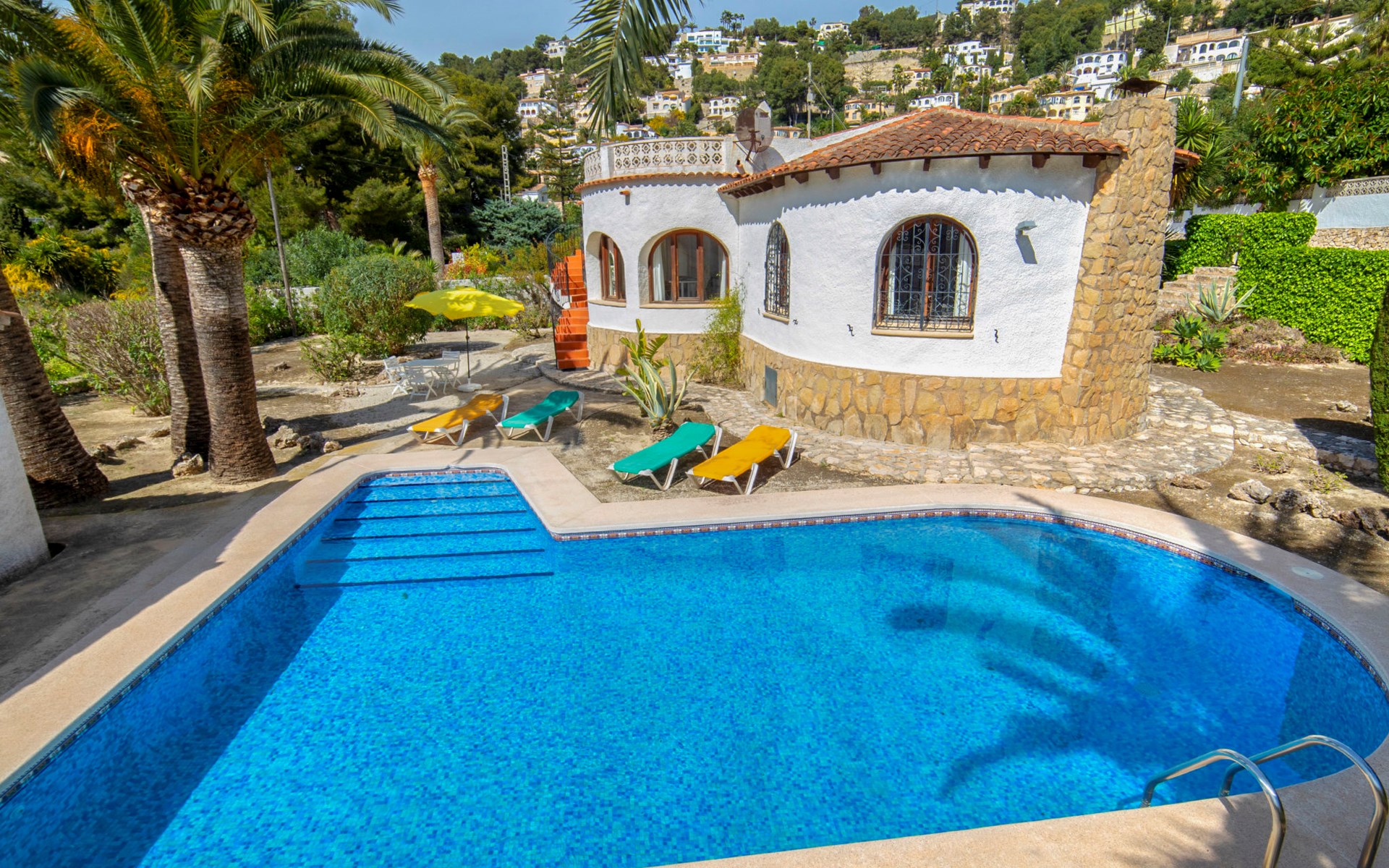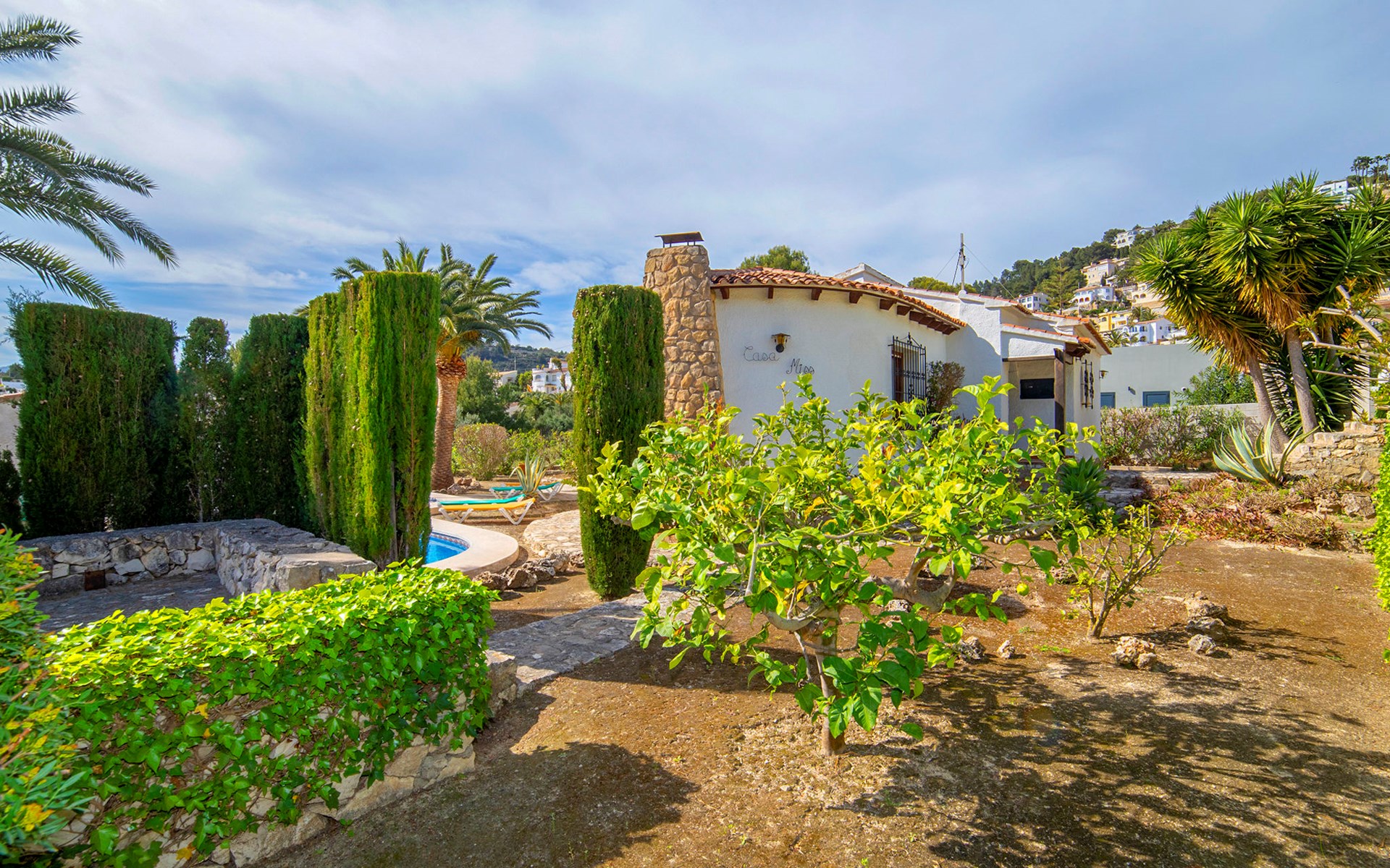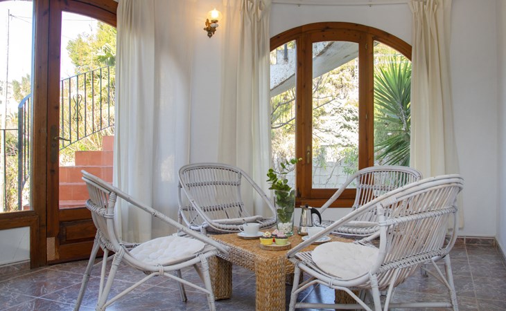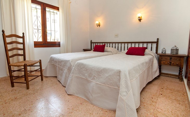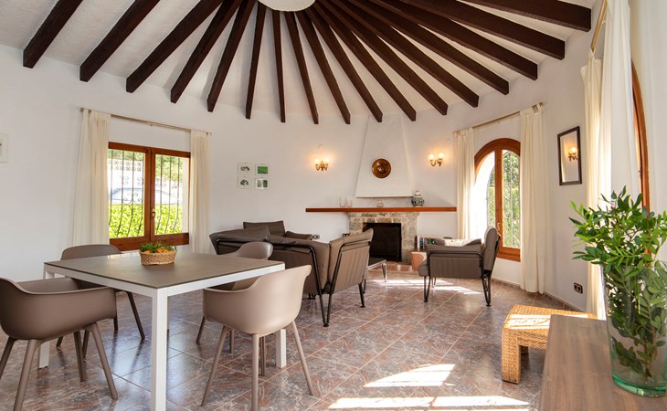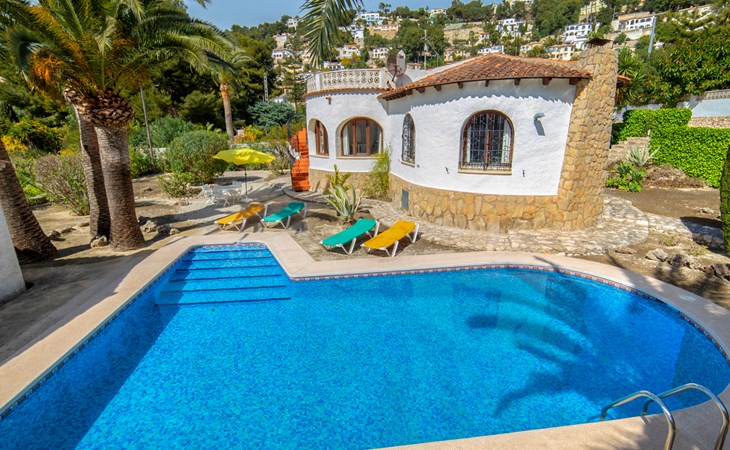 Benissa Costa: Single-family house "Miss". 5.5 km from the centre of Moraira, 11.4 km from the centre of Calpe, in the district Montemar, in a quiet, sunny position residential area (villas), 3 km from the sea. Private: property 876 m2, well-kept garden, swimming pool (4 x 8 m, depth 100 - 180 cm, seasonal availability: 01.Jan. - 31.Dec.). In the house: roof terrace. Parking at the house. Supermarket 2 km, restaurant 1.3 km, bar 1.3 km, bus stop 3 km, sandy beach 5.6 km, swimming bay 3 km. Nearby attractions: Aqualandia, Mundomar, Terra MÃtica, Terra Natura, y Benidorm Palace (Benidorm).