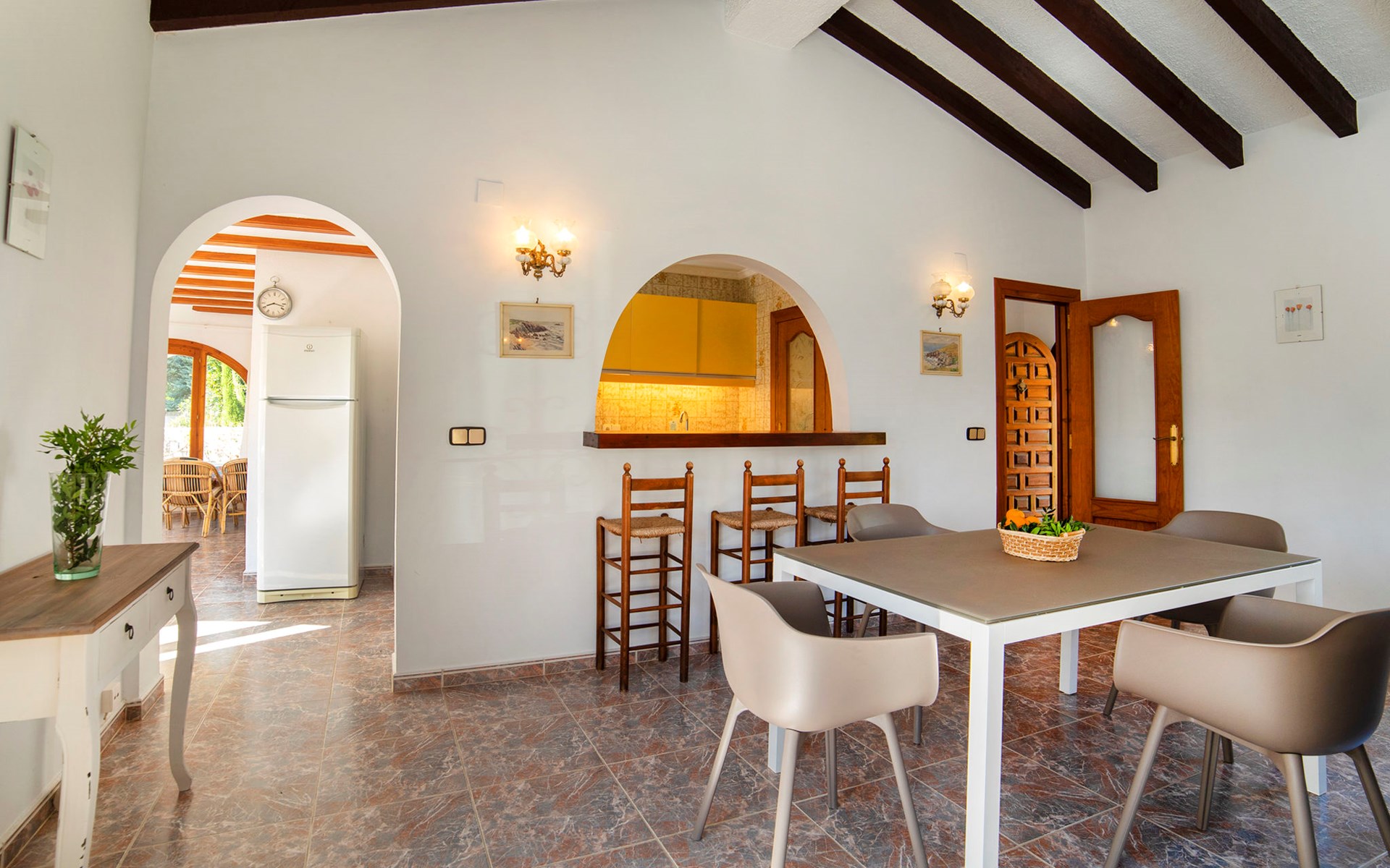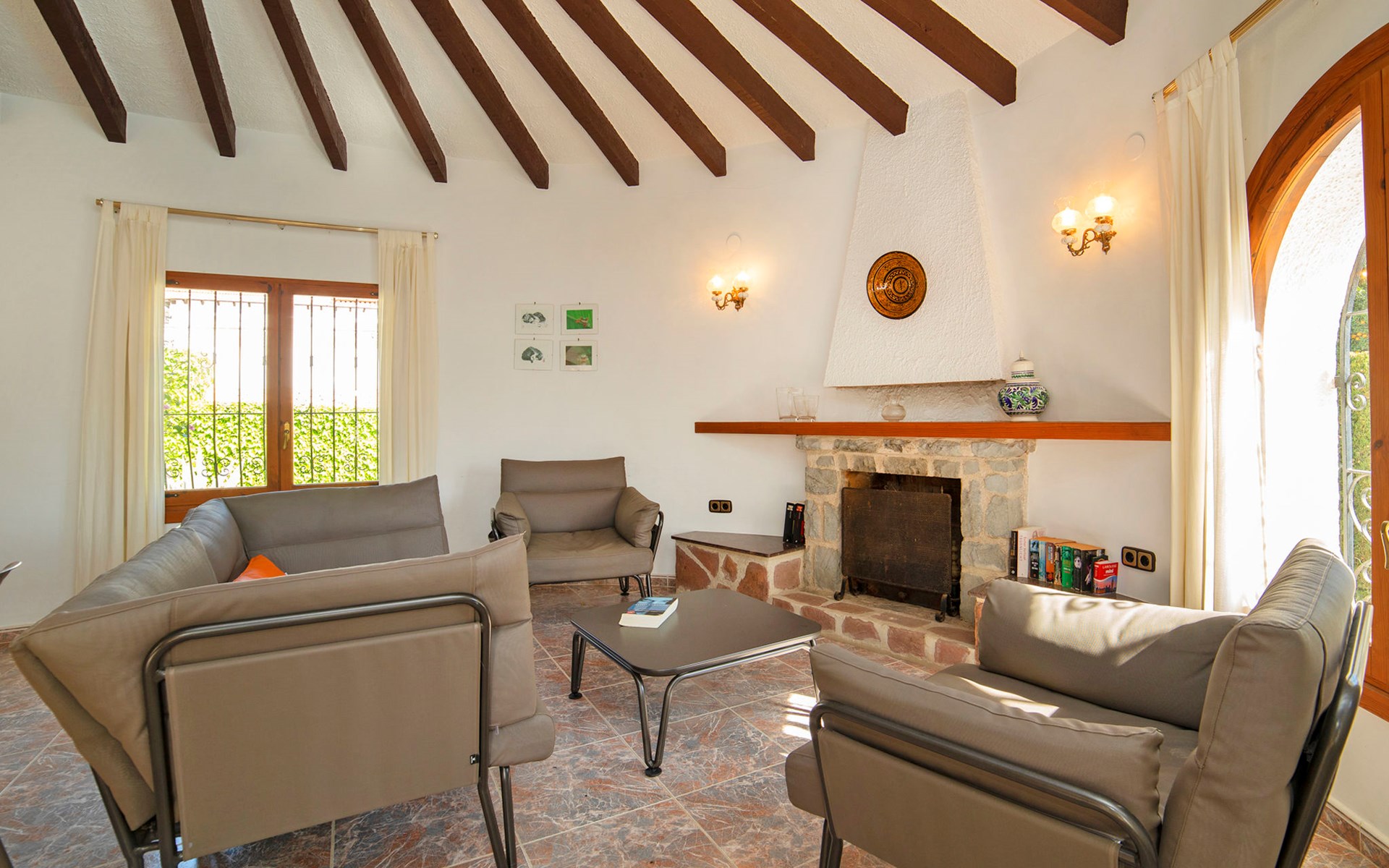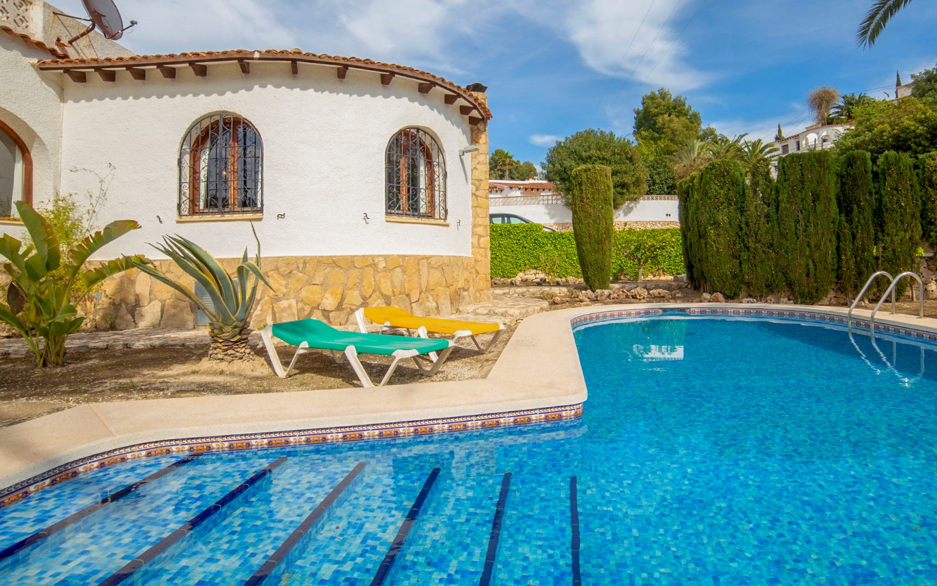 Benissa Costa: Single-family house "Miss". 5.5 km from the centre of Moraira, 11.4 km from the centre of Calpe, in the district Montemar, in a quiet, sunny position residential area (villas), 3 km from the sea. Private: property 876 m2, well-kept garden, swimming pool (4 x 8 m, depth 100 - 180 cm, seasonal availability: 01.Jan. - 31.Dec.). In the house: roof terrace. Parking at the house. Supermarket 2 km, restaurant 1.3 km, bar 1.3 km, bus stop 3 km, sandy beach 5.6 km, swimming bay 3 km. Nearby attractions: Aqualandia, Mundomar, Terra MÃtica, Terra Natura, y Benidorm Palace (Benidorm).