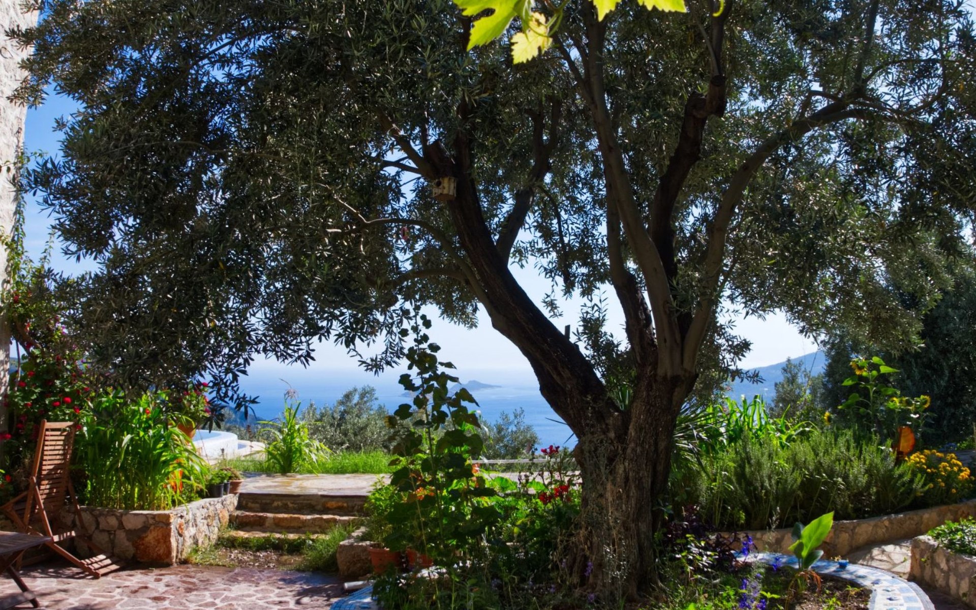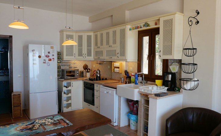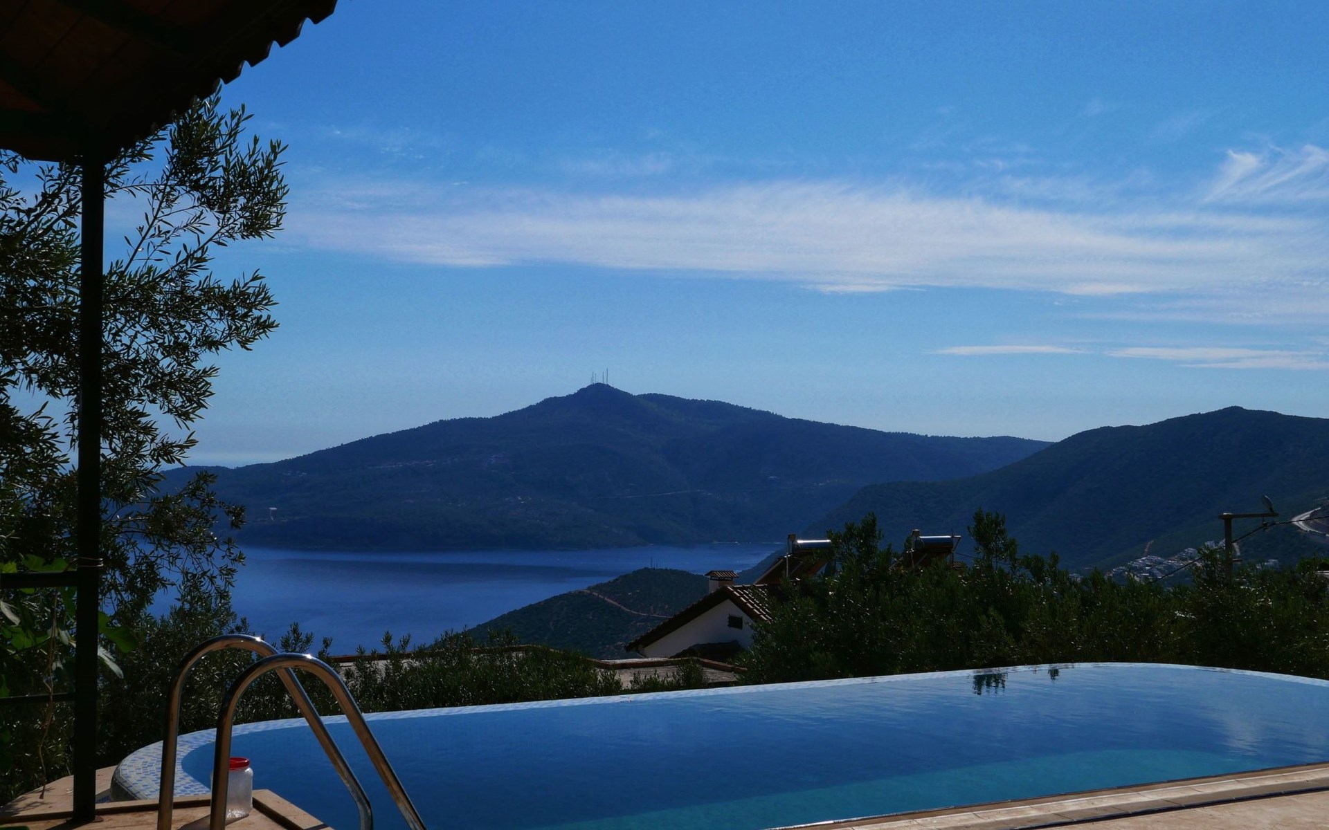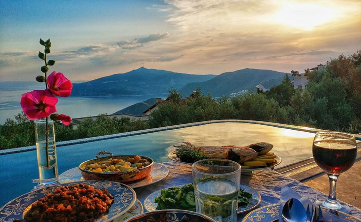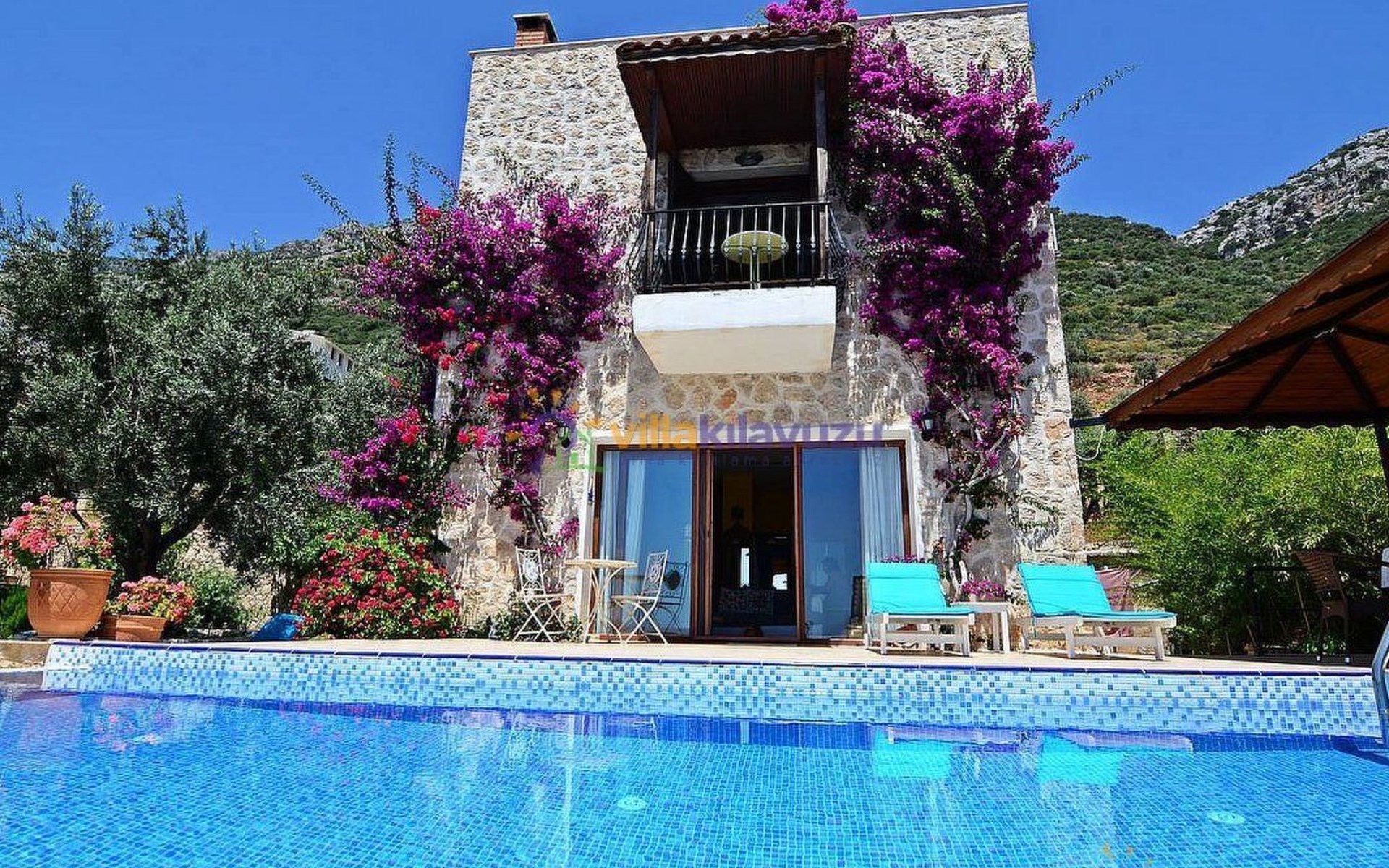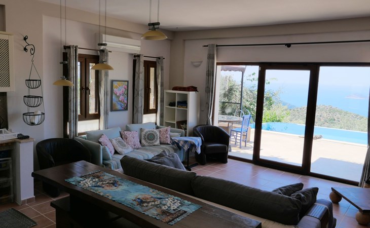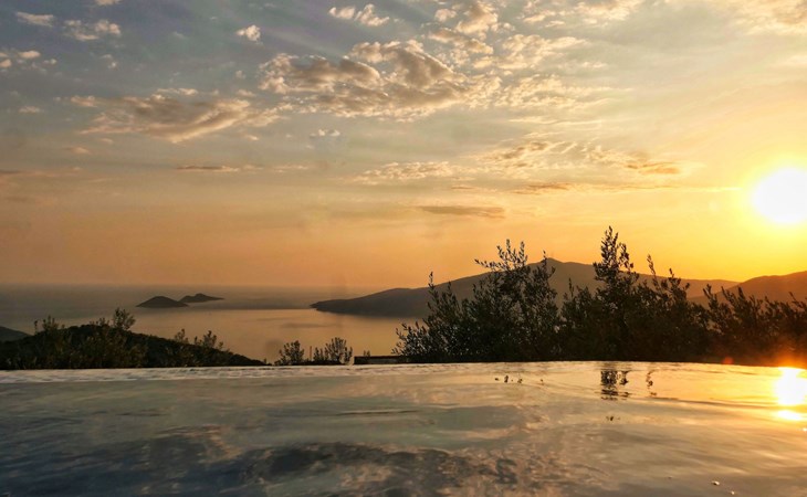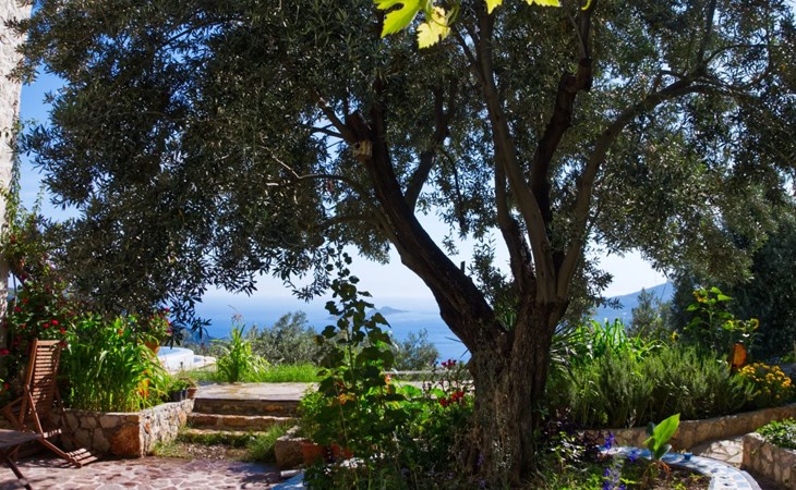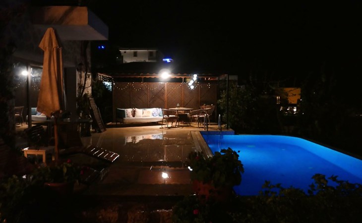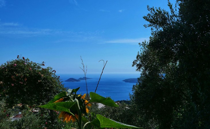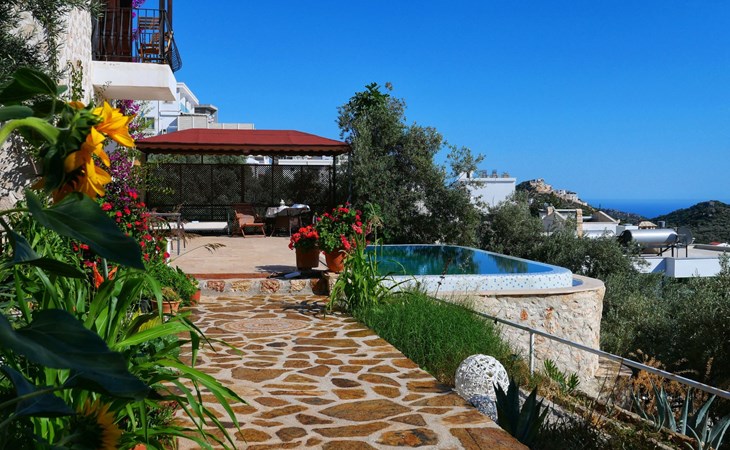 The earthquake-proof natural stone house stands on a hillside with a panoramic view of the bay of Kalkan and the Mouse Islands. There are two car parking spaces at the entrance. The terrace, with parasol and a covered area, adjoins the infinity pool and an olive grove. Next to the house is a large pergola area with a fireside barbecue. There are numerous seating areas with tables, loungers, chairs, hammocks and sun loungers and the property is walled and fenced. Pets are allowed with prior notice.