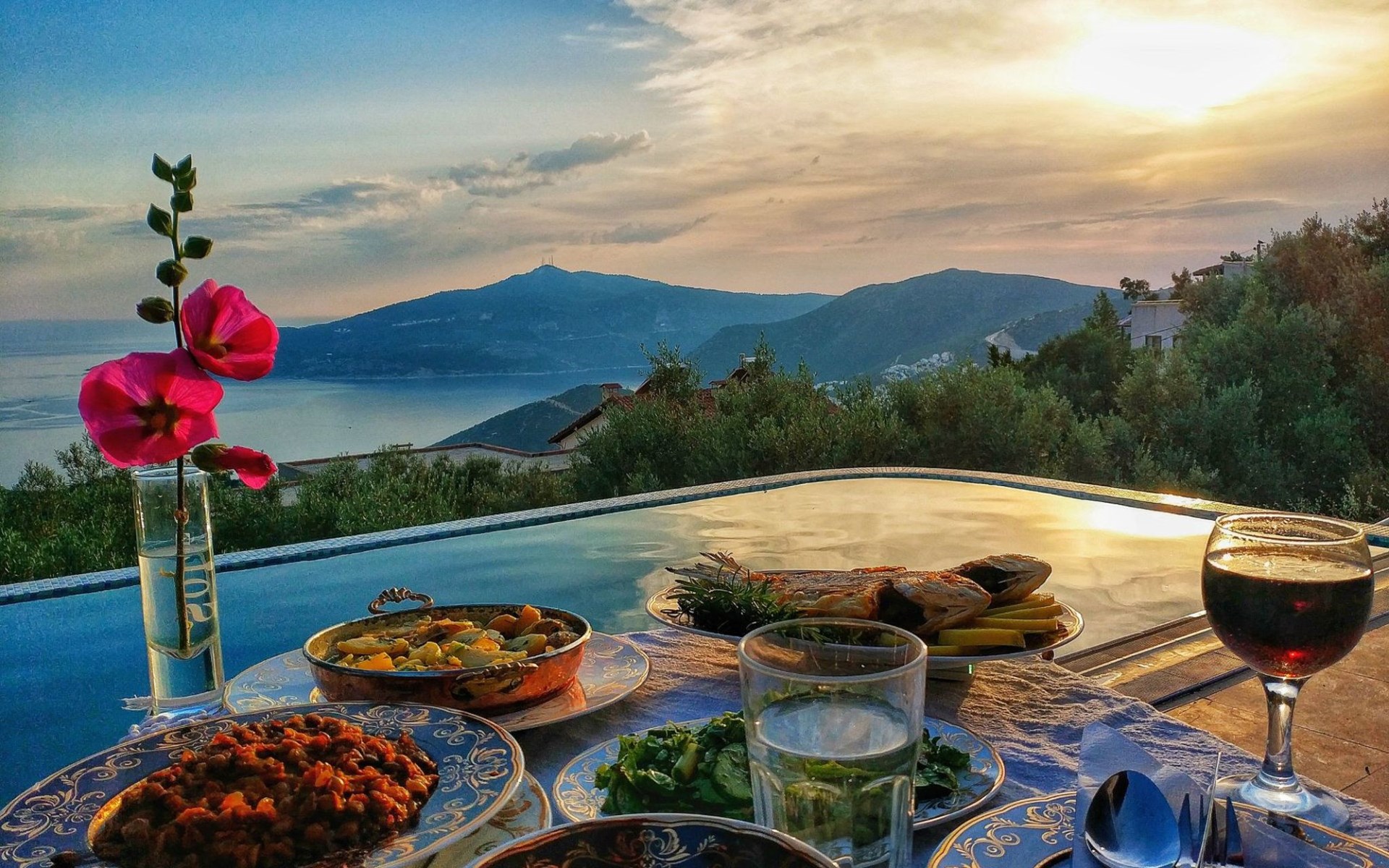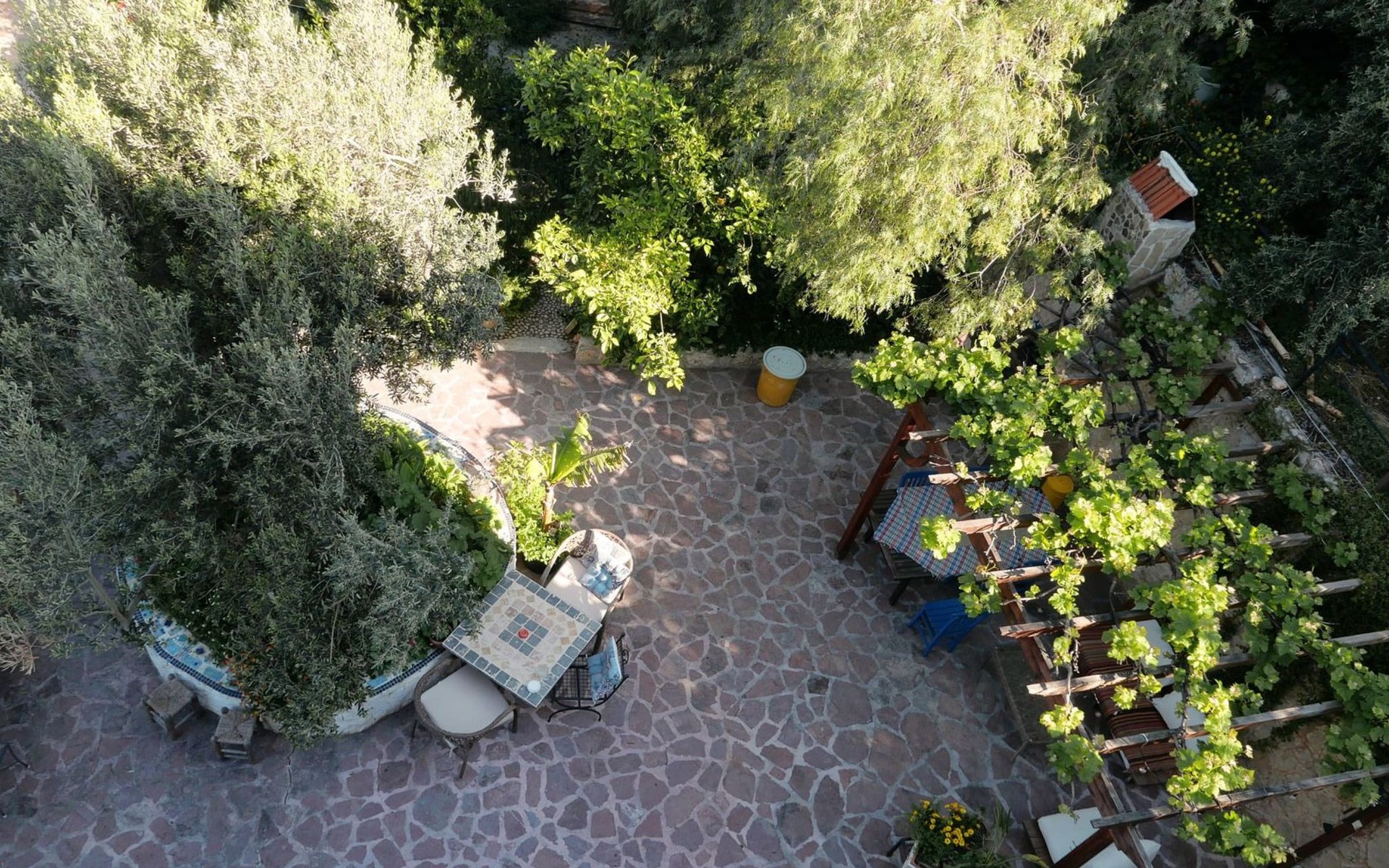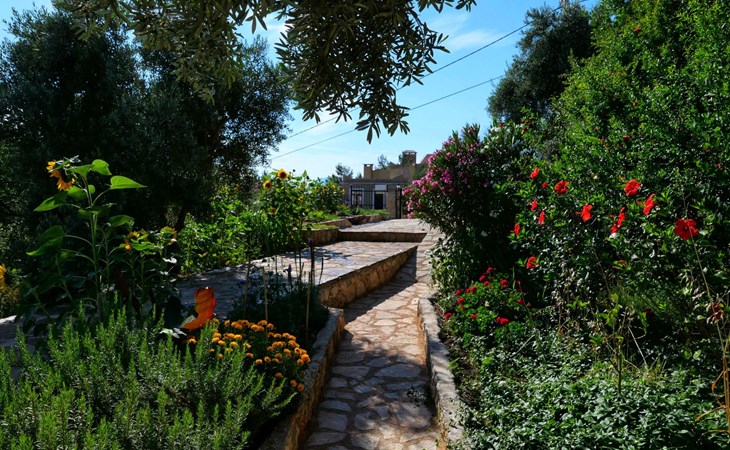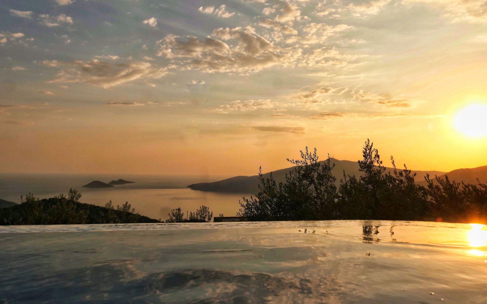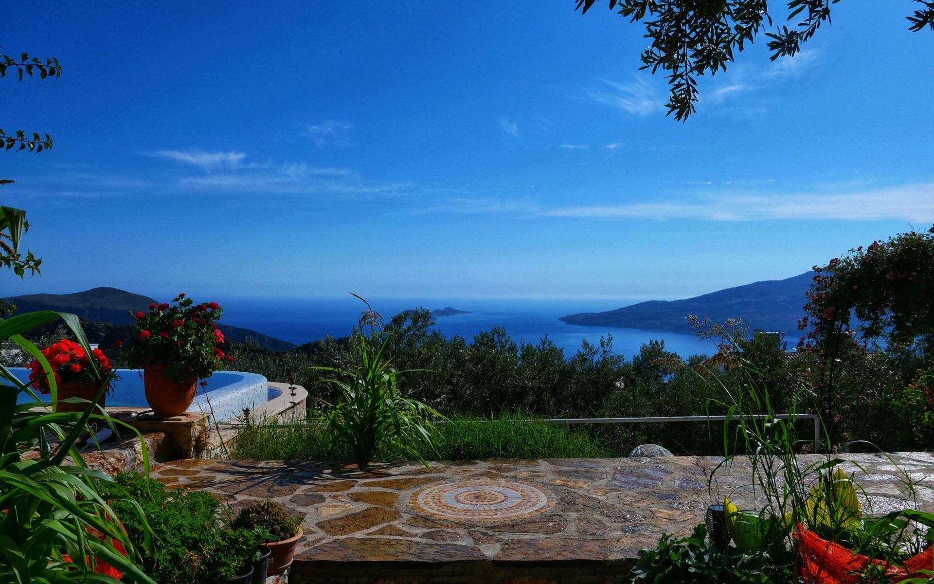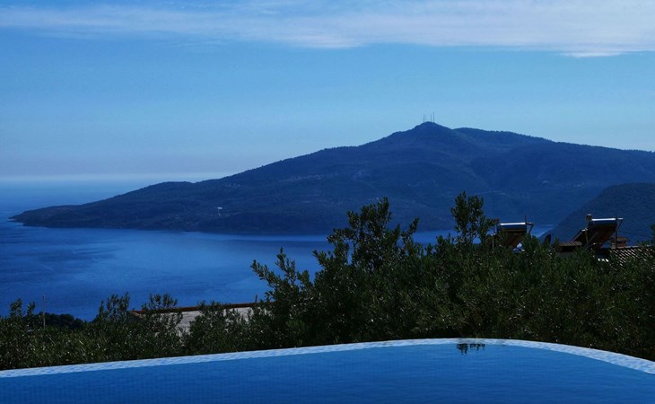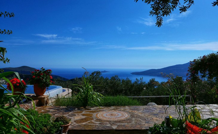 The earthquake-proof natural stone house stands on a hillside with a panoramic view of the bay of Kalkan and the Mouse Islands. There are two car parking spaces at the entrance. The terrace, with parasol and a covered area, adjoins the infinity pool and an olive grove. Next to the house is a large pergola area with a fireside barbecue. There are numerous seating areas with tables, loungers, chairs, hammocks and sun loungers and the property is walled and fenced. Pets are allowed with prior notice.