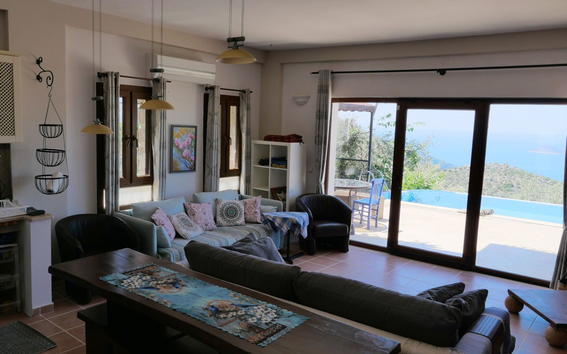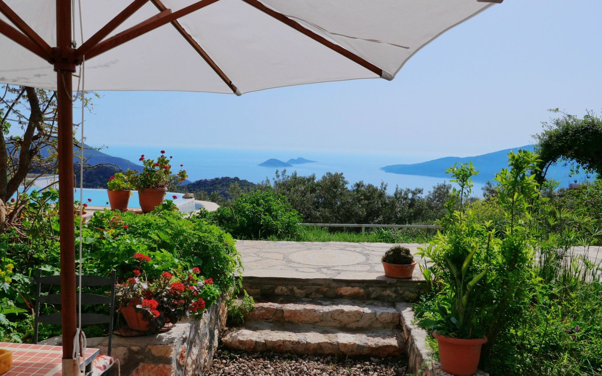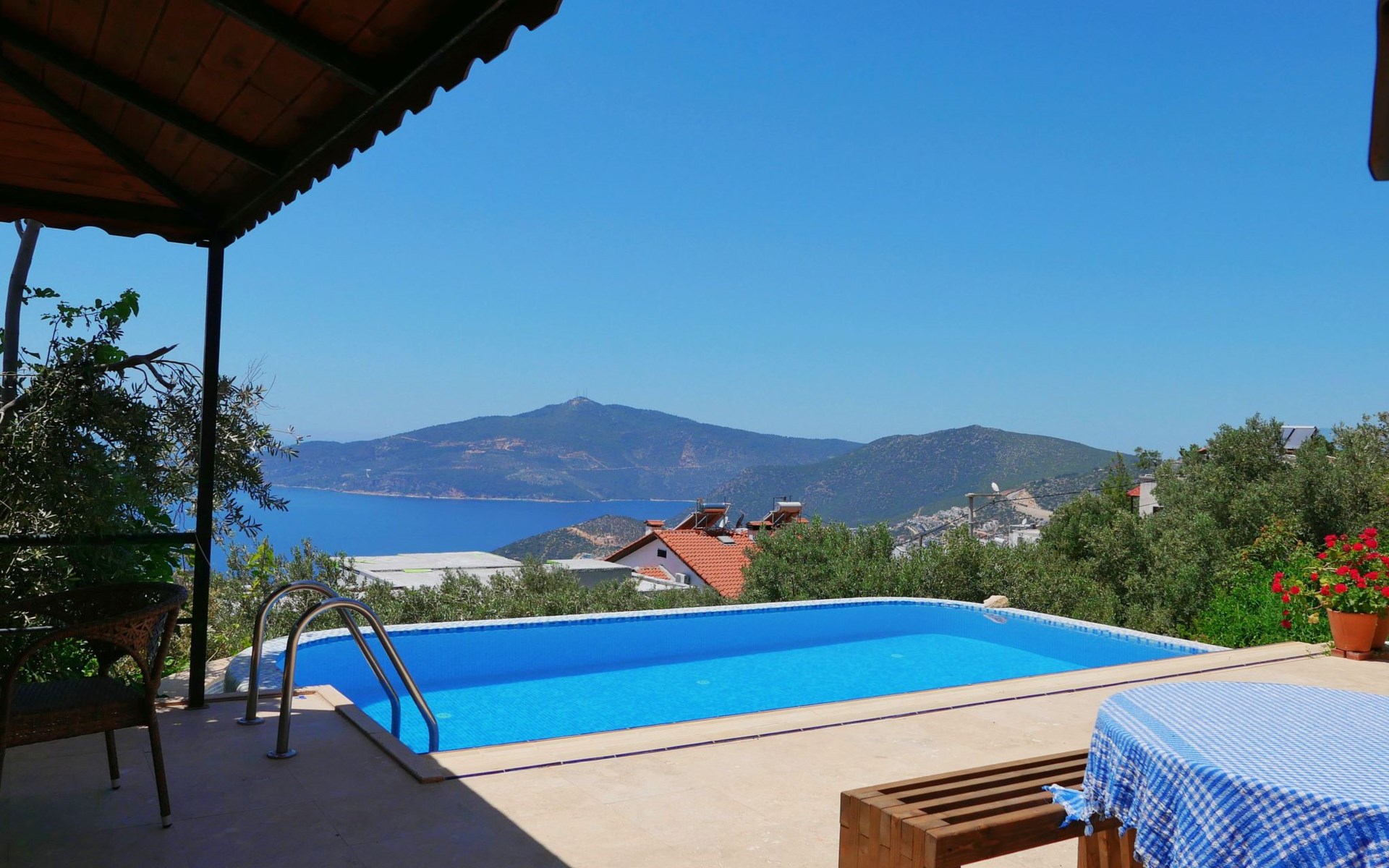 The distance to the nearest beach is about 2000m. There are 3 beaches directly in Kalkan, then the Kaputaj beach 10km away, on the way to Kas 2 additional beaches each 20 and 25 km away and the large Patara beach behind the Patara ruins about 15 km away, but there is an entrance fee.