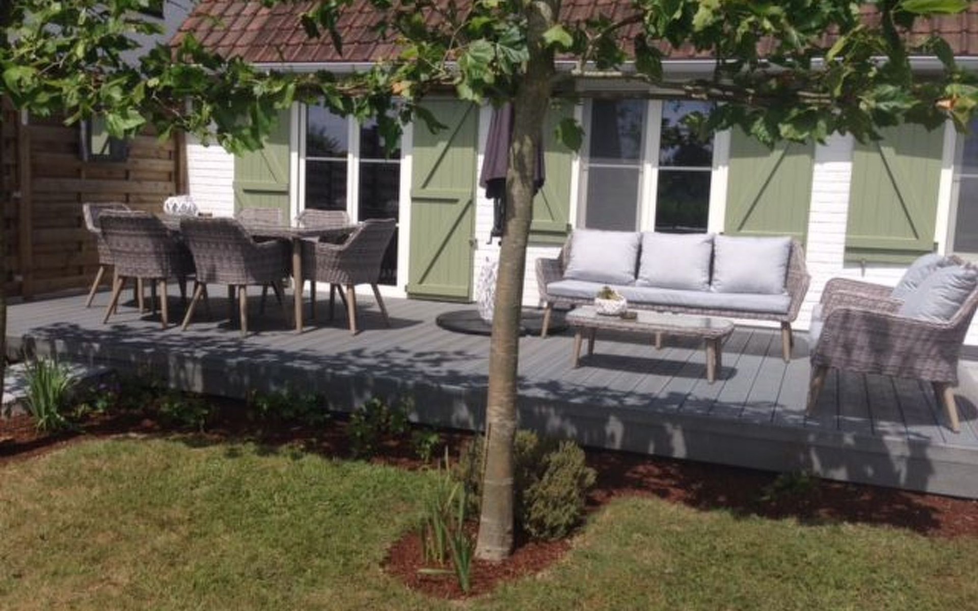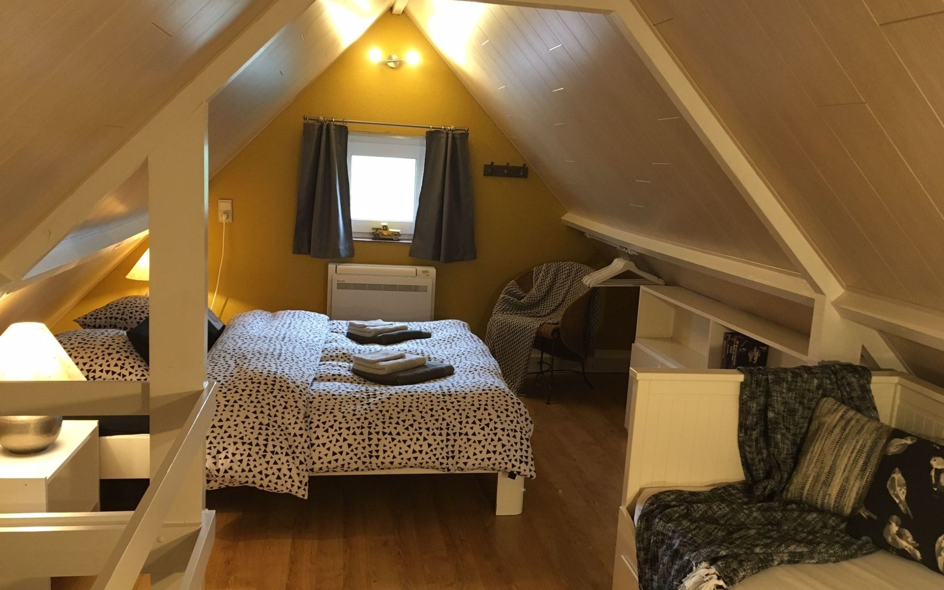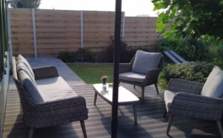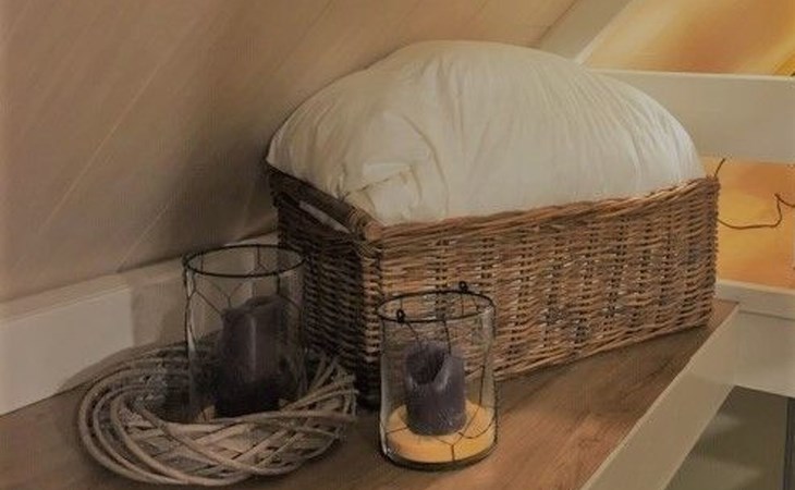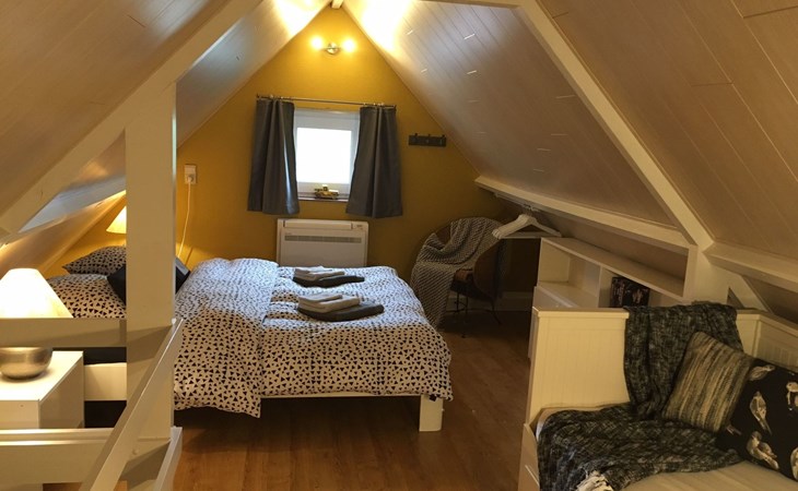 Inside, the house welcomes you with a cosy seating area around a fireplace and is equipped with a widescreen TV with satellite, digital TV and Netflix. A DVD player and a mini stereo are also available, in addition to an atmospheric dining area. The separate kitchen is fully equipped with an induction hob, fridge freezer, oven, microwave, dishwasher and a full set of kitchen utensils. The downstairs bedroom offers a comfortable box-spring bed for two and a spacious wardrobe. The bathroom is equipped with a bathtub, shower screen, washbasin with hairdryer and toilet. A mezzanine with a double bed and a sofa bed provide extra sleeping space, while air conditioning ensures comfort in all seasons.