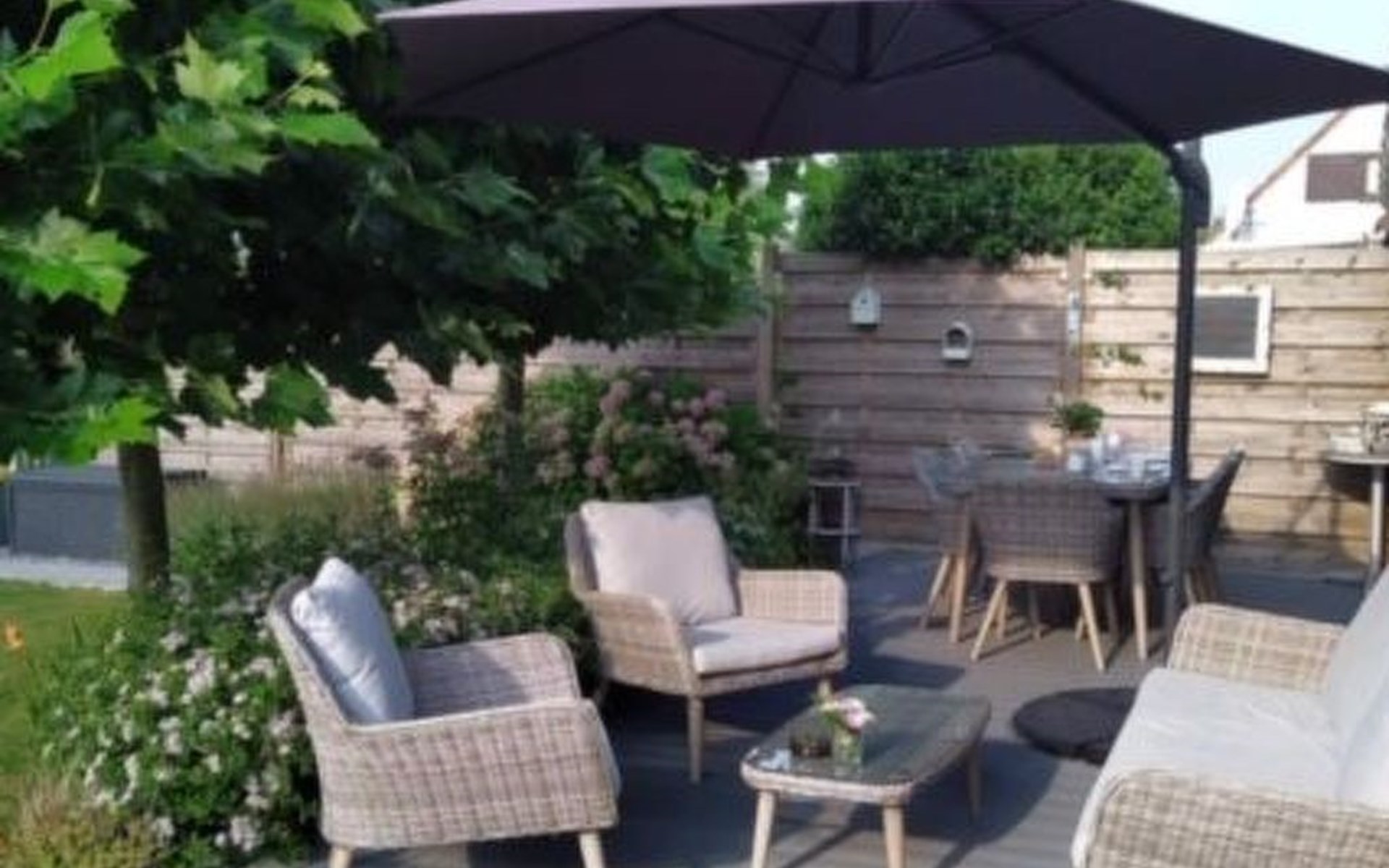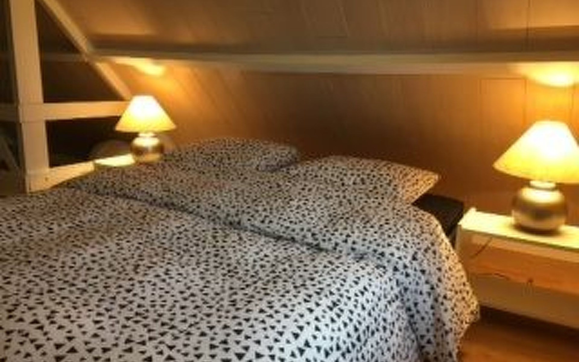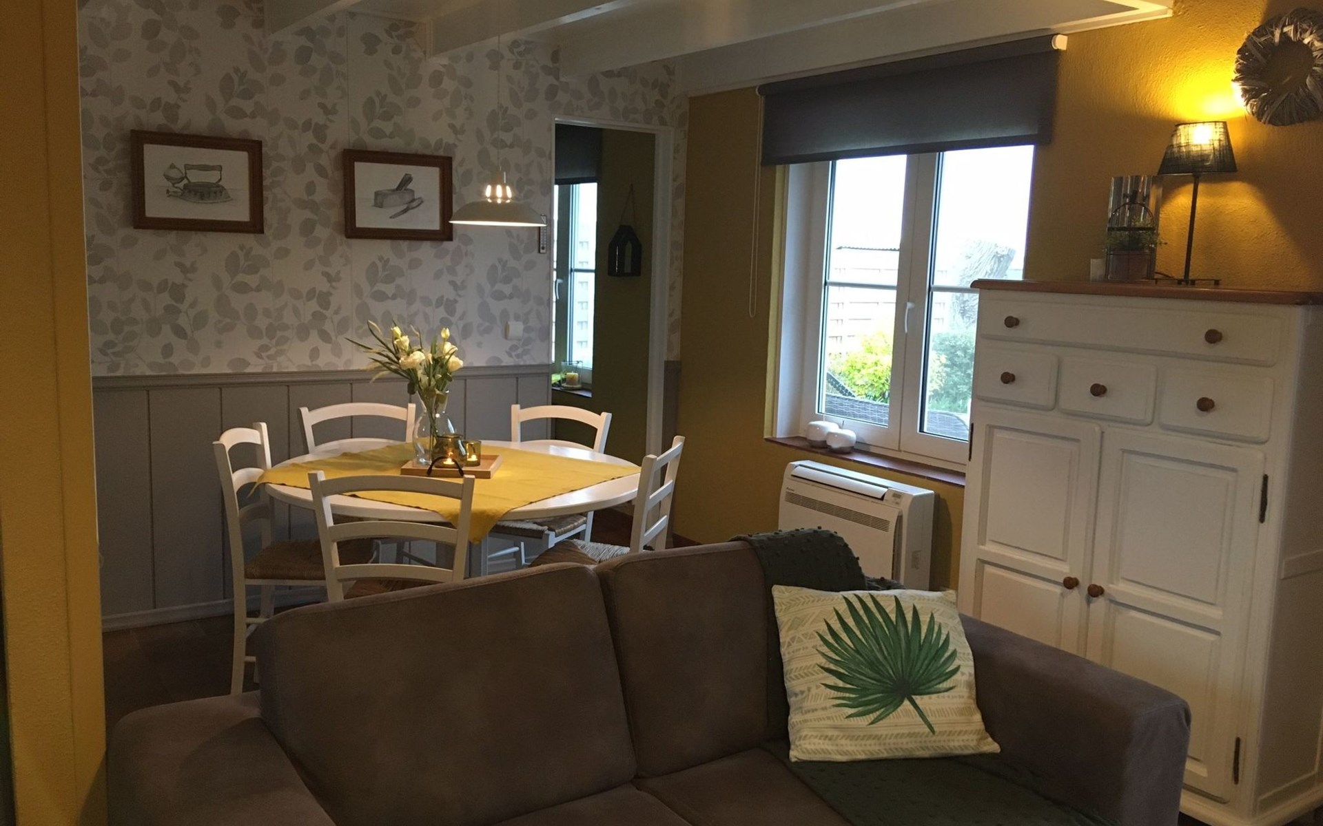 Inside, the house welcomes you with a cosy seating area around a fireplace and is equipped with a widescreen TV with satellite, digital TV and Netflix. A DVD player and a mini stereo are also available, in addition to an atmospheric dining area. The separate kitchen is fully equipped with an induction hob, fridge freezer, oven, microwave, dishwasher and a full set of kitchen utensils. The downstairs bedroom offers a comfortable box-spring bed for two and a spacious wardrobe. The bathroom is equipped with a bathtub, shower screen, washbasin with hairdryer and toilet. A mezzanine with a double bed and a sofa bed provide extra sleeping space, while air conditioning ensures comfort in all seasons.
