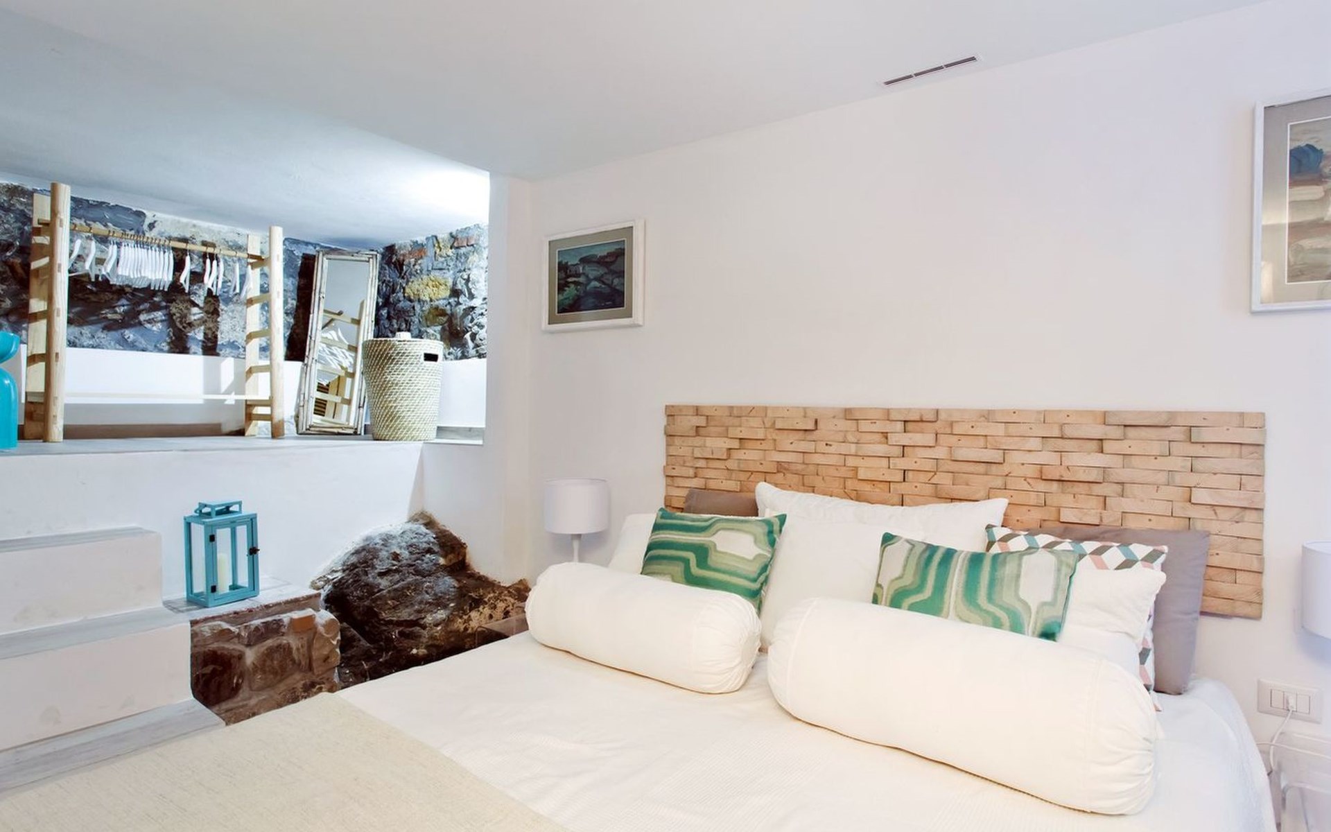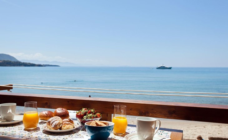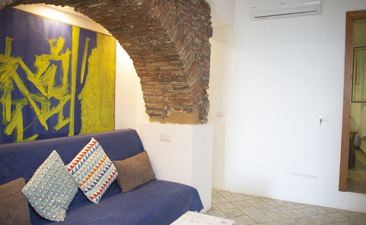 The apartment is located on the ground floor and features an open-space living room with sofa bed and dining area with sea views through a french door leading to the terrace and the beach. The charming well equipped small kitchen is accessed to the right of the dining area through a brick archway. The double bedroom is located at the opposite end of the apartment built around stone rocks which protrude from the ground. The stylish good-sized bathroom features a large walk-in shower.