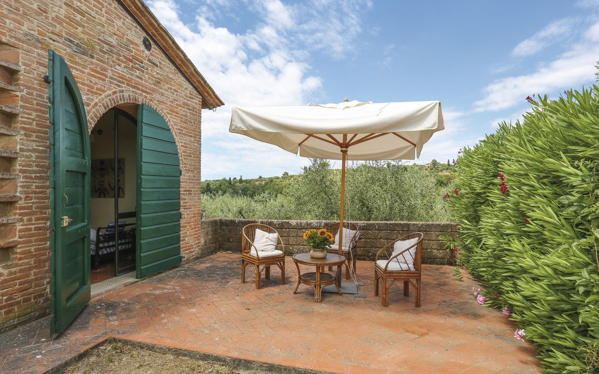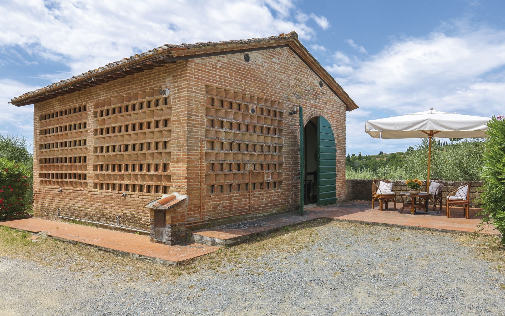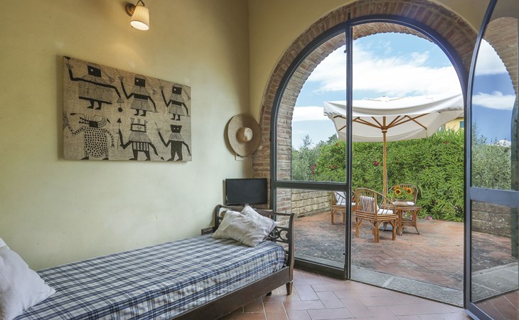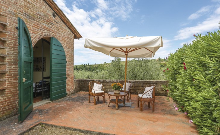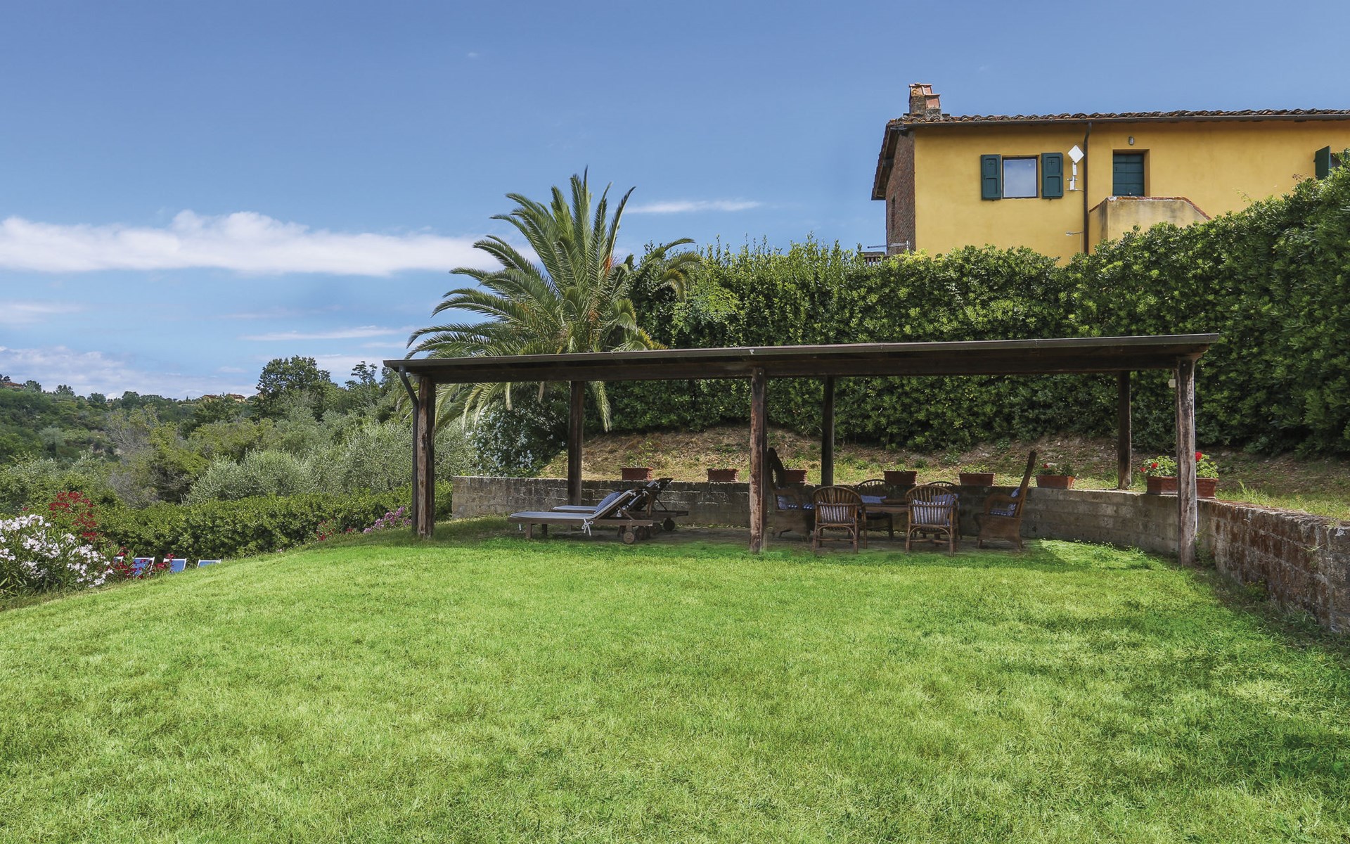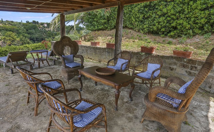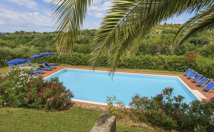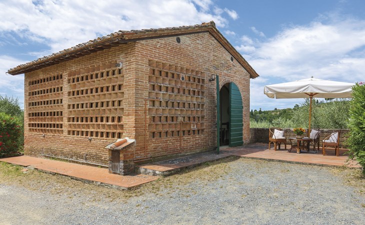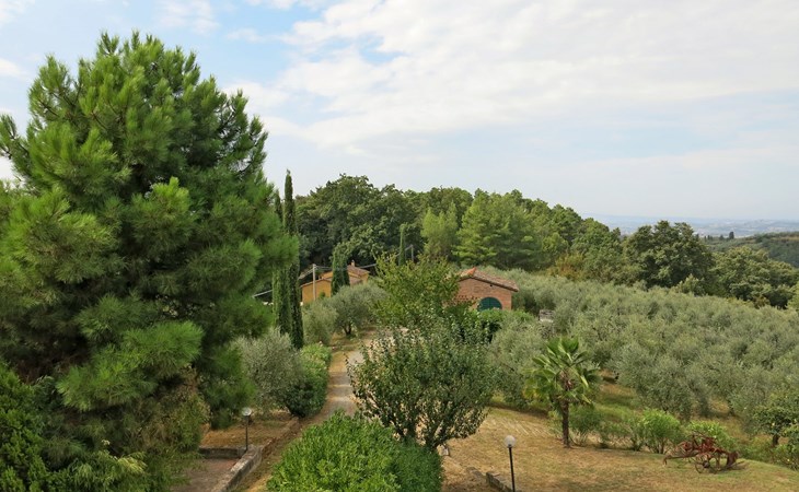 Cottage "Carbonaia", 2 storeys, surrounded by trees. 4 houses in the residence. 6 apartments in the residence. 1.5 km from the centre of Palaia, 47 km from the centre of Pisa, in a secluded position on a slope, 50 km from the sea. For shared use: property, large garden with plants and trees, orchard, swimming pool (15 x 7 m, depth 1 - depth 150 cm, seasonal availability: 02.May. - 03.Oct.). Outdoor shower. In the house: washing machine (for shared use, extra). 1 km long motor access (via unmade road). Shop 1.5 km, supermarket 8.5 km, bus stop 1.5 km, sandy beach "Tirrenia" 50 km. Golf course (9 hole) 20 km.