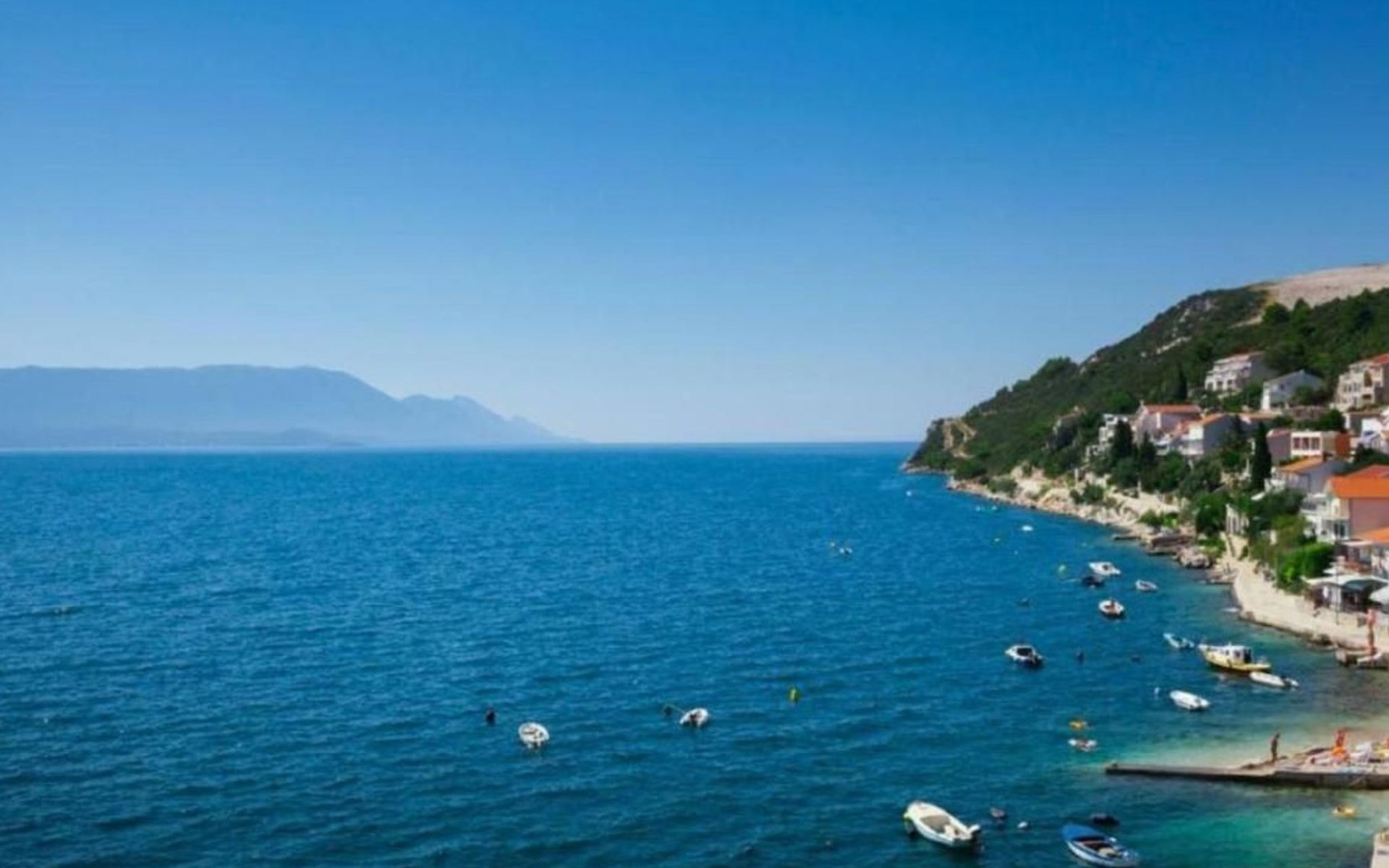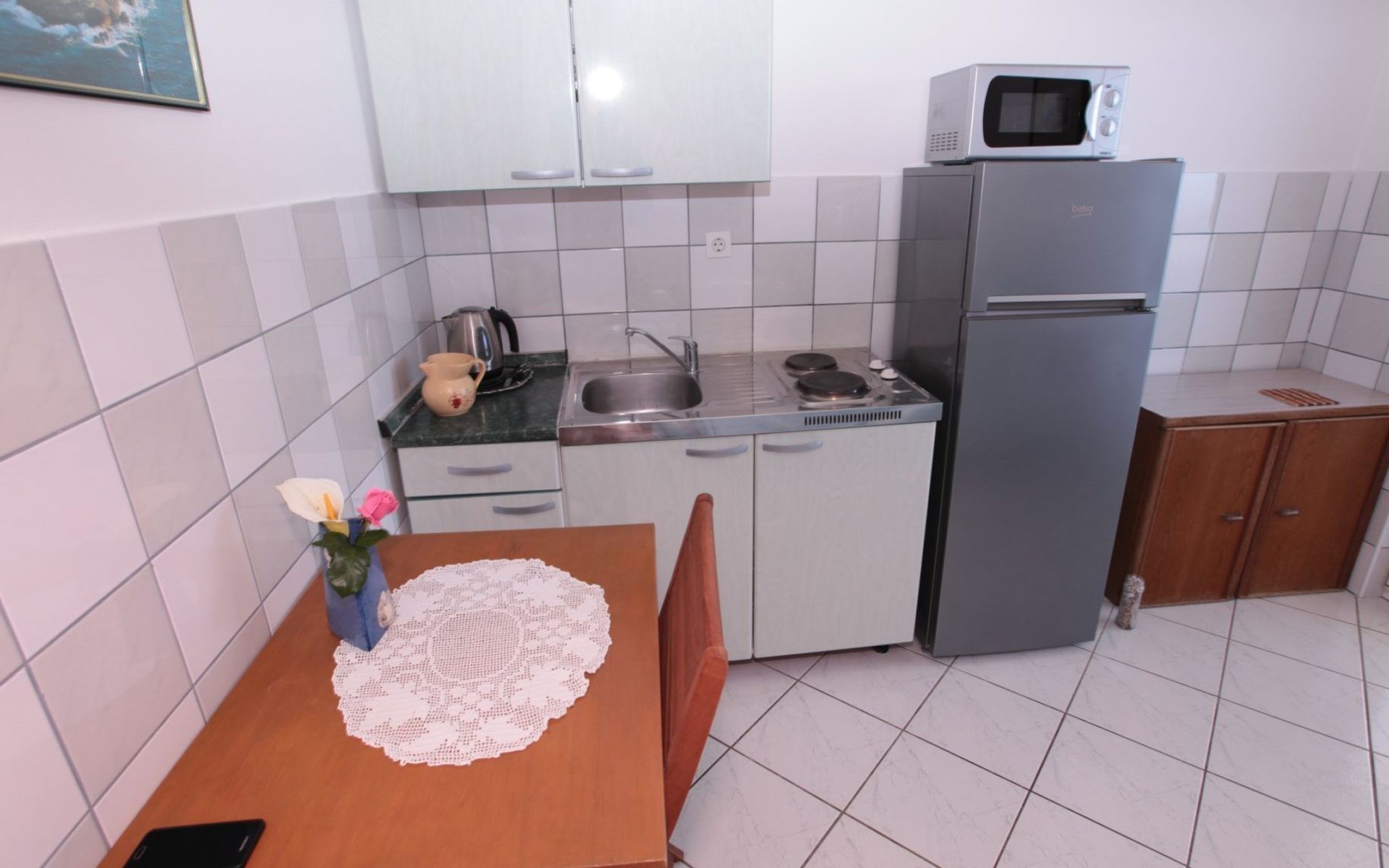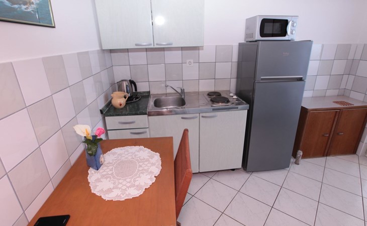 The apartment, a cozy retreat of 49 m2, resides on the ground floor, offering ease of access and a terrace that presents a panoramic view of the sea, sunsets, Mali Ston Bay, and the Peljesac Peninsula. Perfectly accommodating 2-3 adults or a family with a maximum of two children, it features a bedroom with a comfortable double bed, equipped with two cozy mattresses, a wardrobe, mirror, and bedside tables. The heart of the apartment, a fully equipped kitchen, includes a stove, fridge with freezer, cookware, dining set for four, electric kettle, and coffee maker, ensuring a seamless and enjoyable cooking experience.
