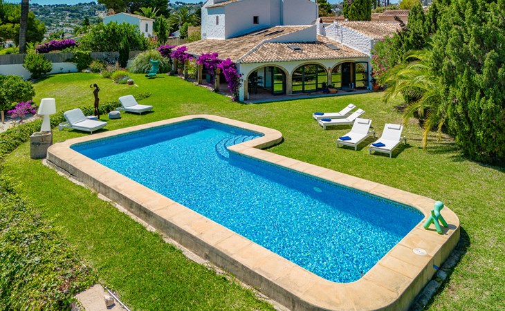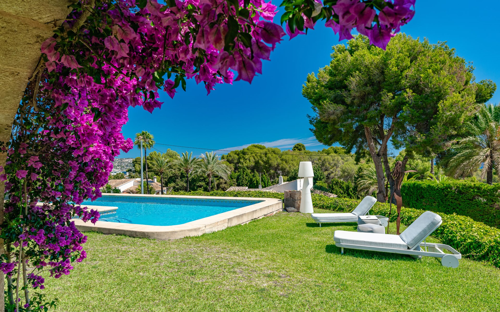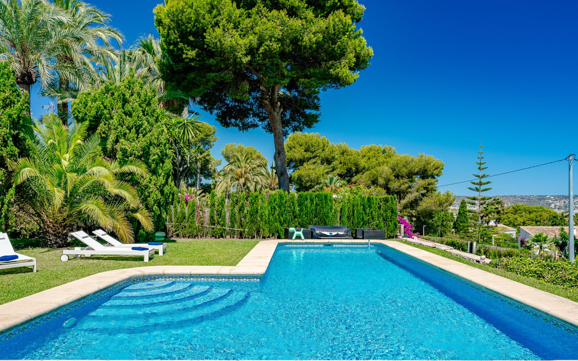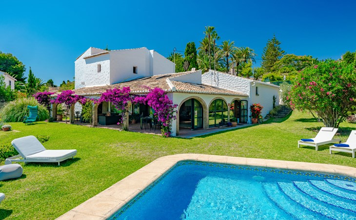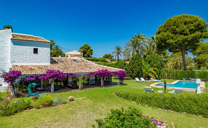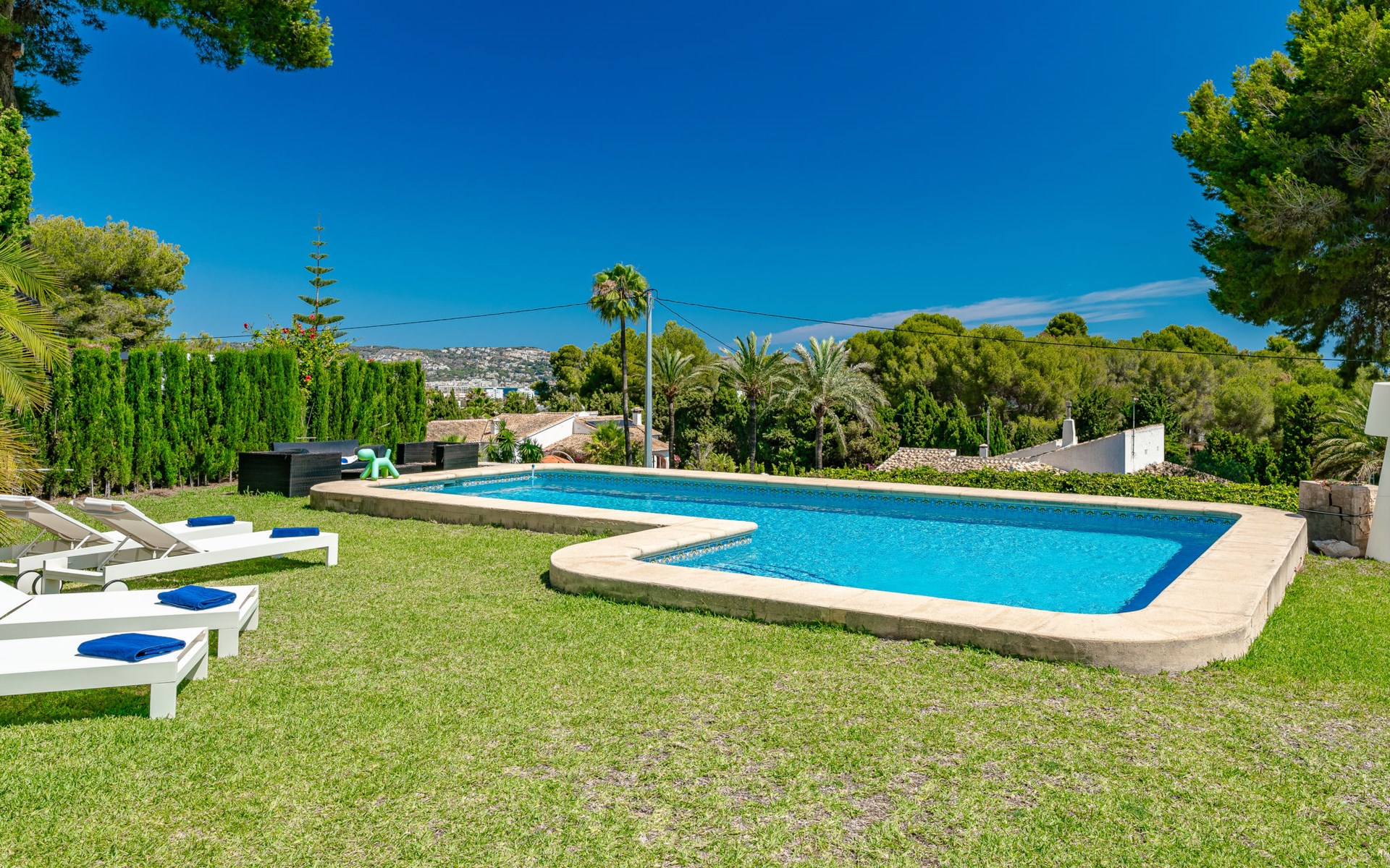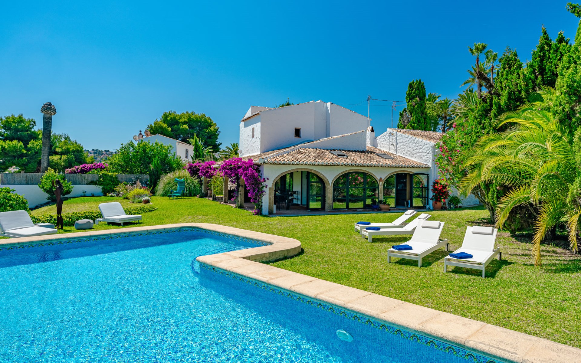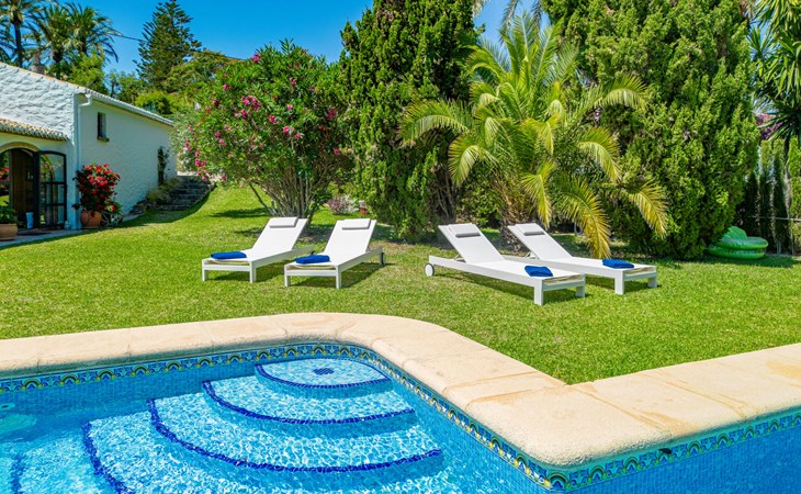Large, beautiful, comfortable villa "Javea Beauty". In the district of El Tosalet, in a quiet, sunny position, in a cul-de-sac. Private: natural state property, large, beautiful, well-kept garden, lawn for sunbathing, swimming pool angular (10 x 6 m, depth 140 - 210 cm, seasonal availability: 01.Jan. - 31.Dec.) with internal staircase. Outdoor shower, patio, pergola, parking (for 3 cars). Supermarket 600 m, restaurant 350 m, café 600 m, bus stop 2 km, sandy beach "El Arenal Javea" 2.2 km. Sports harbour 2.5 km, surf school 2.5 km, sailing school 2.5 km, tennis 2.5 km. Please note: not suitable for small children. The owner does not accept any youth groups.