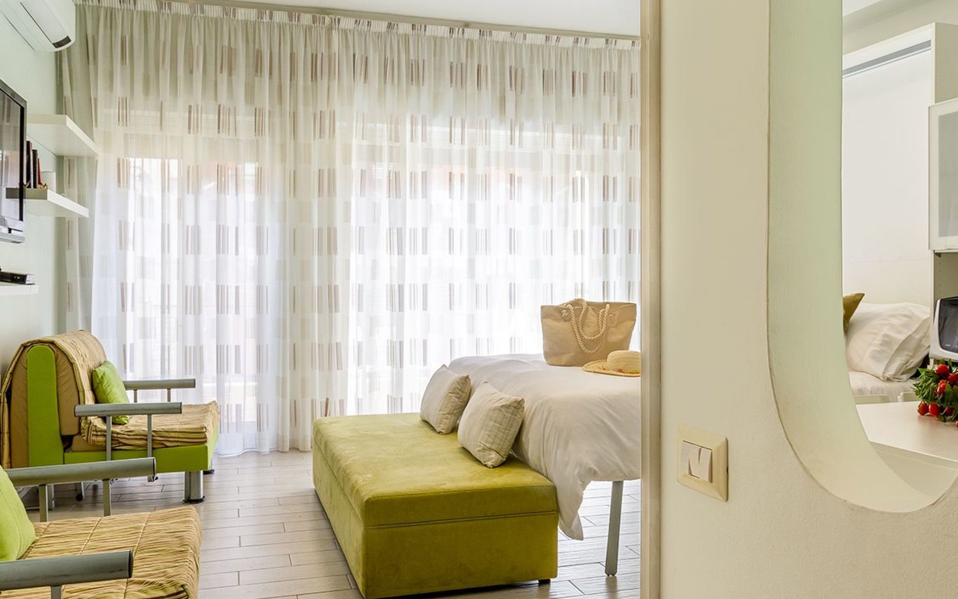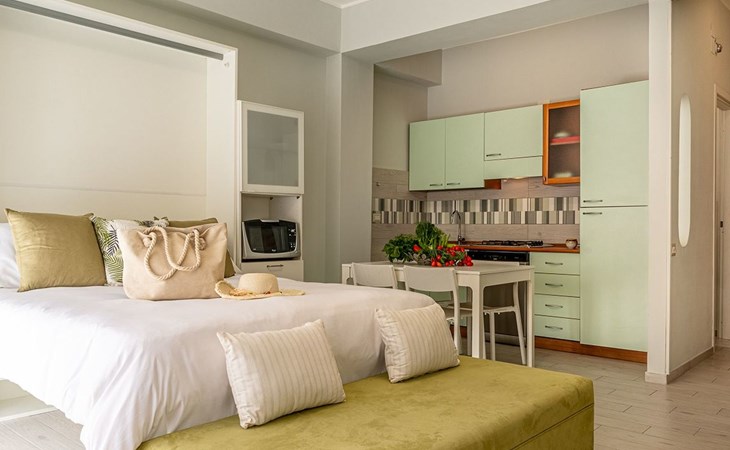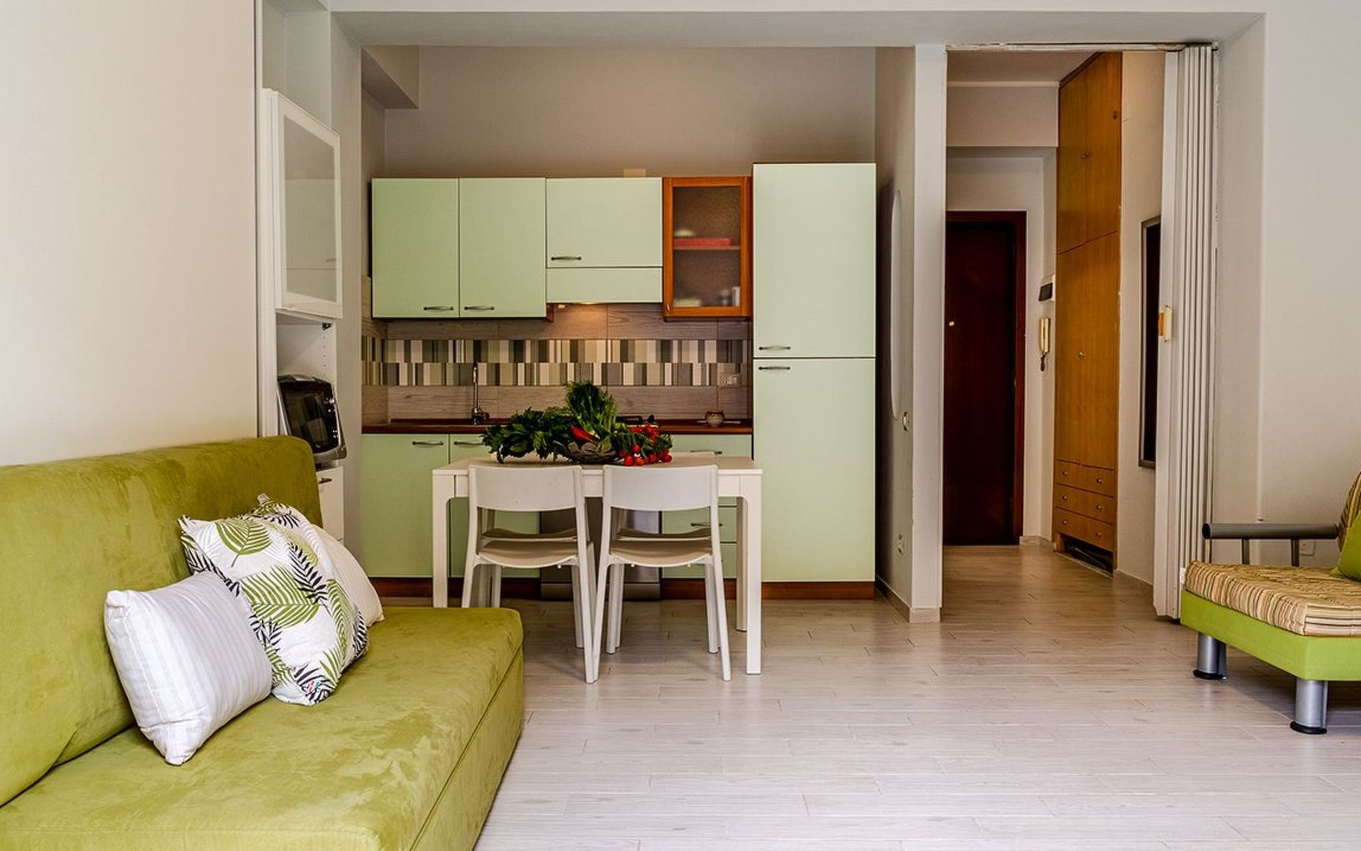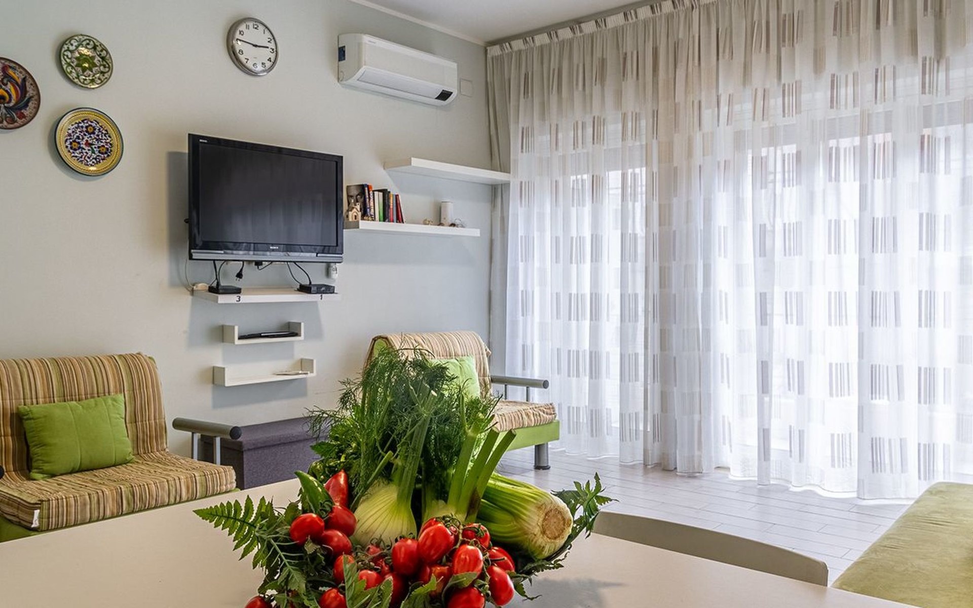 The interior of the flat is designed to offer maximum comfort during your stay. Equipped with partial air conditioning, the accommodation includes a well-organised living area with a flat-screen TV, ideal for your entertainment after a day at the beach. In addition, the presence of a full kitchen and cooking utensils will allow you to prepare delicious meals when you prefer to eat at home. There is also a washing machine for your exclusive use to take care of your wardrobe during your holiday and a dishwasher for easy cleaning.
