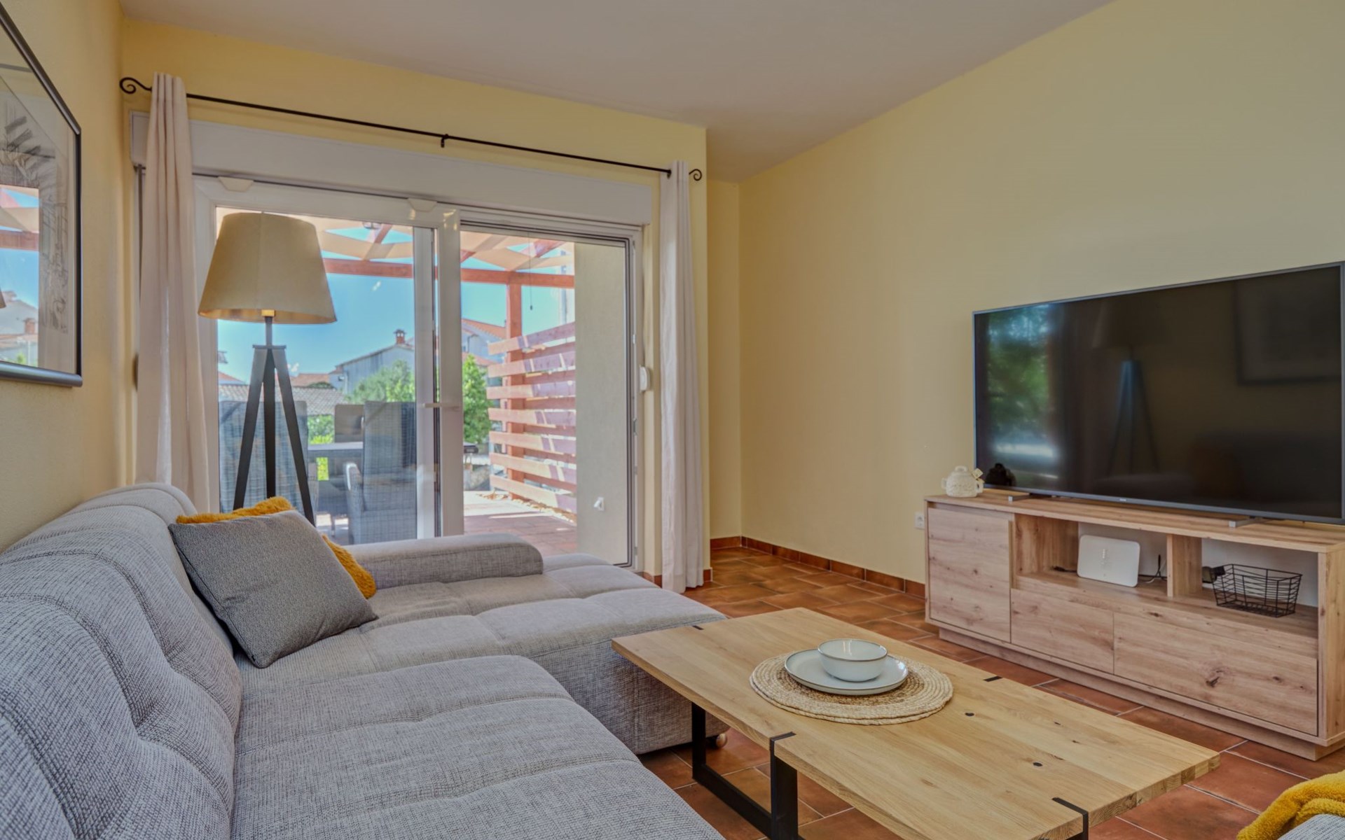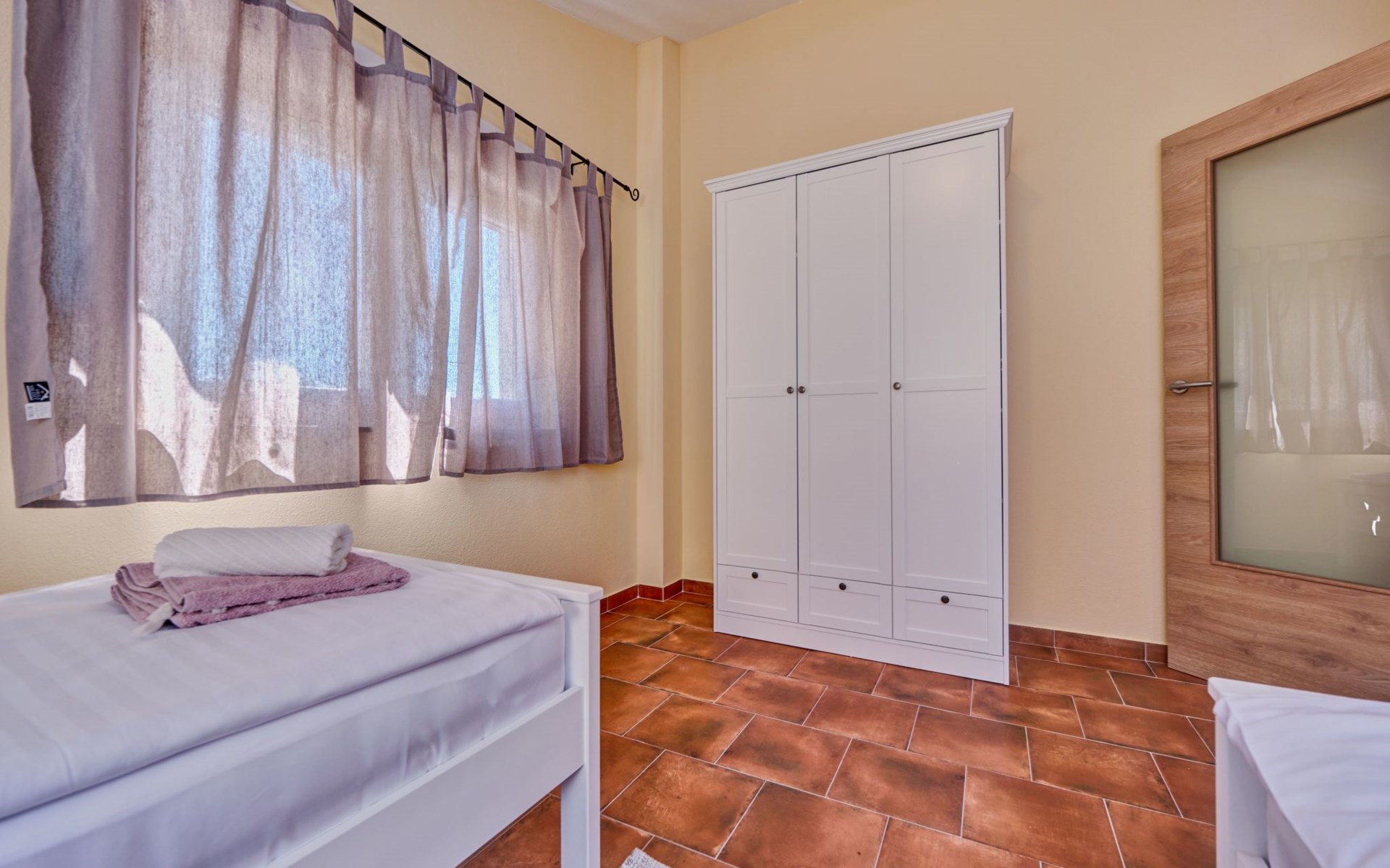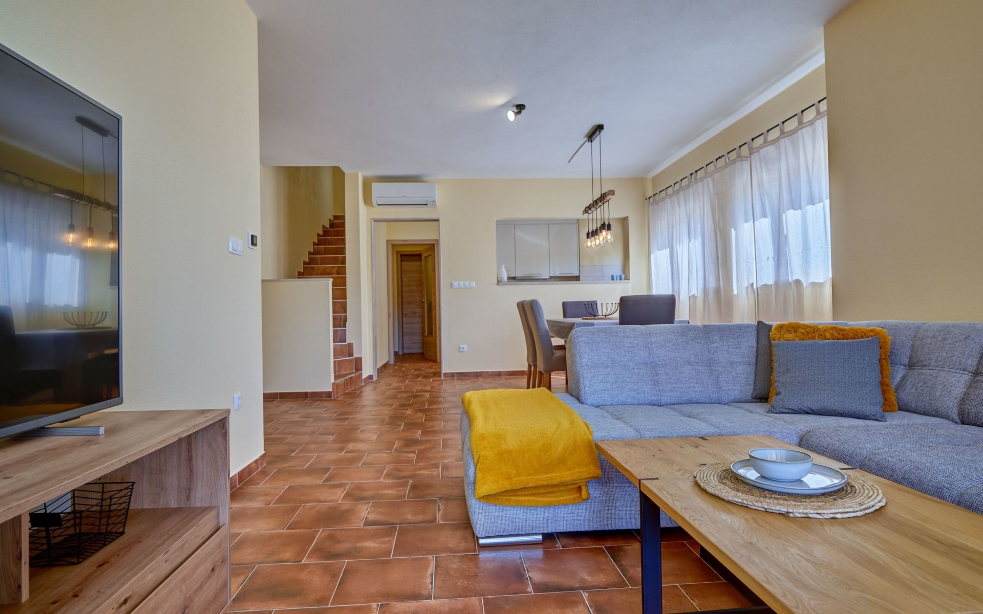 Inside, this holiday home boasts two well-appointed bedrooms and two bathrooms, one equipped with a shower and the other with a bathtub, catering to your comfort and convenience. The living space is enhanced by the presence of air conditioning throughout, ensuring a cool and pleasant environment no matter the weather outside. Essential amenities such as a washing machine exclusively for guests’ use, an induction hob, a filter coffee machine, dishwasher, and an electric kettle make this home away from home both practical and welcoming.