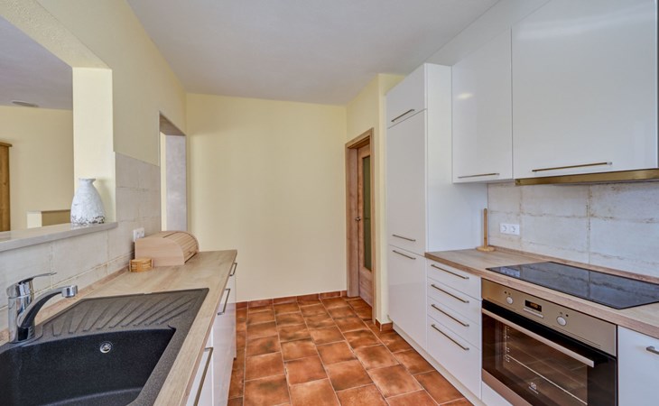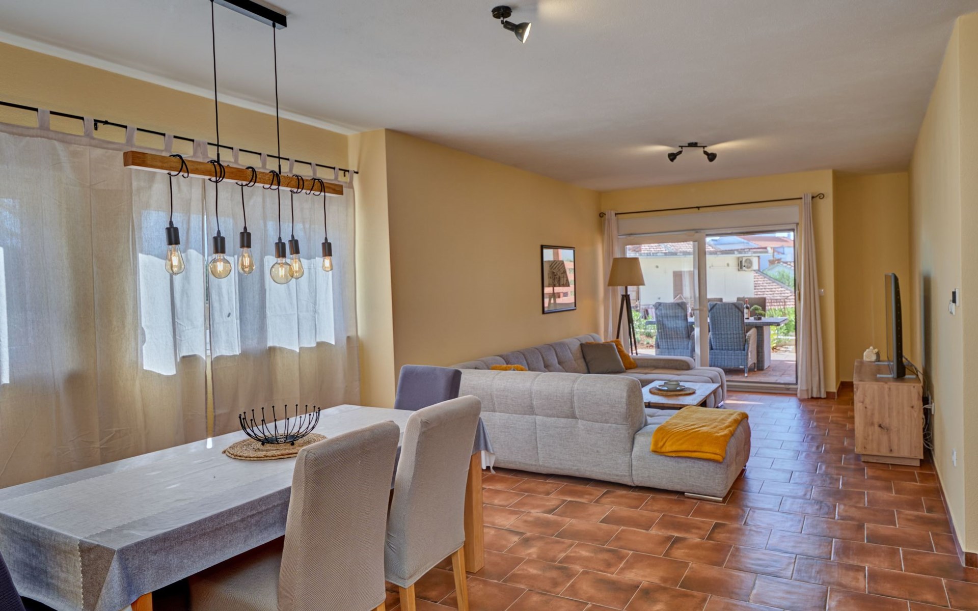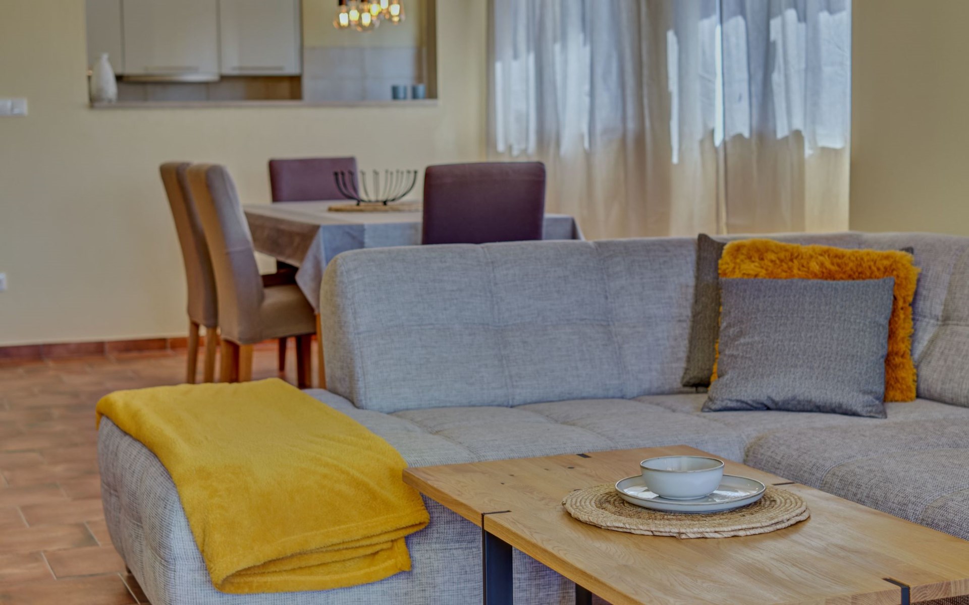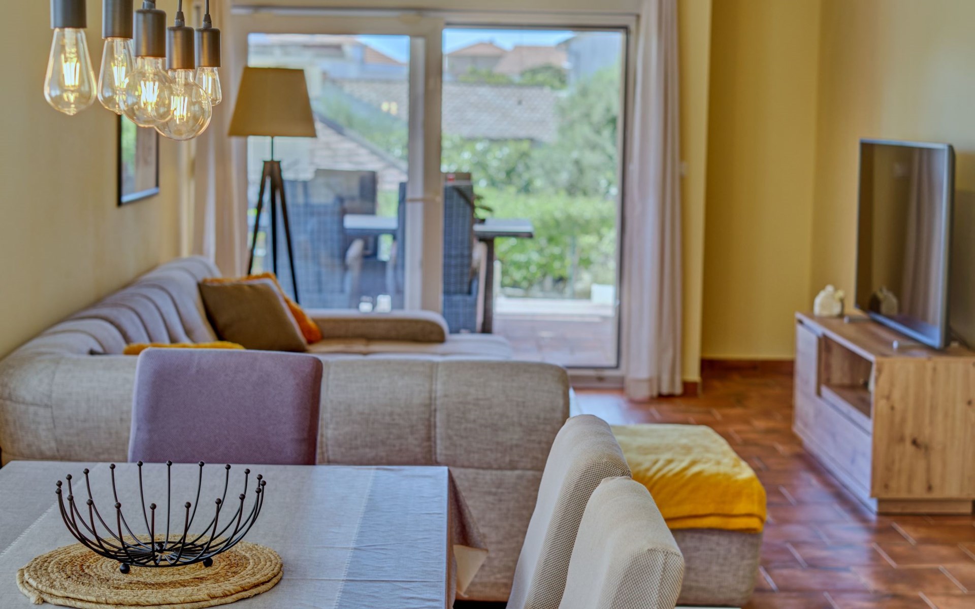 Inside, this holiday home boasts two well-appointed bedrooms and two bathrooms, one equipped with a shower and the other with a bathtub, catering to your comfort and convenience. The living space is enhanced by the presence of air conditioning throughout, ensuring a cool and pleasant environment no matter the weather outside. Essential amenities such as a washing machine exclusively for guests’ use, an induction hob, a filter coffee machine, dishwasher, and an electric kettle make this home away from home both practical and welcoming.