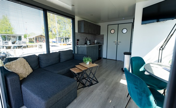 Each houseboat offers comfortable accommodation for up to 4 people and has two bedrooms: one with a double bed and one with a bunk bed. The bright living room has a sitting area, a dining table and a kitchen with modern amenities such as a refrigerator, two electric hobs and a Nespresso coffee maker. For entertainment, there is a TV with streaming function, so you can easily stream content from your smartphone or tablet, such as Netflix.