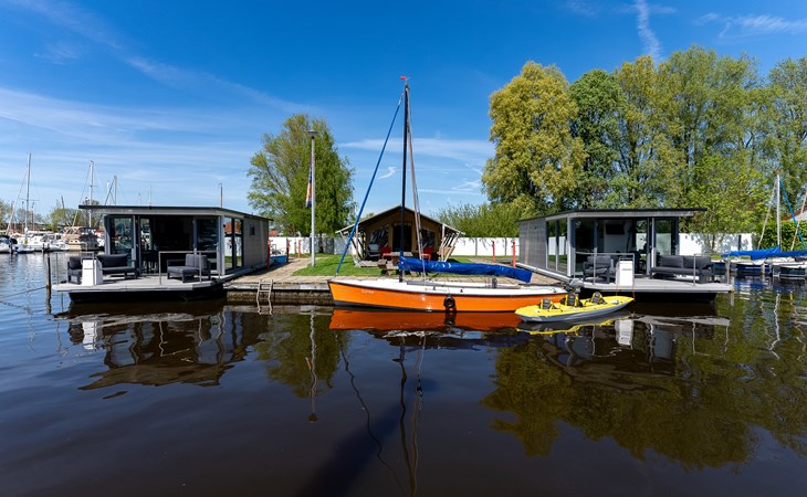 From your own terrace you can enjoy a beautiful view, and in warm weather you can take a refreshing dip in the marina. You have your own 'private water' on your doorstep, where you can swim, fish and do water sports. Would you rather go to the beach? That is only a 10-minute walk away. The lively village center of Heeg can be reached within 5 minutes on foot via a picturesque aqueduct. Each houseboat has a picnic table on the lawn at the water's edge, perfect for cozy meals or a drink in the open air.