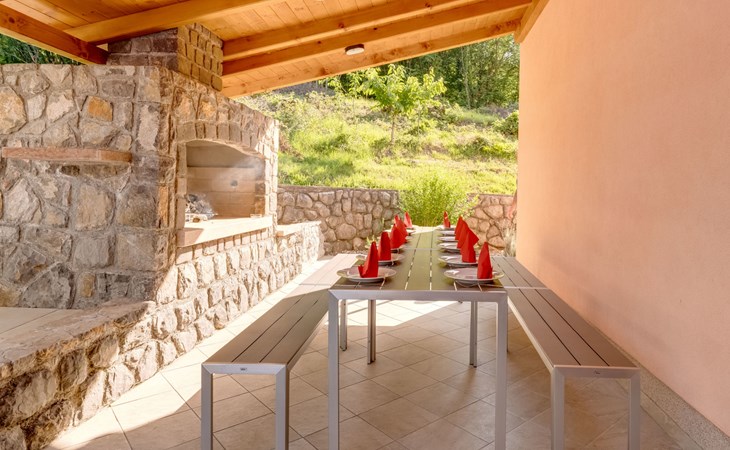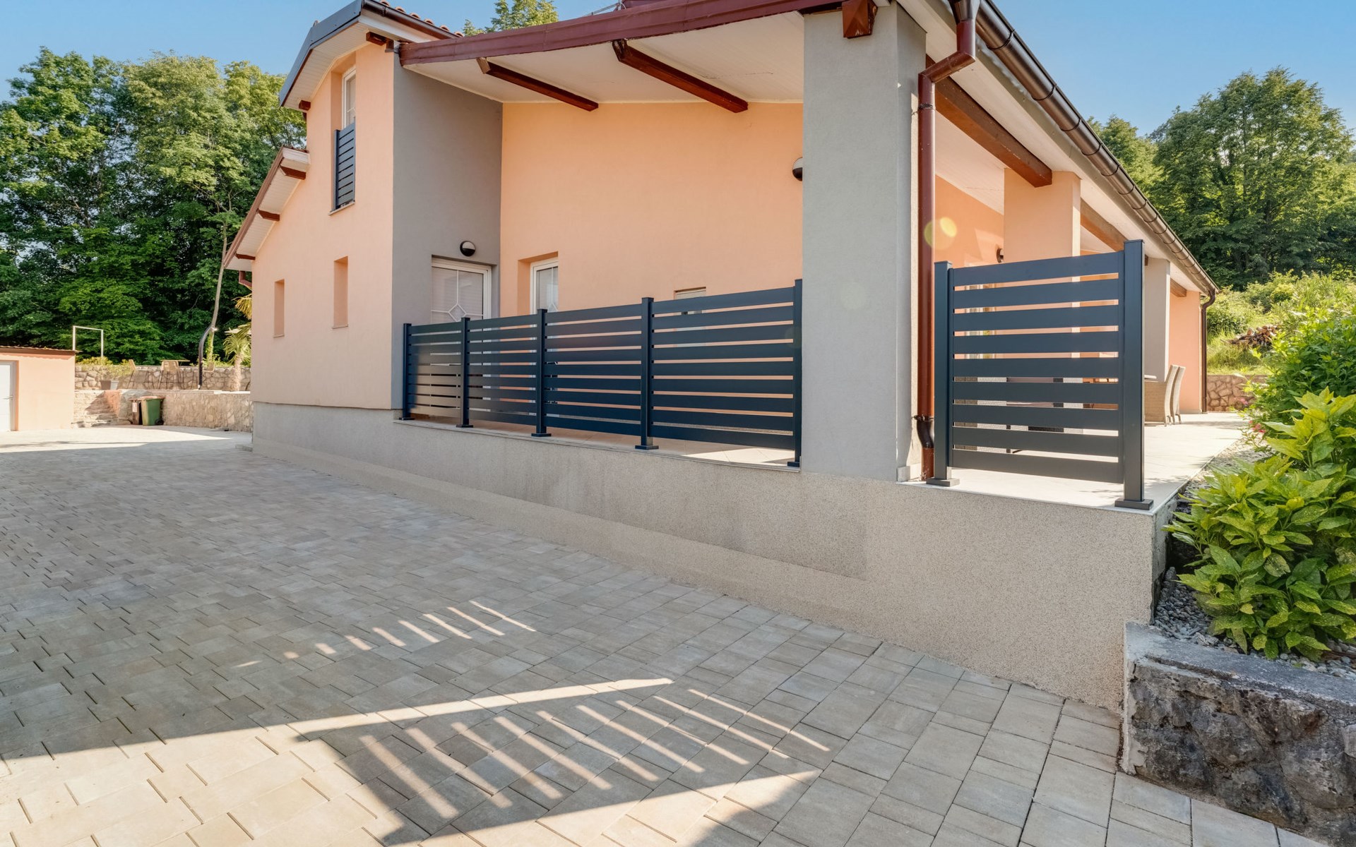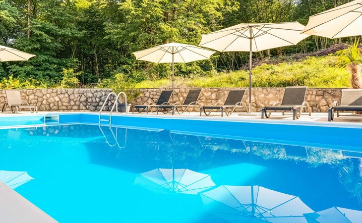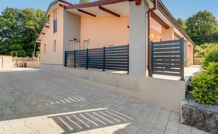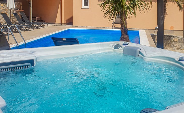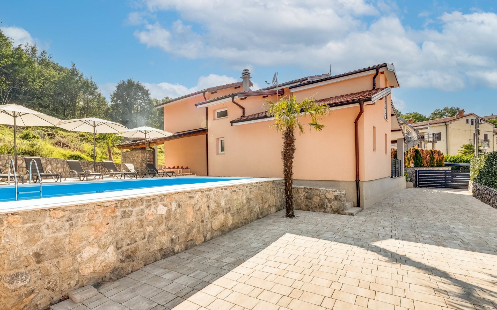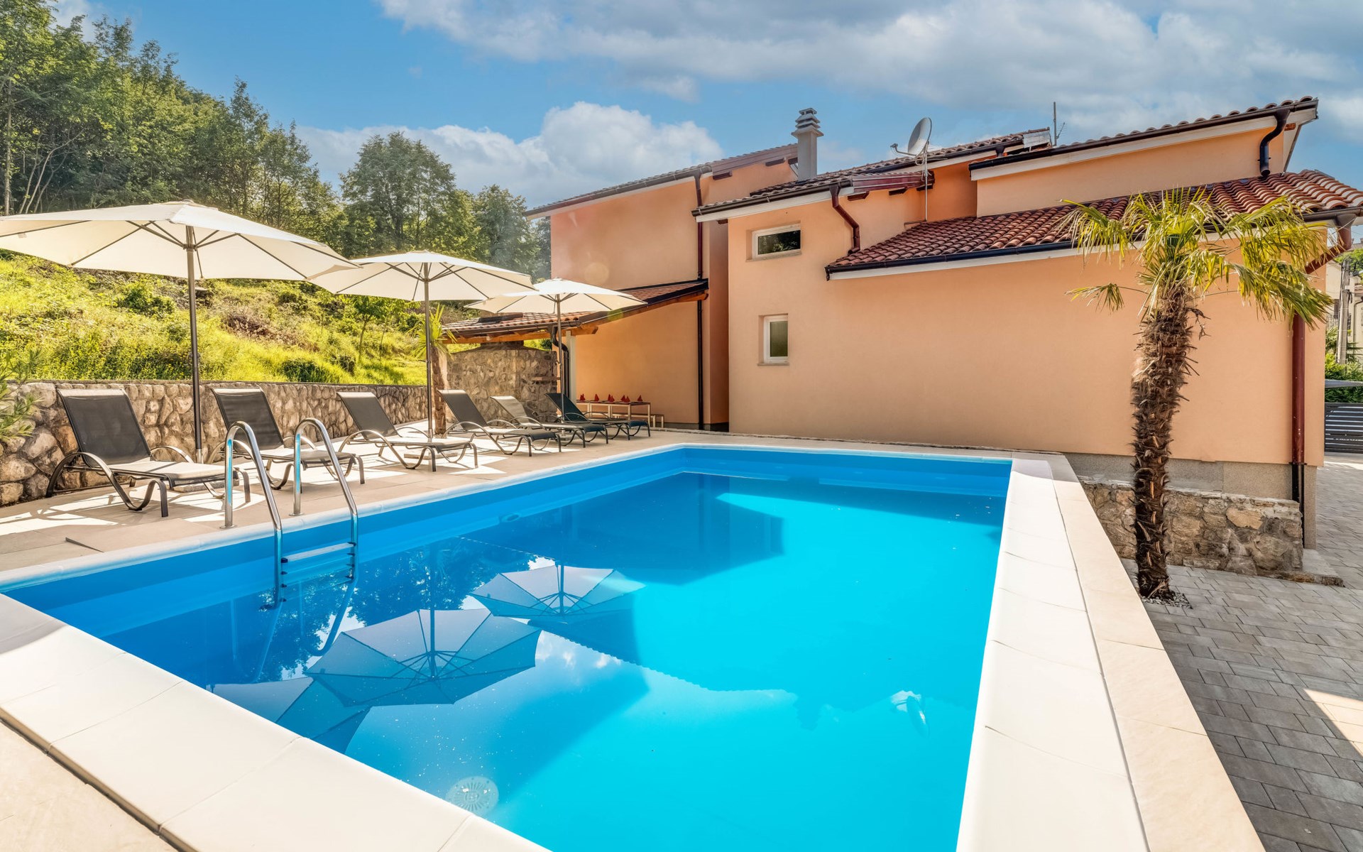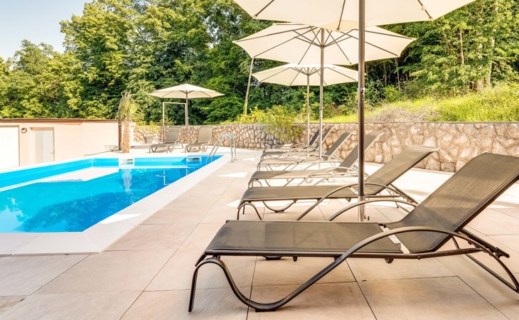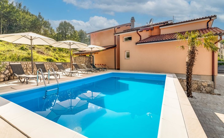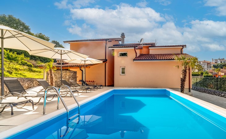 Mihelići 6 km from Opatija: 2-family house "Matej". In the hamlet Mihelići 3.5 km from the centre of Matulji, 5.5 km from the centre of Opatija, in a quiet, sunny, elevated position residential area (villas), 5.5 km from the sea. For shared use: property 700 m2 (fenced) with lawn and flowers, swimming pool heated (7 x 4 m, depth 150 cm, seasonal availability: 15.May. - 15.Oct.) with internal staircase. Outdoor shower, poolhouse, terrace, garden furniture, barbecue. In the house: internet access, hot tub (all included), table football, central heating system, air conditioning. Parking (for 2 cars) at the house on the premises. Shop 800 m, supermarket 3 km, restaurant 800 m, bar 750 m, bus stop 700 m, pebble beach 5.5 km, concrete beach 5.5 km. Groups of teenagers on request only.