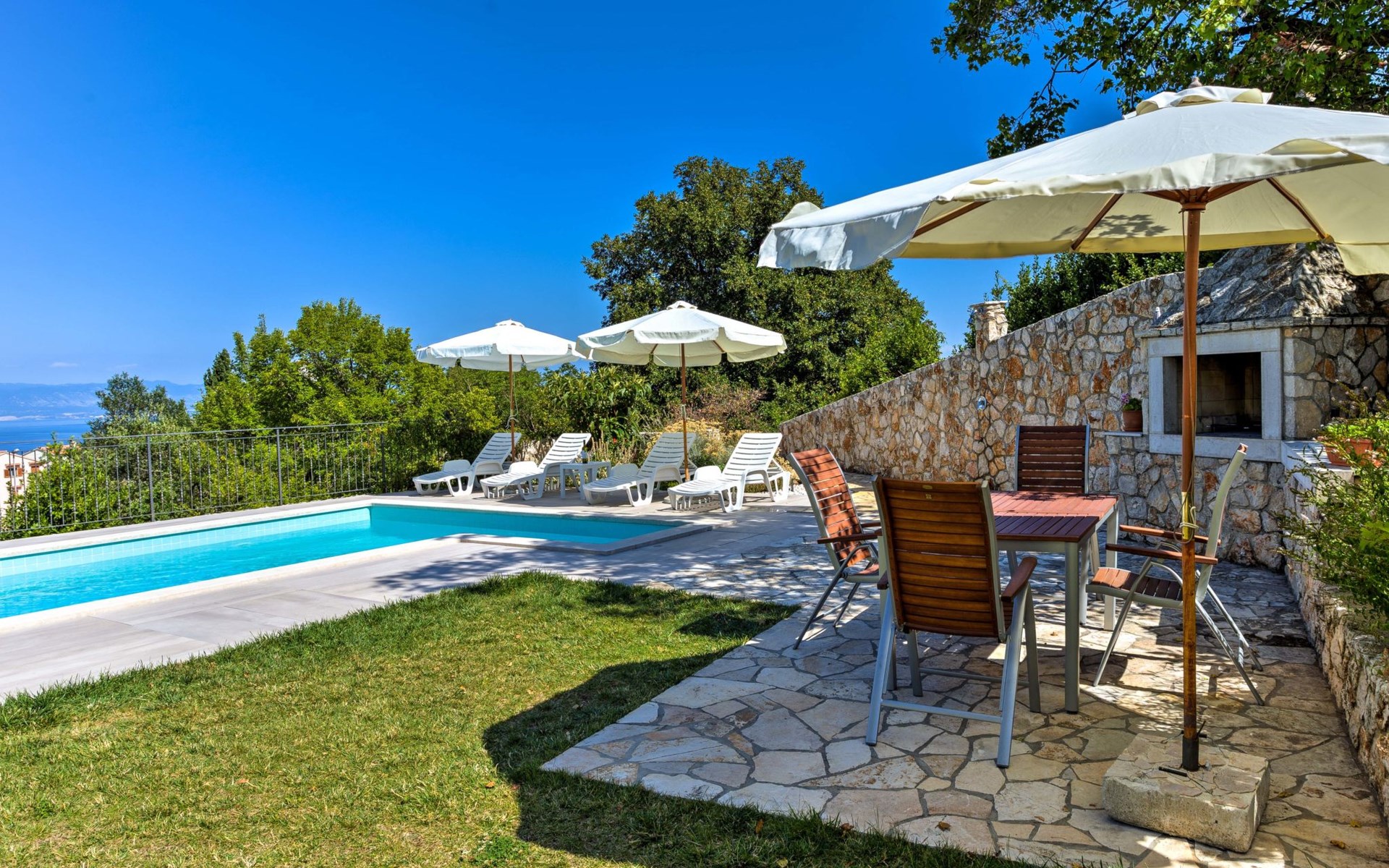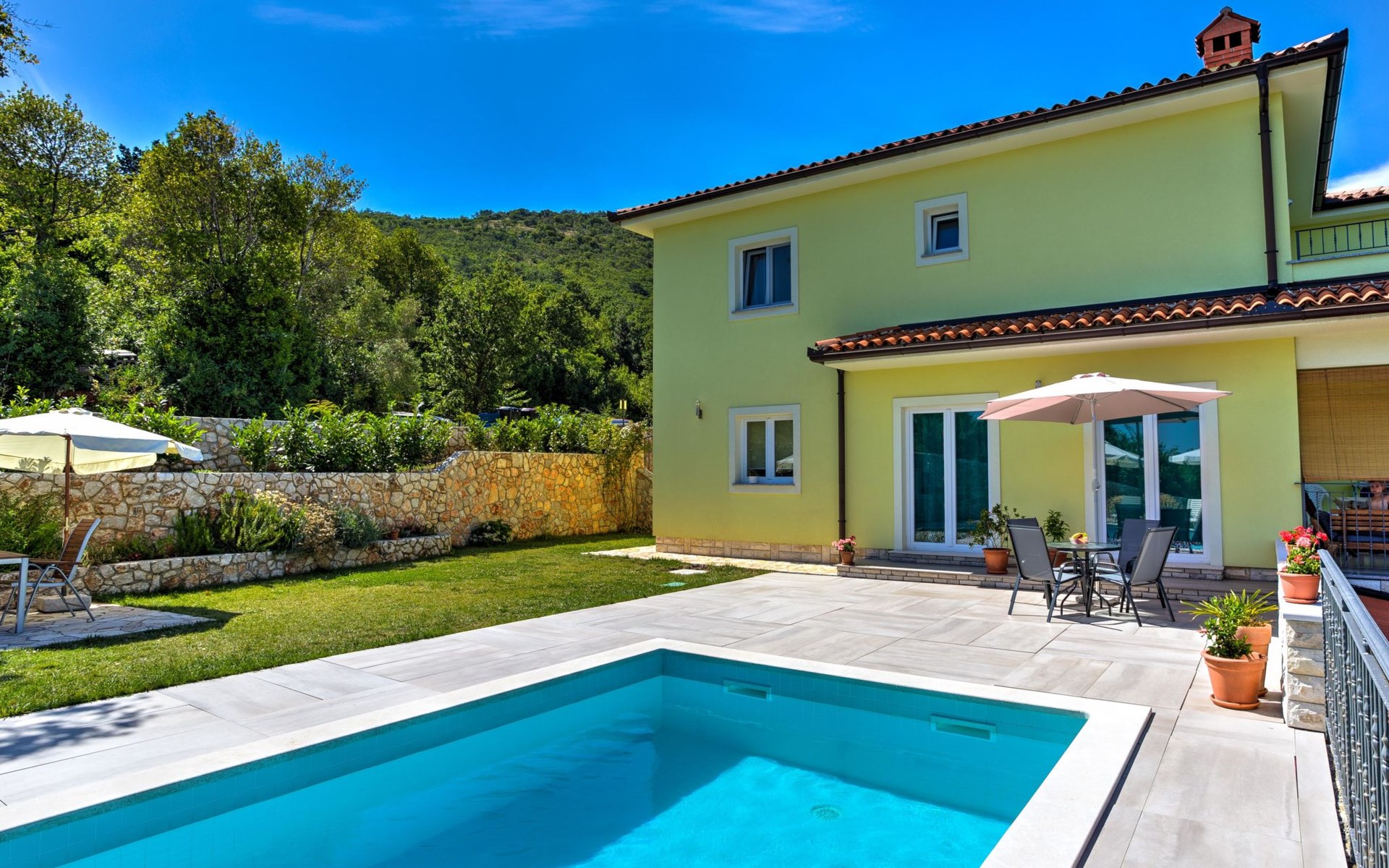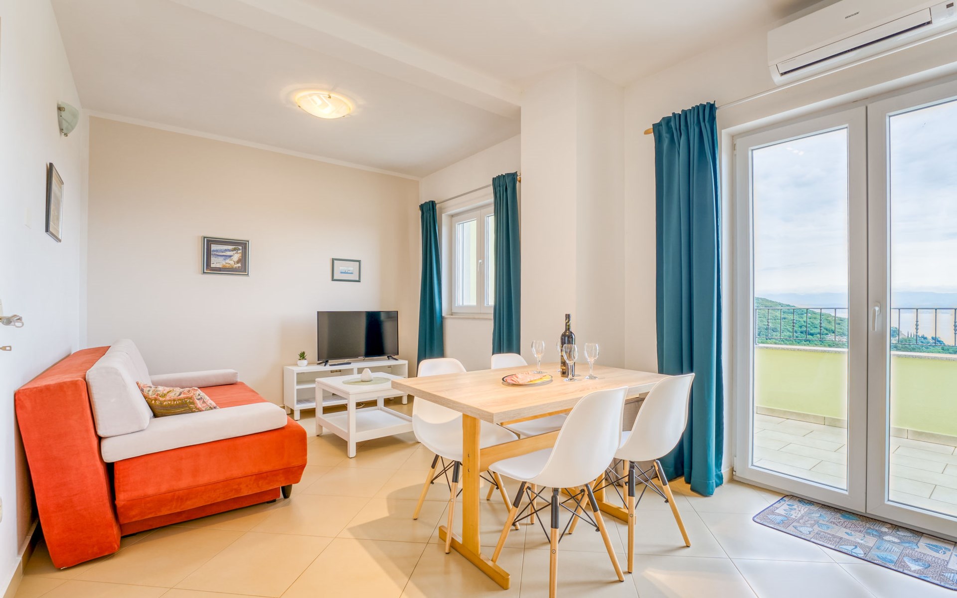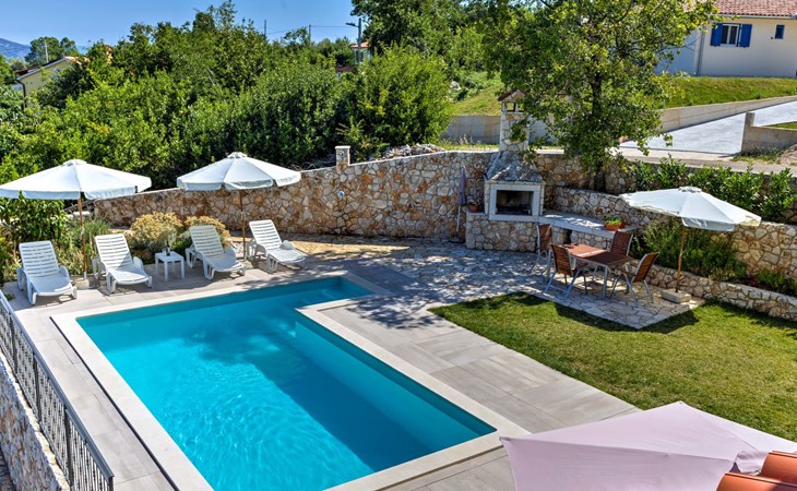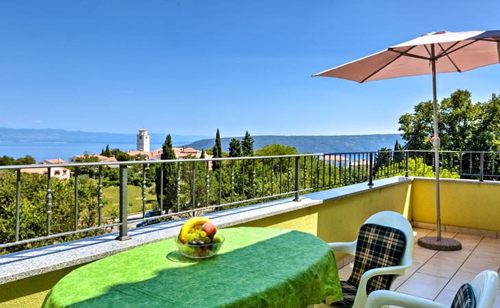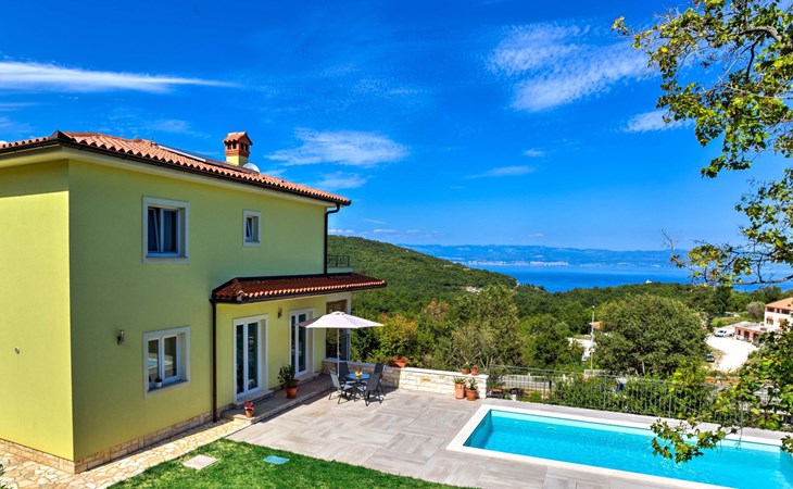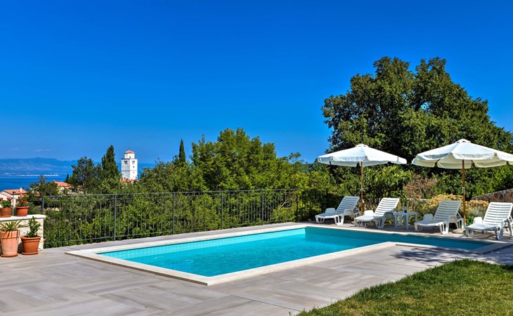 Beautiful 3-family house "Villa Tara". Above Brseč 400 m from the centre of Brseč, 23 km from the centre of Opatija, in a quiet, elevated position, along the wooded area, 1.3 km from the sea, 1.3 km from the beach, in a cul-de-sac, in the countryside. For shared use: property 1'000 m2, lawn 60 m2, swimming pool angular (7 x 3 m, 24 m2, depth 160 cm, seasonal availability: 01.May. - 15.Oct.) with internal staircase. Garden furniture, barbecue. In the house: internet access. Roofed, parking at the house on the premises. Shop 400 m, restaurant 350 m, bus stop 200 m, pebble beach 1.3 km. Nearby attractions: Nature park Učka 4 km.