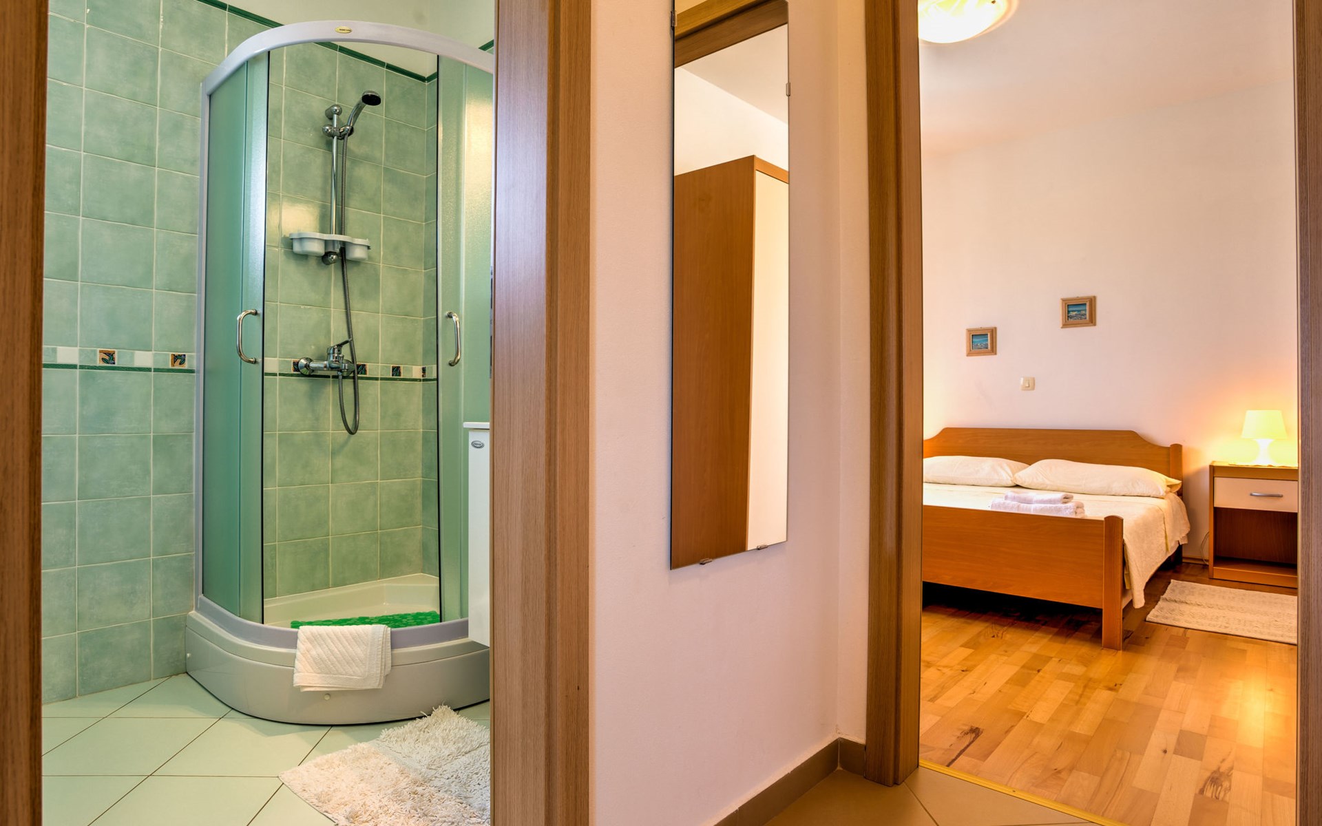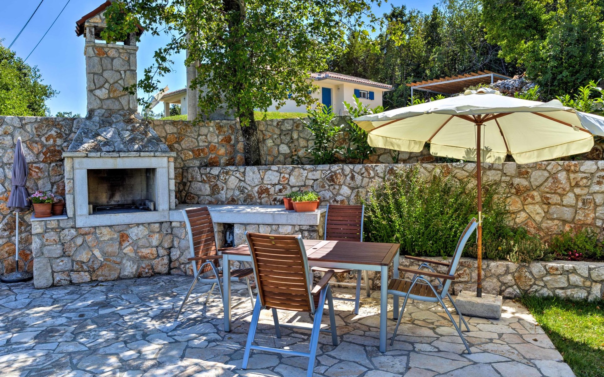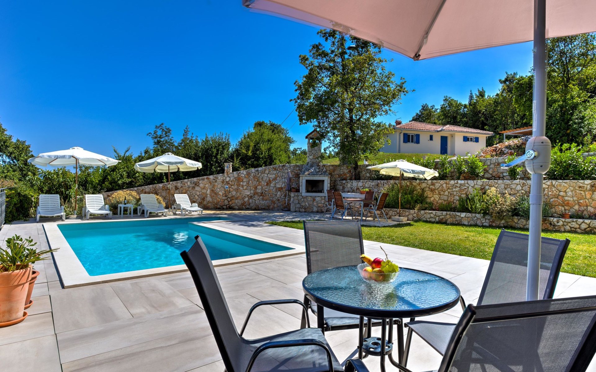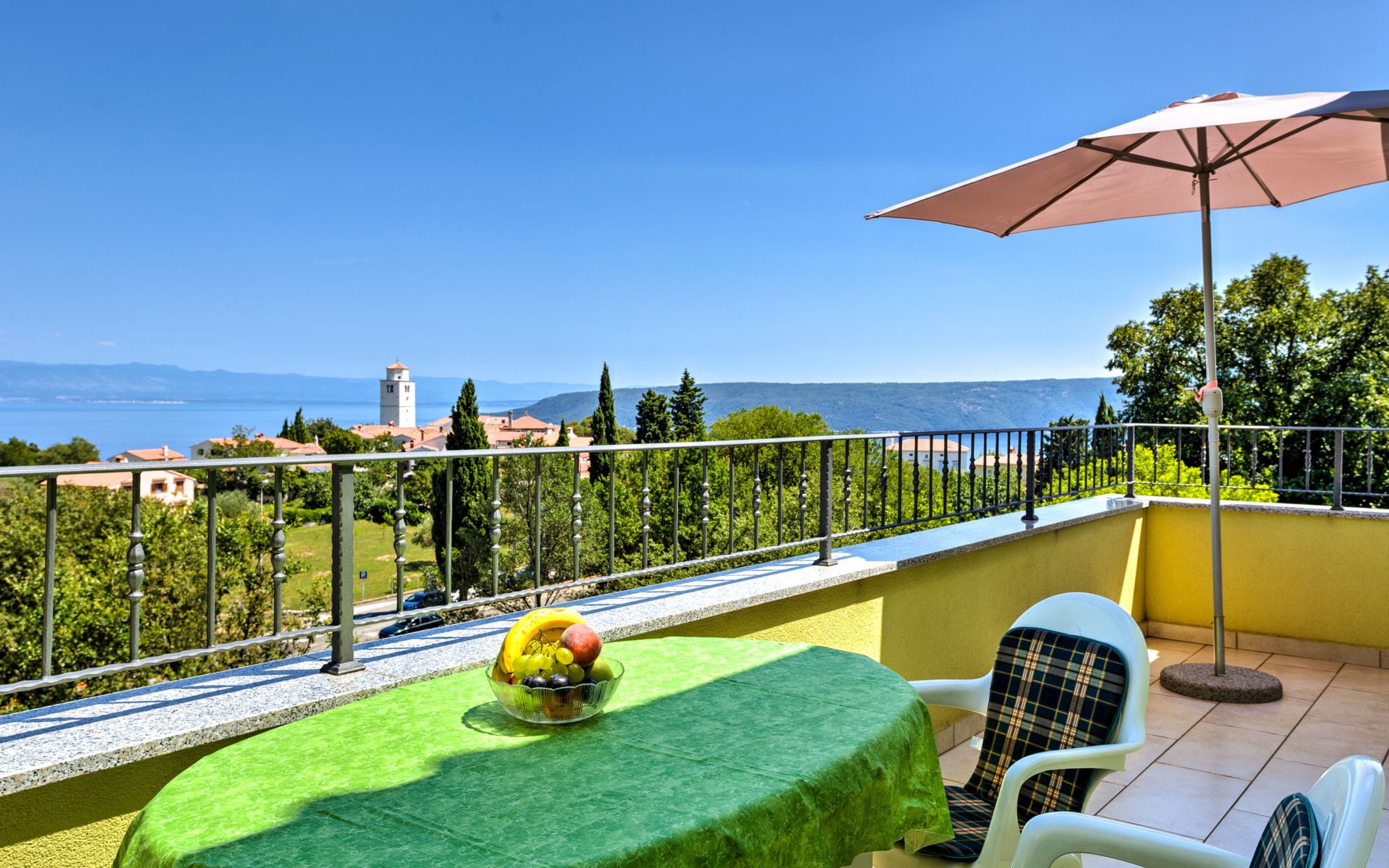 Beautiful 3-family house "Villa Tara". Above Brseč 400 m from the centre of Brseč, 23 km from the centre of Opatija, in a quiet, elevated position, along the wooded area, 1.3 km from the sea, 1.3 km from the beach, in a cul-de-sac, in the countryside. For shared use: property 1'000 m2, lawn 60 m2, swimming pool angular (7 x 3 m, 24 m2, depth 160 cm, seasonal availability: 01.May. - 15.Oct.) with internal staircase. Garden furniture, barbecue. In the house: internet access. Roofed, parking at the house on the premises. Shop 400 m, restaurant 350 m, bus stop 200 m, pebble beach 1.3 km. Nearby attractions: Nature park Učka 4 km.