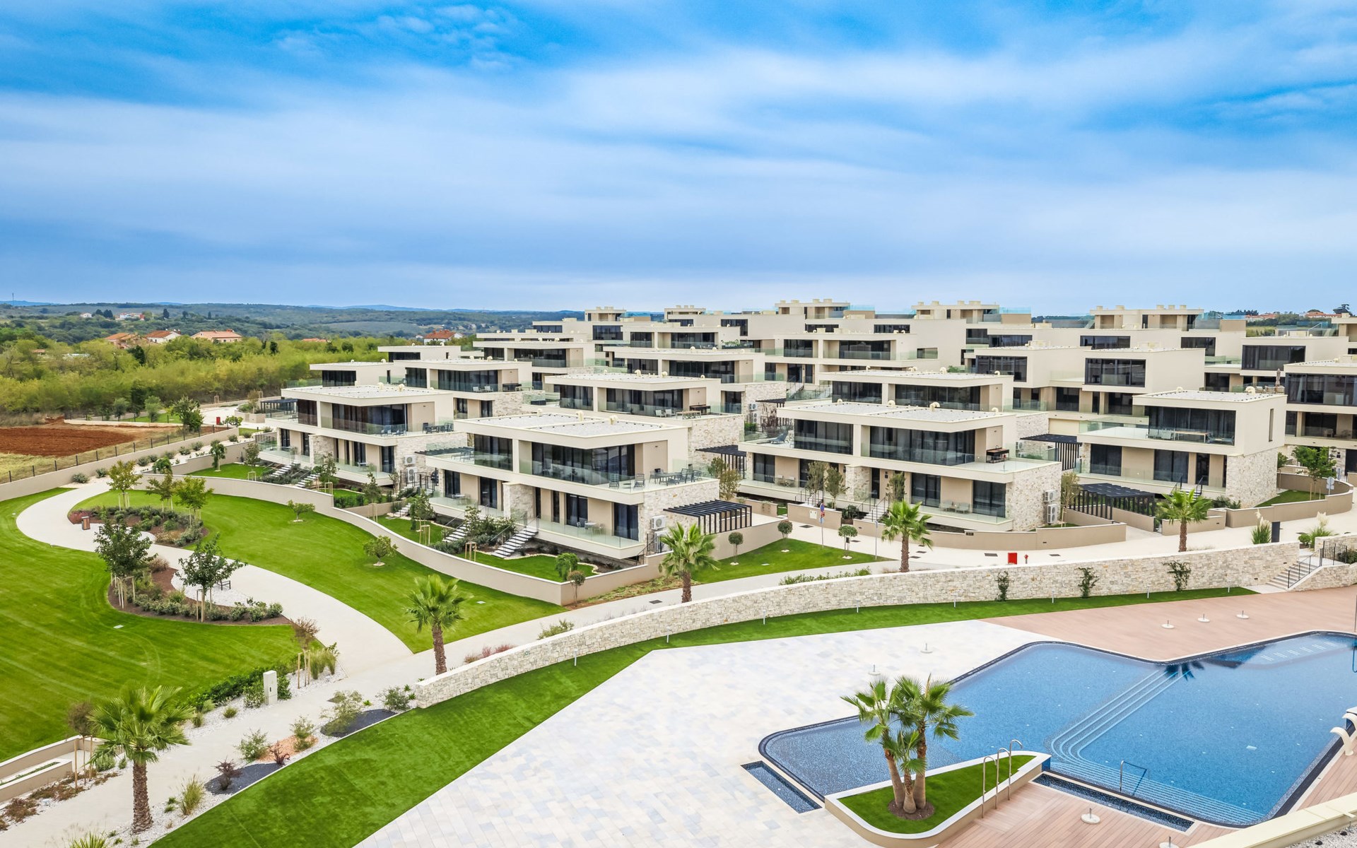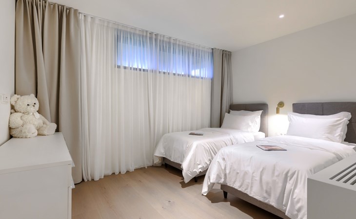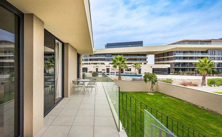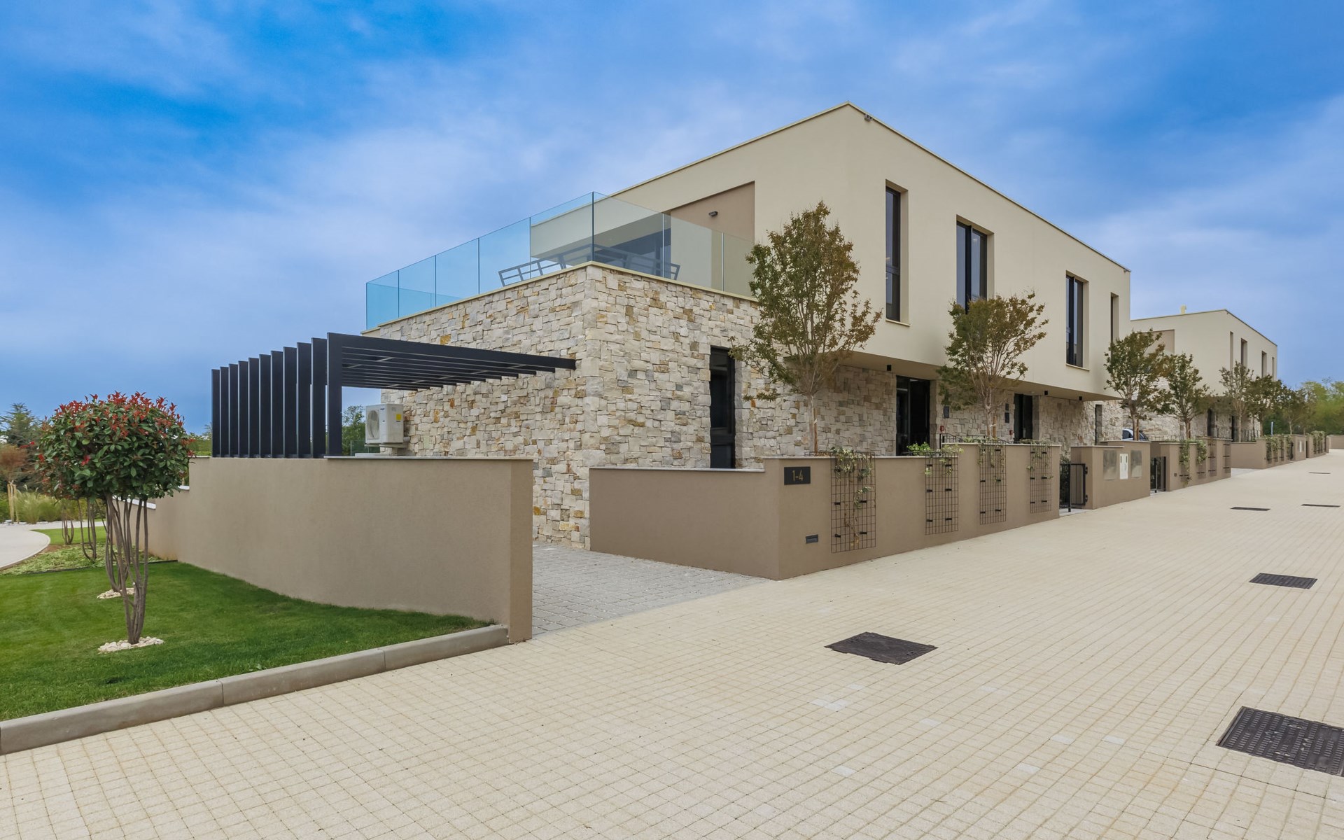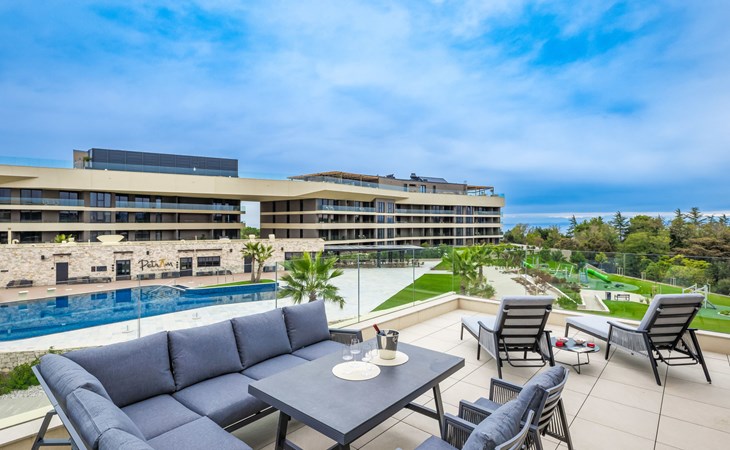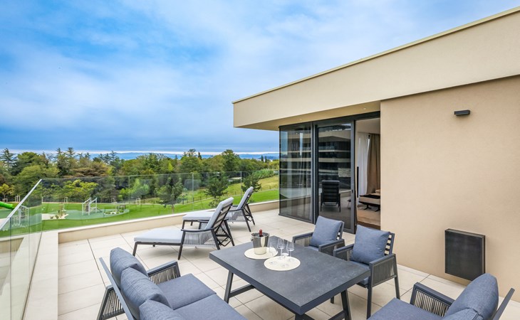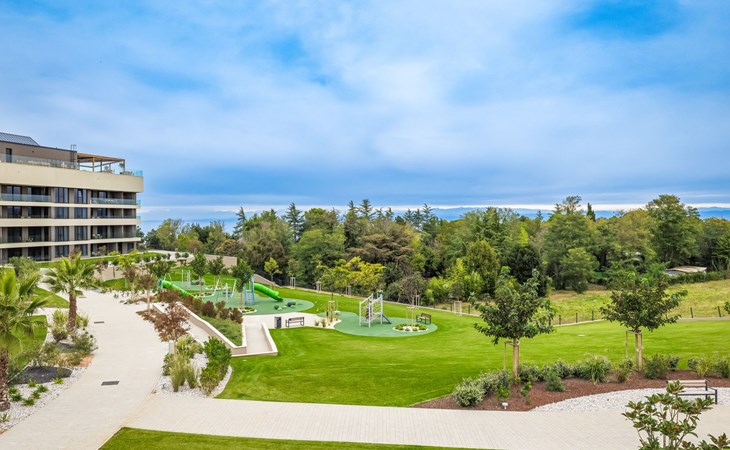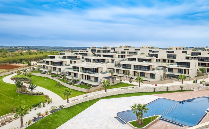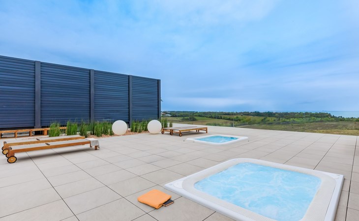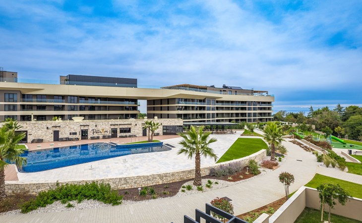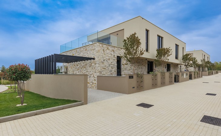 Semi-detached house "Semi-detached Villas Crveni vrh", built in 2023. 1.5 km from the centre of Savudrija, 10 km from the centre of Umag, in a quiet position on a slope, residential area (villas), 500 m from the sea. For shared use: property with lawn, 2 swimming pools, indoor pool (105 m diameter, depth 50 - 140 cm, seasonal availability: 01.Jan. - 31.Dec.) with internal staircase. Unconventional pool shape. Shower/WC in the pool area, children's pool, tennis (extra), children's playground. Private: property (fenced). In the complex: reception, restaurant, bar, bistro, internet access, sauna, fitness room, massage (extra). Hot tub, relaxation room, spa area, playroom, shopping facilities, lift, sun terrace. Parking at the house on the premises. Shop 1 km, supermarket 10 km, bus stop 8 km, railway station 33 km, sandy beach 5 km pebble beach 2 km, rocky beach 500 m. Golf course (18 hole) 2 km, tennis 500 m, walking paths from the house 100 m. Please note: 24hr guard. The photograph shows a typical example. Neighbourhood highly sensitive to noise. Quietness and good behaviour expected.