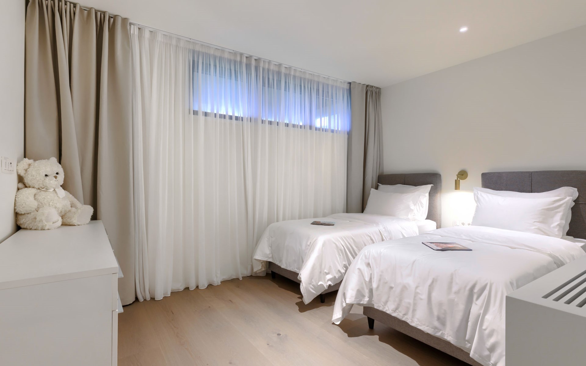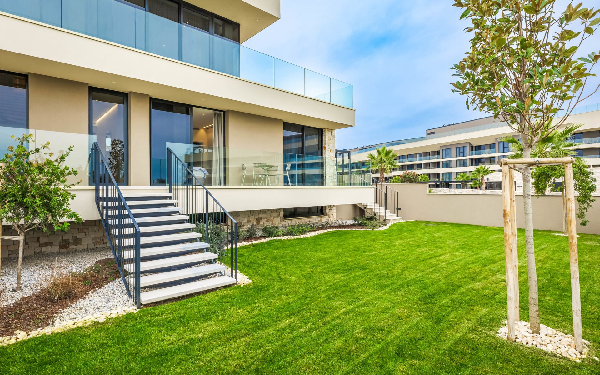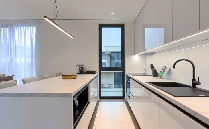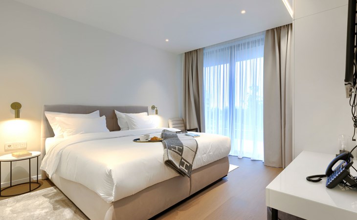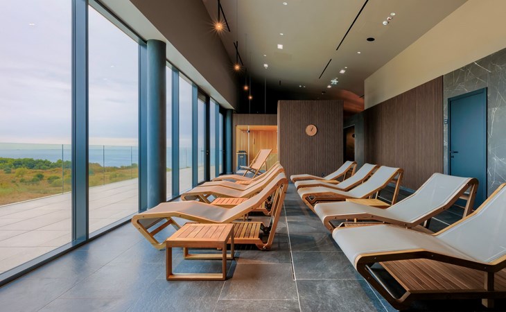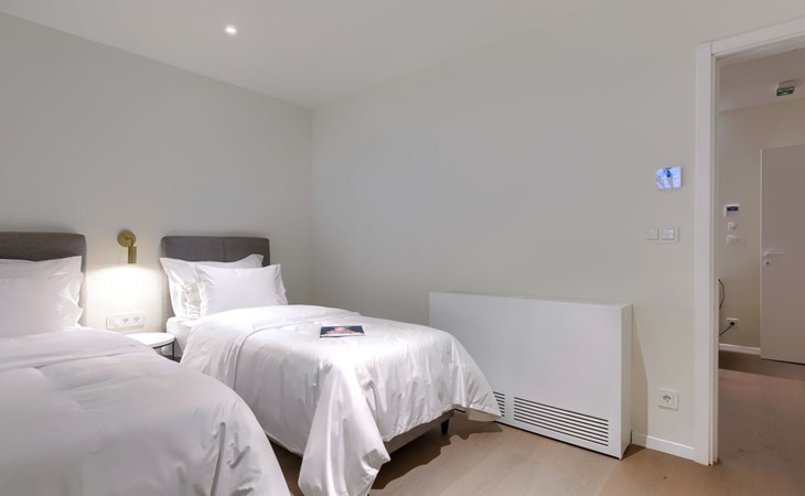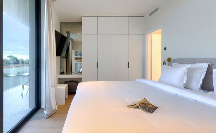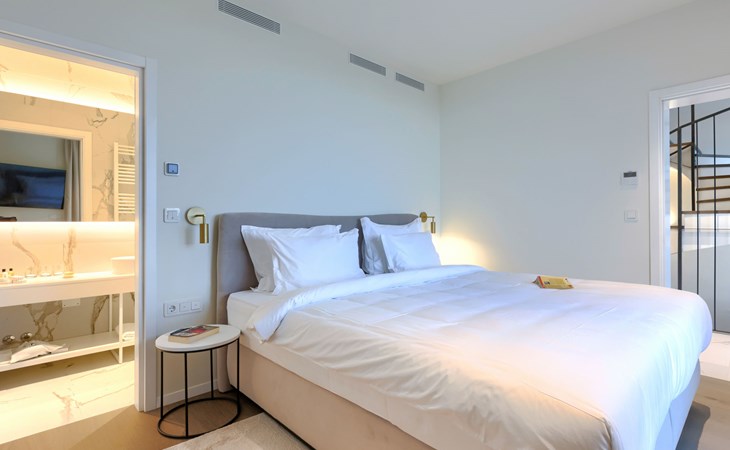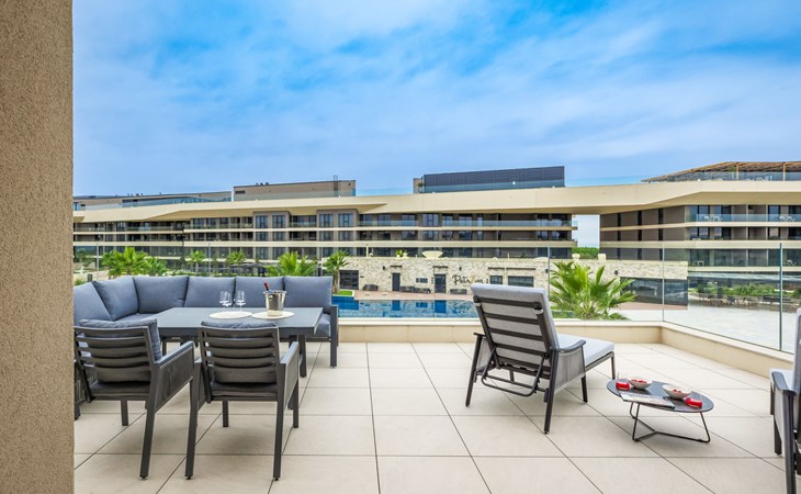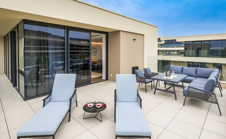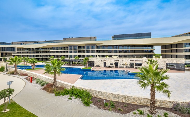 Semi-detached house "Semi-detached Villas Crveni vrh", built in 2023. 1.5 km from the centre of Savudrija, 10 km from the centre of Umag, in a quiet position on a slope, residential area (villas), 500 m from the sea. For shared use: property with lawn, 2 swimming pools, indoor pool (105 m diameter, depth 50 - 140 cm, seasonal availability: 01.Jan. - 31.Dec.) with internal staircase. Unconventional pool shape. Shower/WC in the pool area, children's pool, tennis (extra), children's playground. Private: property (fenced). In the complex: reception, restaurant, bar, bistro, internet access, sauna, fitness room, massage (extra). Hot tub, relaxation room, spa area, playroom, shopping facilities, lift, sun terrace. Parking at the house on the premises. Shop 1 km, supermarket 10 km, bus stop 8 km, railway station 33 km, sandy beach 5 km pebble beach 2 km, rocky beach 500 m. Golf course (18 hole) 2 km, tennis 500 m, walking paths from the house 100 m. Please note: 24hr guard. The photograph shows a typical example. Neighbourhood highly sensitive to noise. Quietness and good behaviour expected.