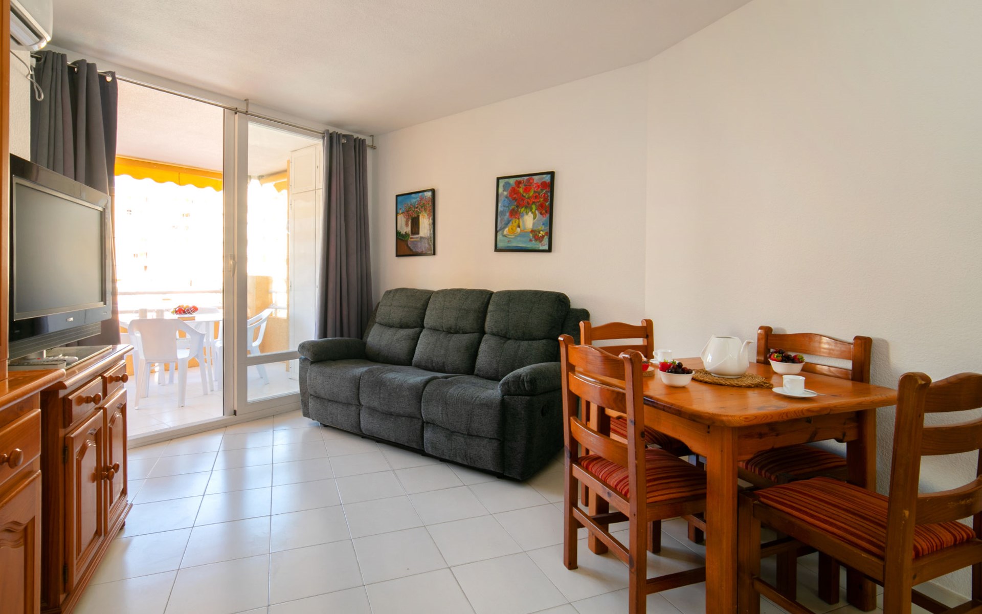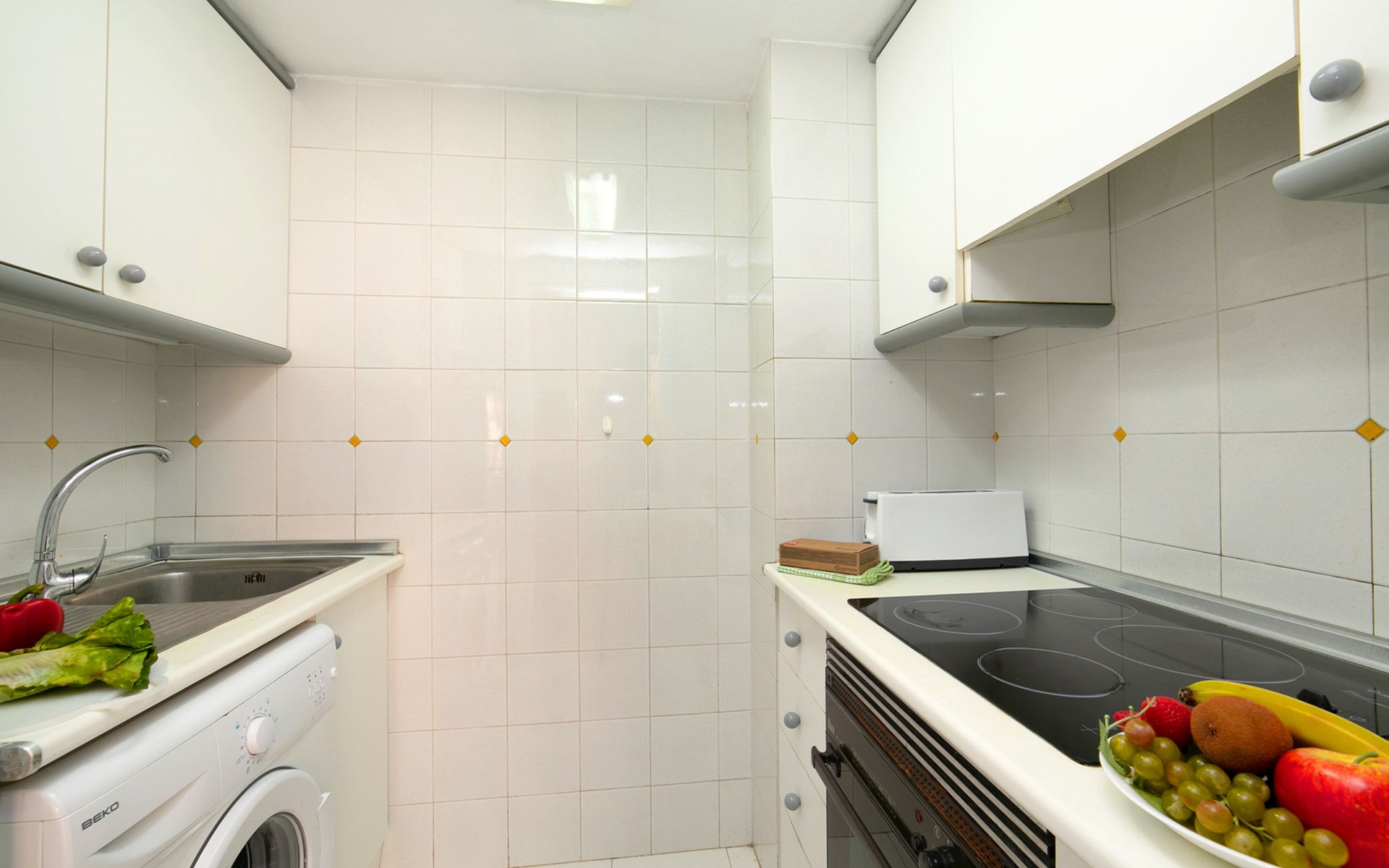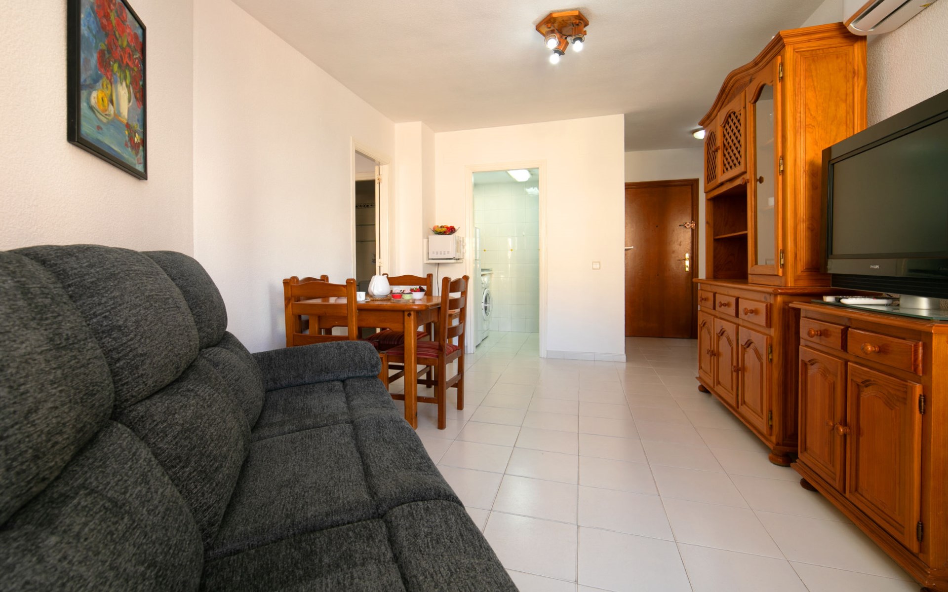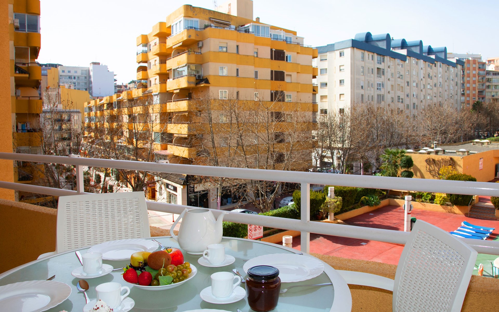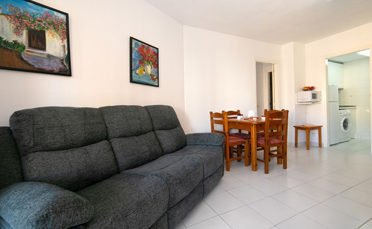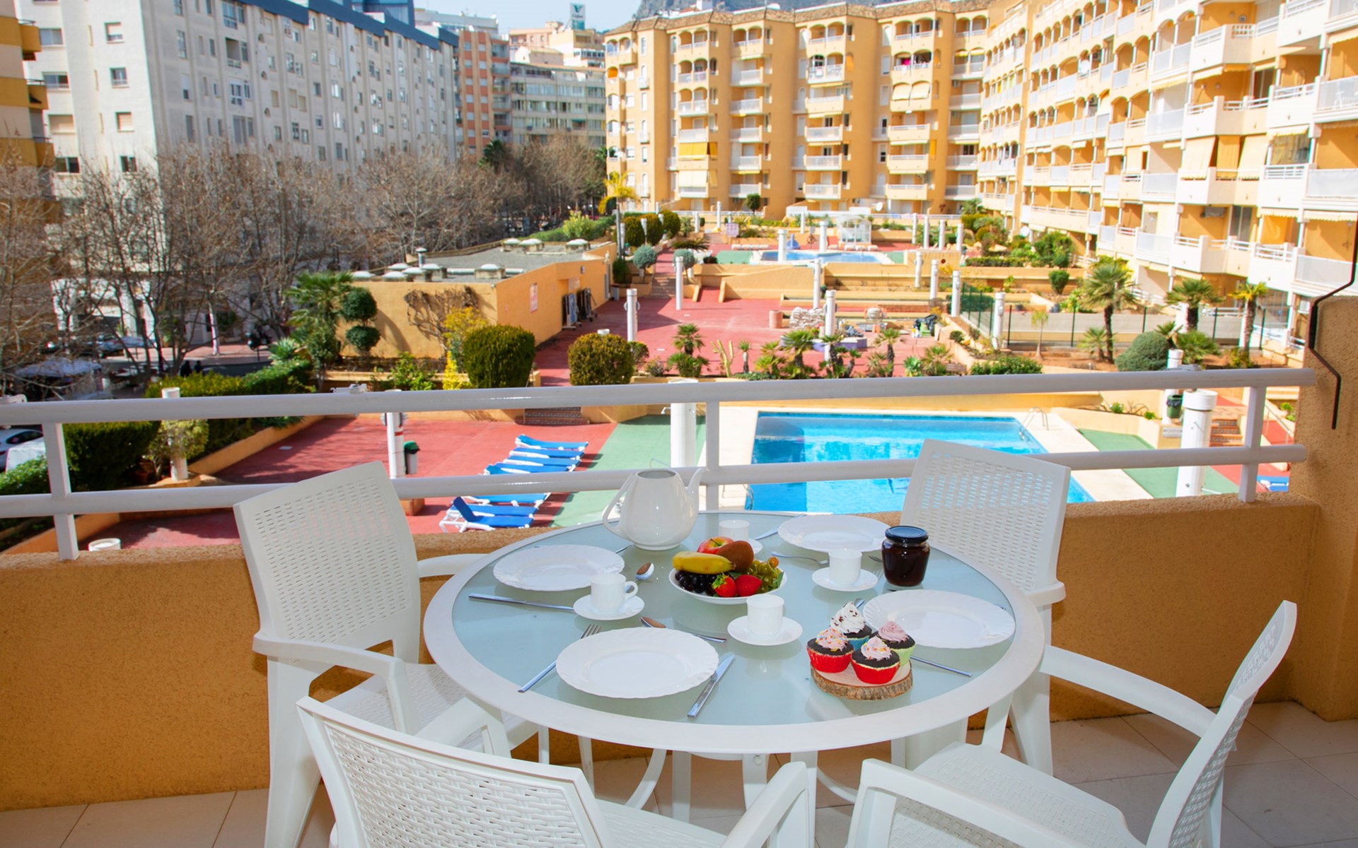 Apartment block "Apolo VII", 7 storeys. In the centre of Calpe, in a central position, 400 m from the sea. For shared use: garden, 2 swimming pools (seasonal availability: 01.May. - 30.Sep. pool opening hours: 10:00-21:00). Children's pool, outdoor shower, boccia, terrace. In the house: WiFi, sauna (extra). Fitness room (extra). Hot tub (extra). Table tennis (extra). Lift. Supermarket, shopping centre 400 m, restaurant, bar, café 10 m, bus stop, sandy beach 400 m. Nearby attractions: Aqualandia, Mundomar, Terra Mítica, Terra Natura, Benidorm Palace (Benidorm). Minigolf for children, Sauna, Squash and Ping Pong in the building (all EXTRA).