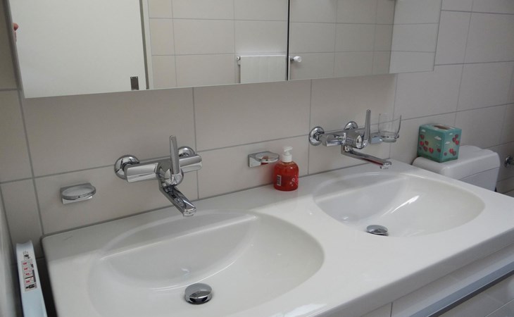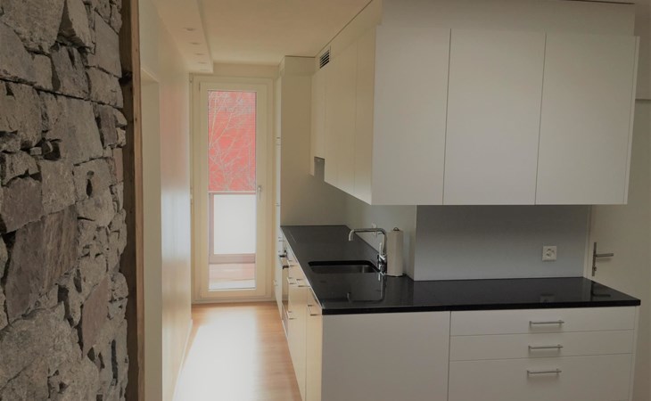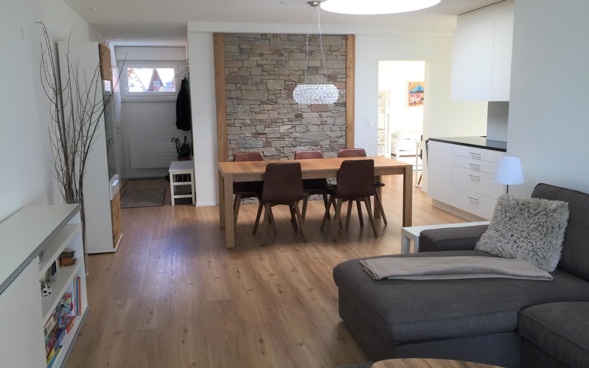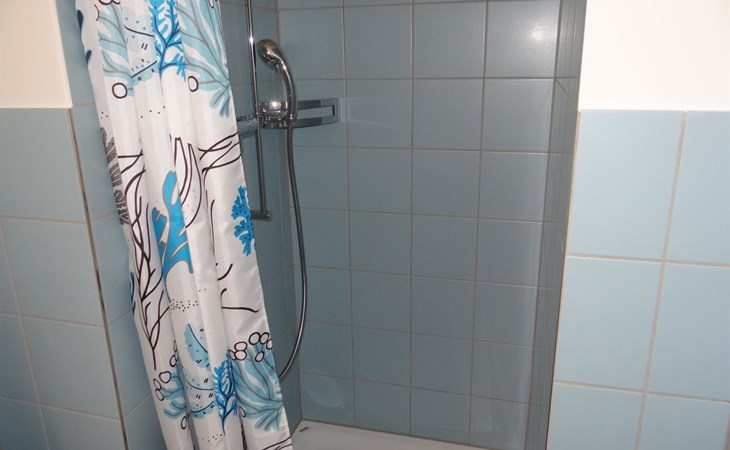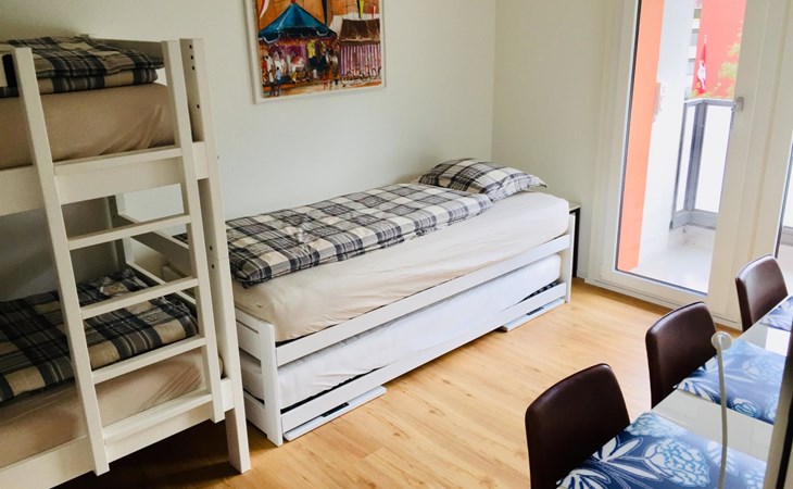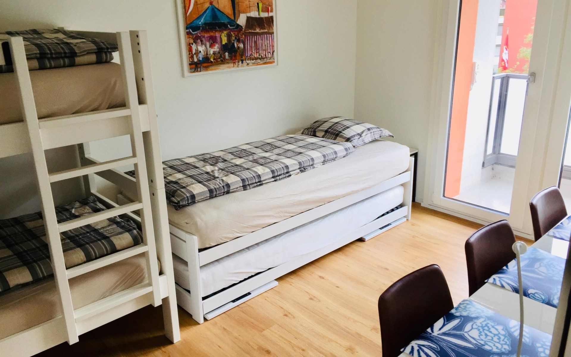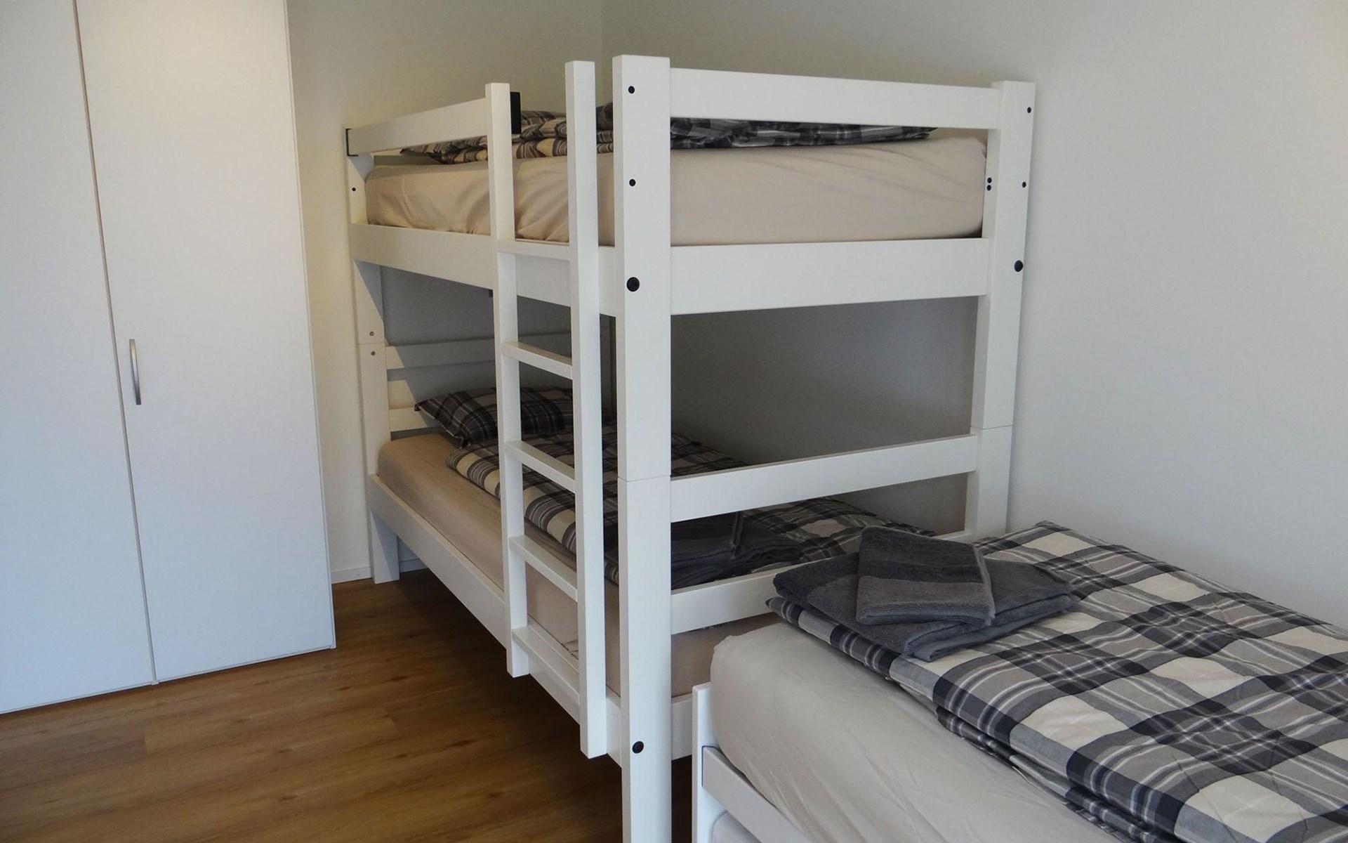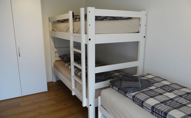 3-room apartment on the 3rd floor (75 m2): 1 double room and 1 triple room with bunk bed, open kitchen with living/dining room, bathroom with bathtub/WC and bathroom with shower/WC