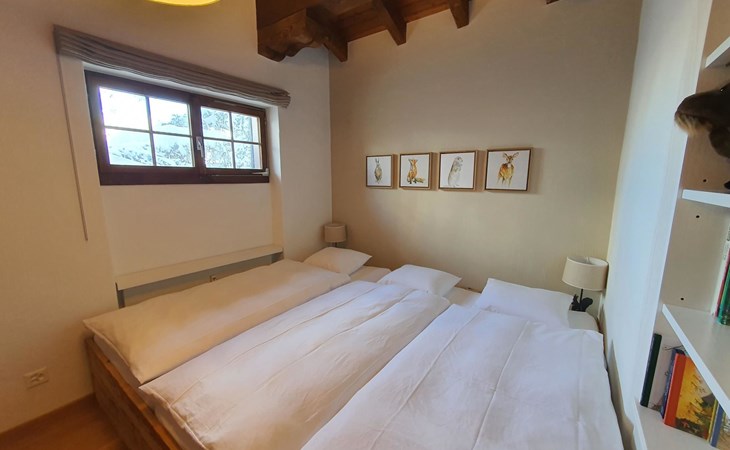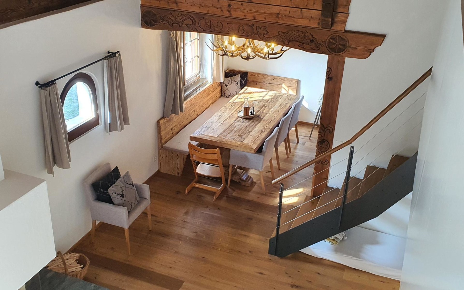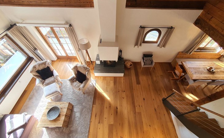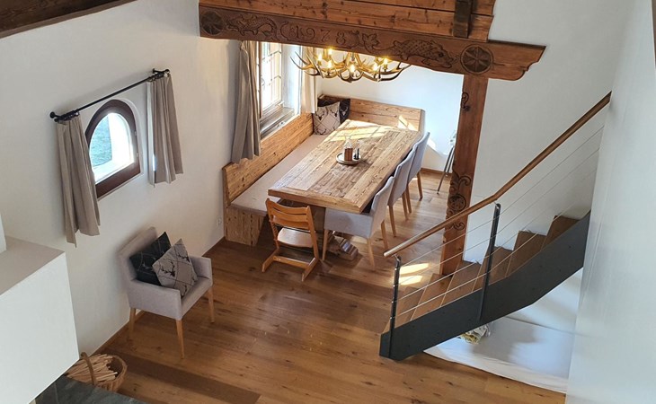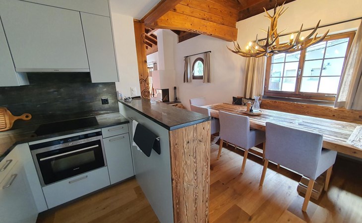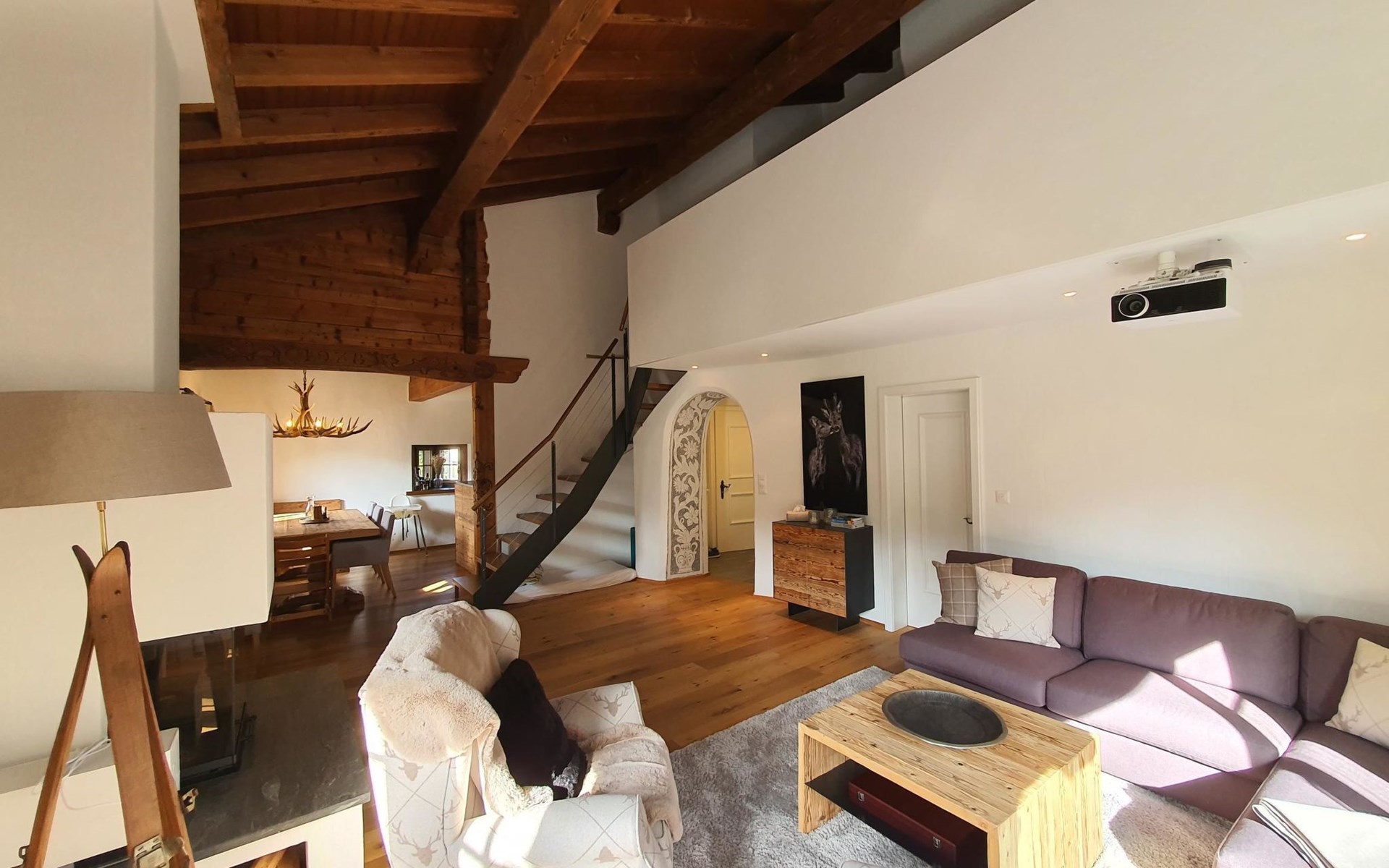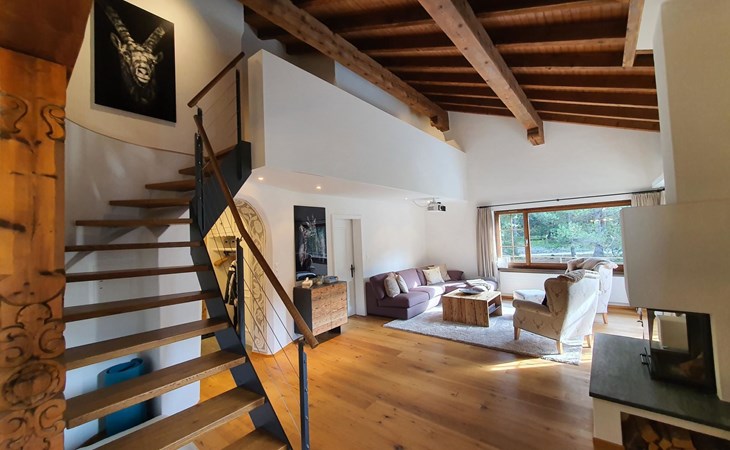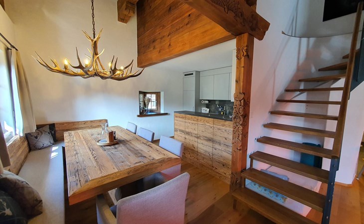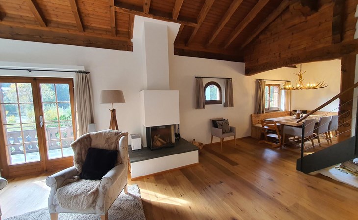 Spacious, bright living room with fireplace. Charming dining room with open kitchen. Large balcony. 1st floor: one bedroom (double bed 180x210) and en-suite bathroom incl. bathtub, next to the living room. Separate guest toilet available on this floor. 2nd floor: a gallery, two more bedrooms and another bathroom with shower available. These are a double bedroom (double bed 180x210) and a triple bedroom. Wooden beams, furniture made of old wood as well as the wooden floor convey warmth.