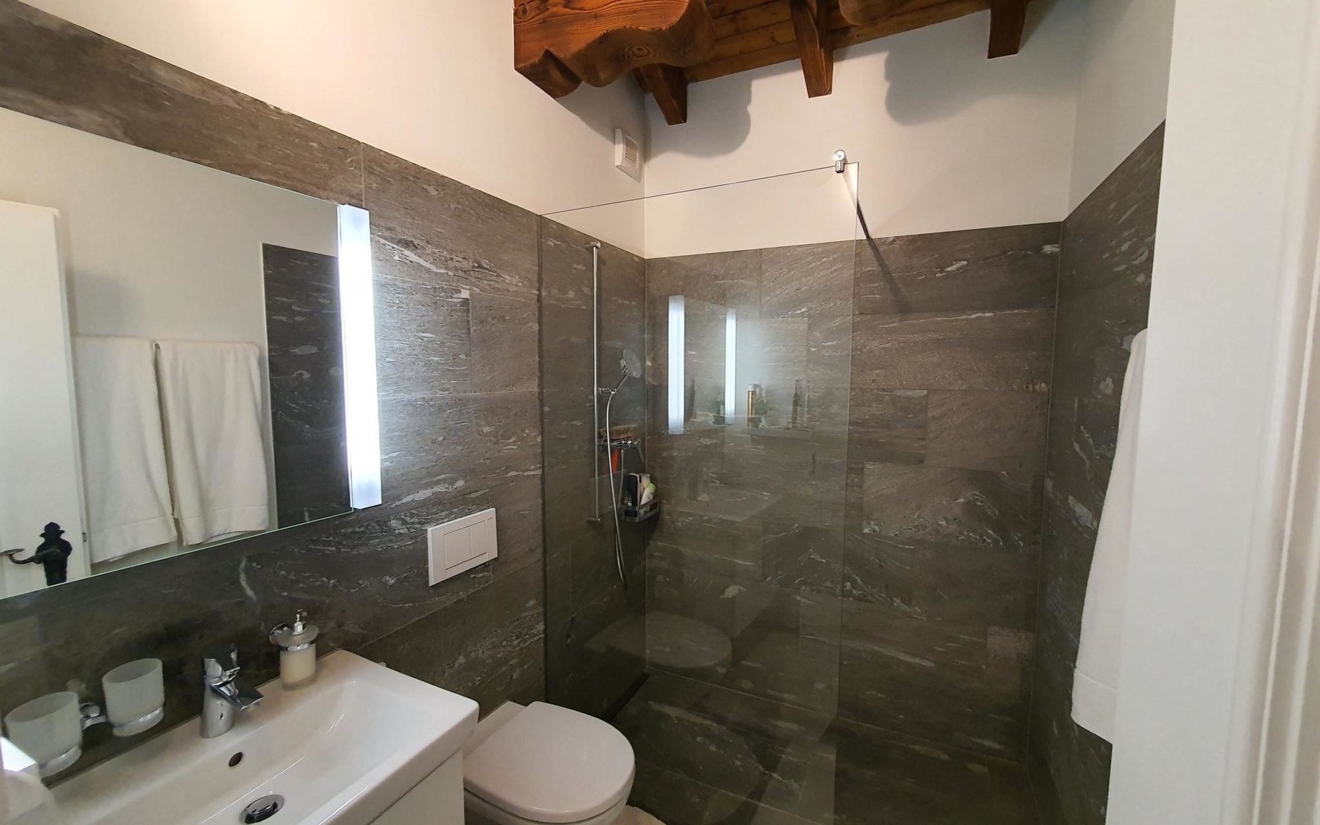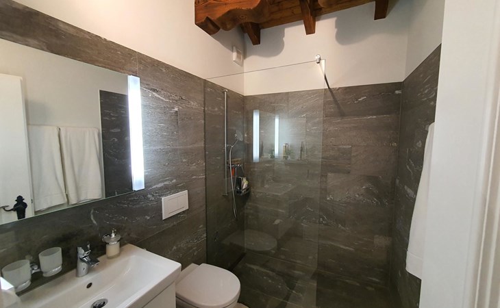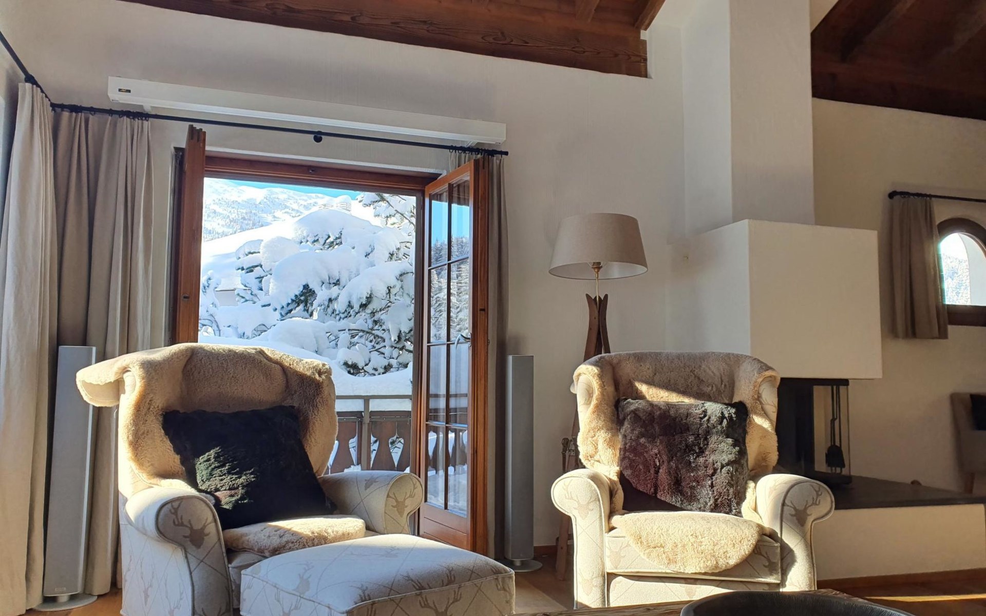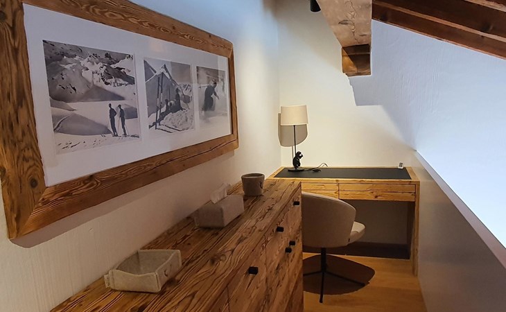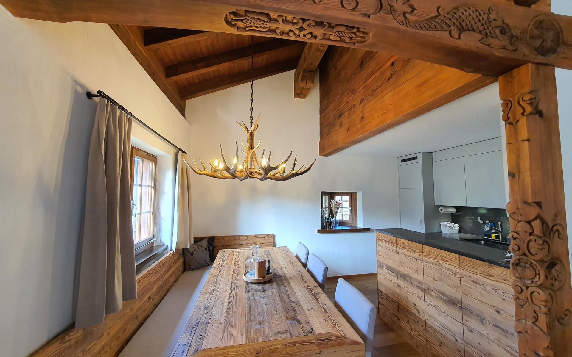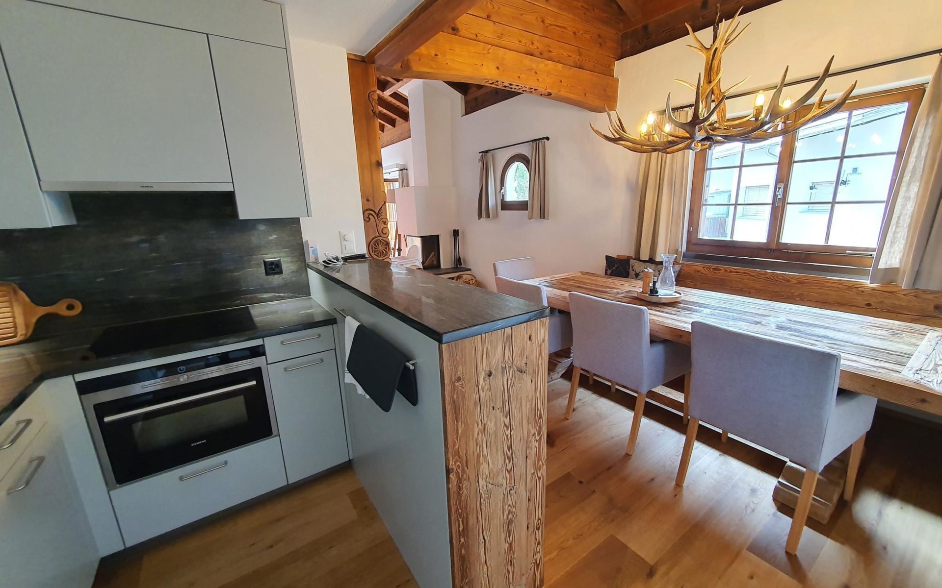 Spacious, bright living room with fireplace. Charming dining room with open kitchen. Large balcony. 1st floor: one bedroom (double bed 180x210) and en-suite bathroom incl. bathtub, next to the living room. Separate guest toilet available on this floor. 2nd floor: a gallery, two more bedrooms and another bathroom with shower available. These are a double bedroom (double bed 180x210) and a triple bedroom. Wooden beams, furniture made of old wood as well as the wooden floor convey warmth.
