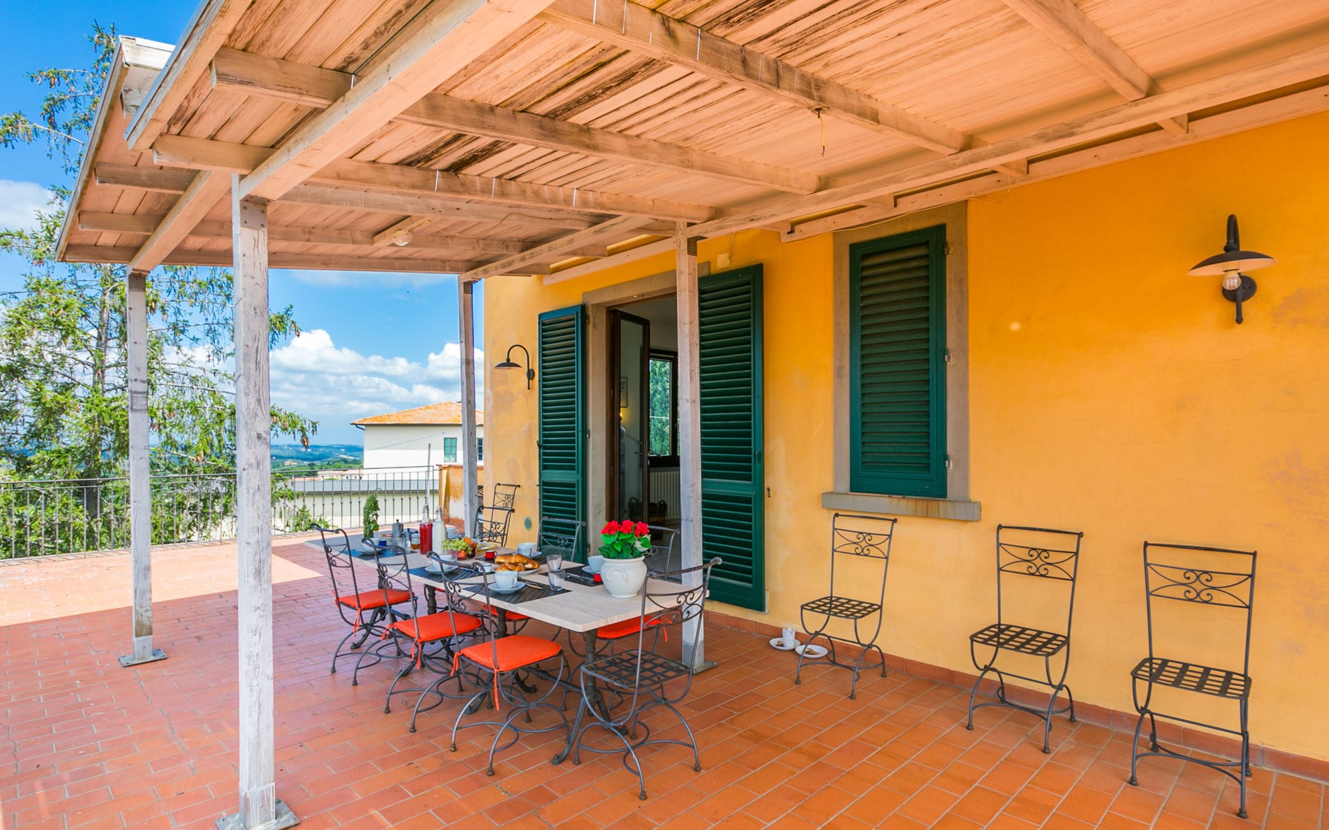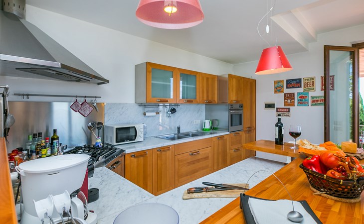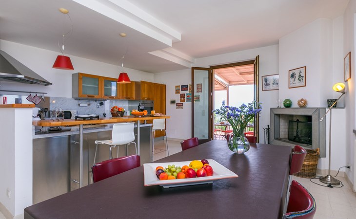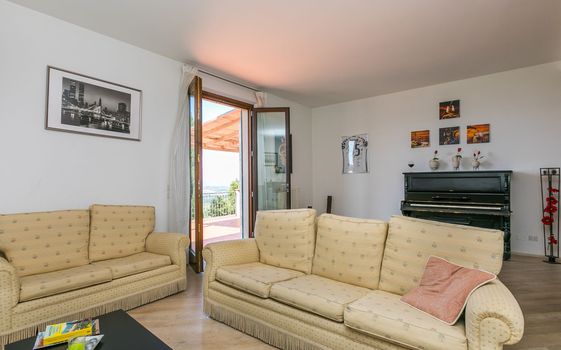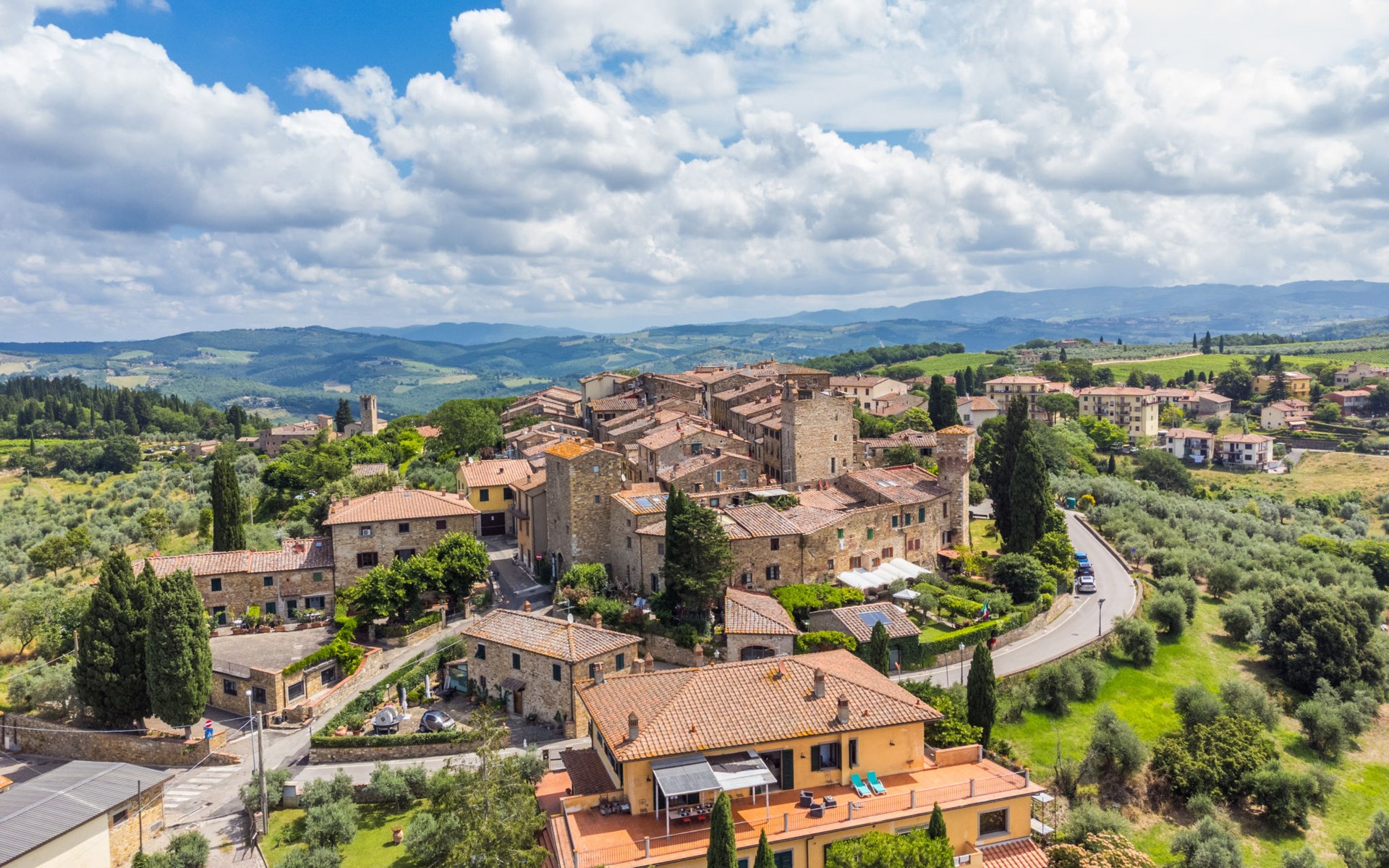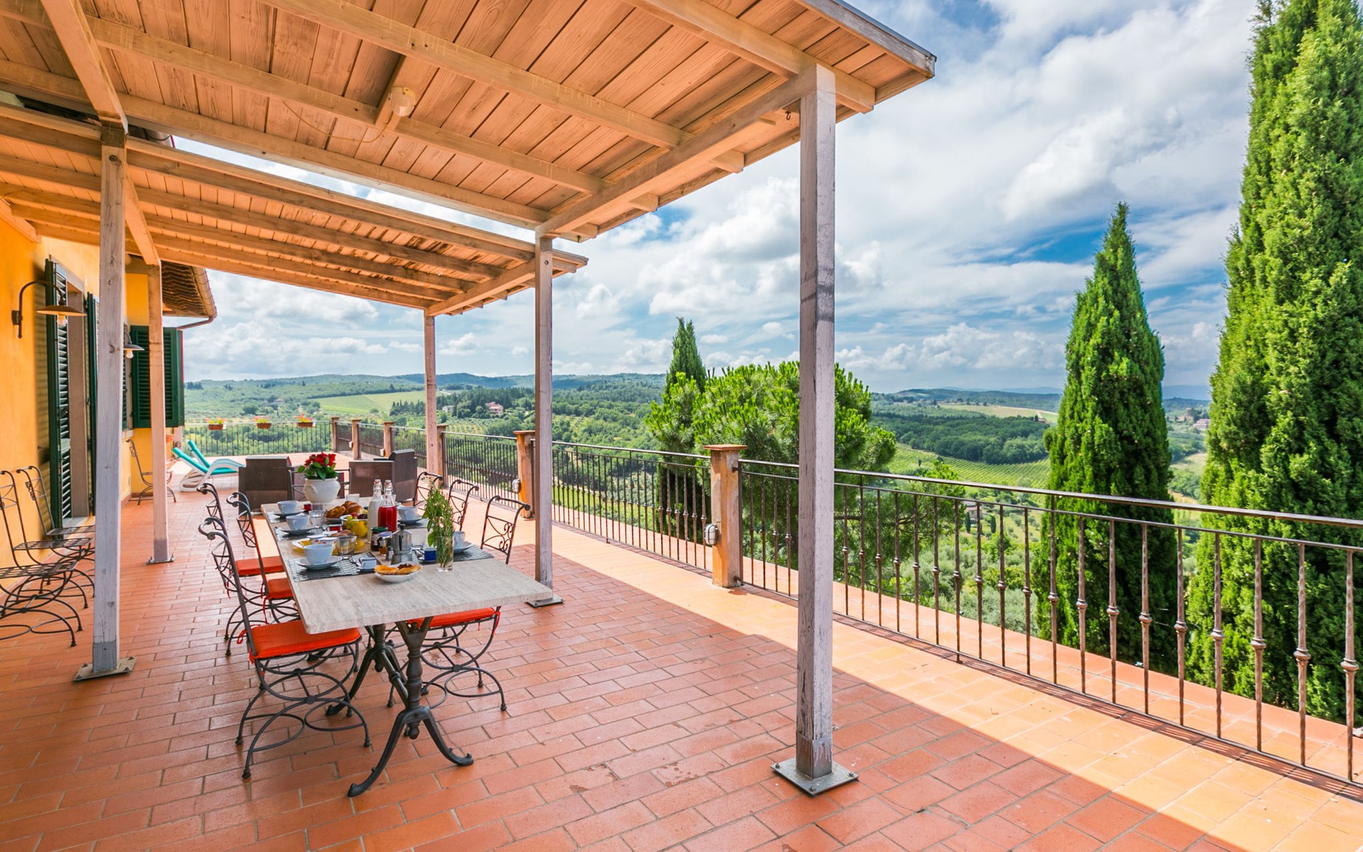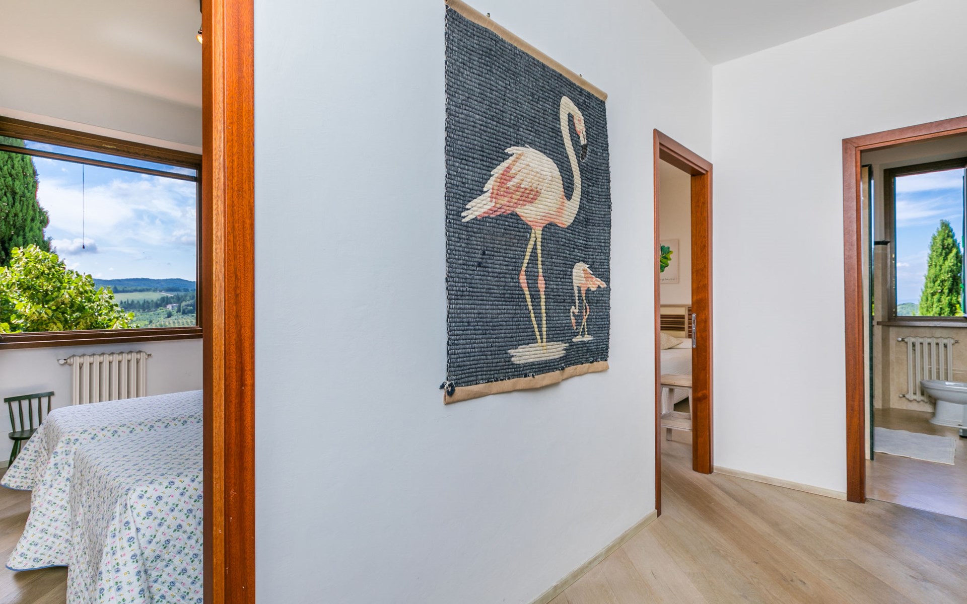 Large, comfortable house "Casa Lensi", 418 m a.s.l., 2 storeys, surrounded by fields and vineyards. 3 apartments in the property. In the resort 50 m from the centre of San Donato in Poggio, on the outskirts, 10 km from the centre of Castellina in Chianti, 20 km from the centre of Poggibonsi, in a central, sunny, elevated position on a slope, in the residential district, 96 km from the sea. For shared use: property (fenced). Private: terrace (100 m2), garden furniture, barbecue. In the house: burglar alarm system. Pre-arrival grocery service. Storeroom available. Parking (for 3 cars) at the house on the premises. Shop 100 m, grocery, supermarket 800 m, restaurant 100 m, bar, bakery, café, pedestrian zone 50 m, 3 minute walk to the centre, bus stop "San Donato" 300 m, railway station "Barberino-Zambra" 11 km, sandy beach "Cecina Mare" 96 km, outdoor swimming pool 7 km, indoor swimming pool 11 km. Tennis 4 km, walking paths from the house 100 m, children's playground 50 m, fishing possibilities 4 km. Nearby attractions: Firenze 30 km, San Gimignano 25 km, Siena 47 km, Greve in Chianti 19 km, Volterra 50 km. Please note: baby equipment (included). Groups of teenagers on request only. The owner lives in the same residence.