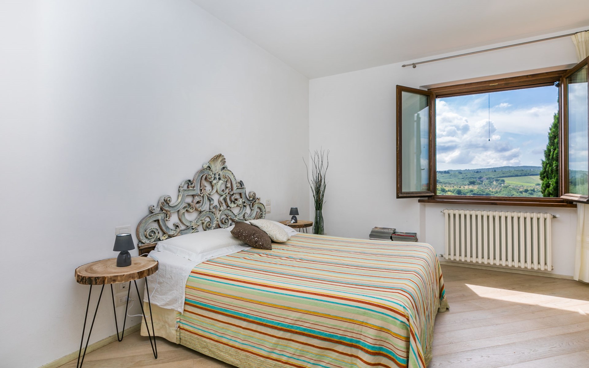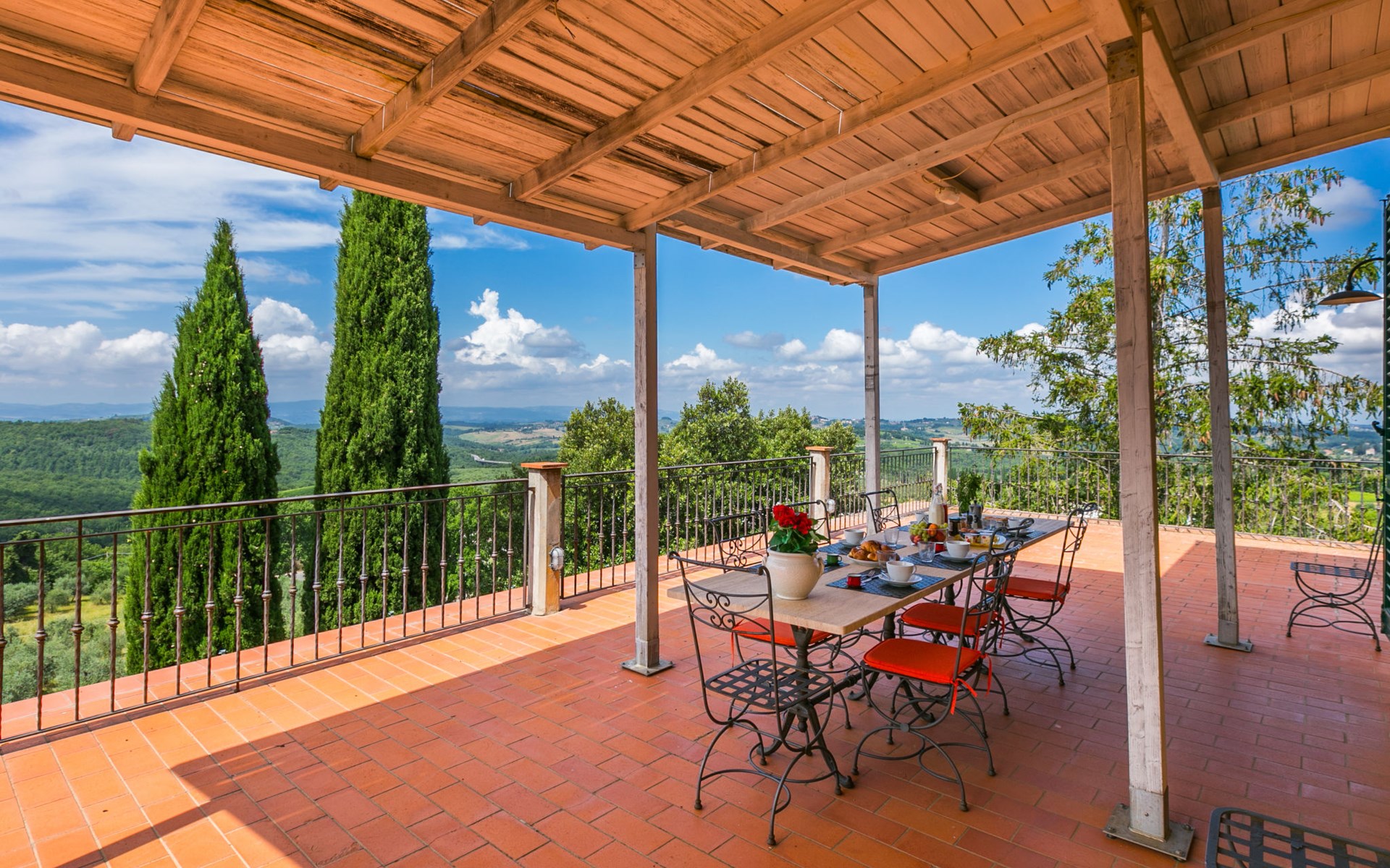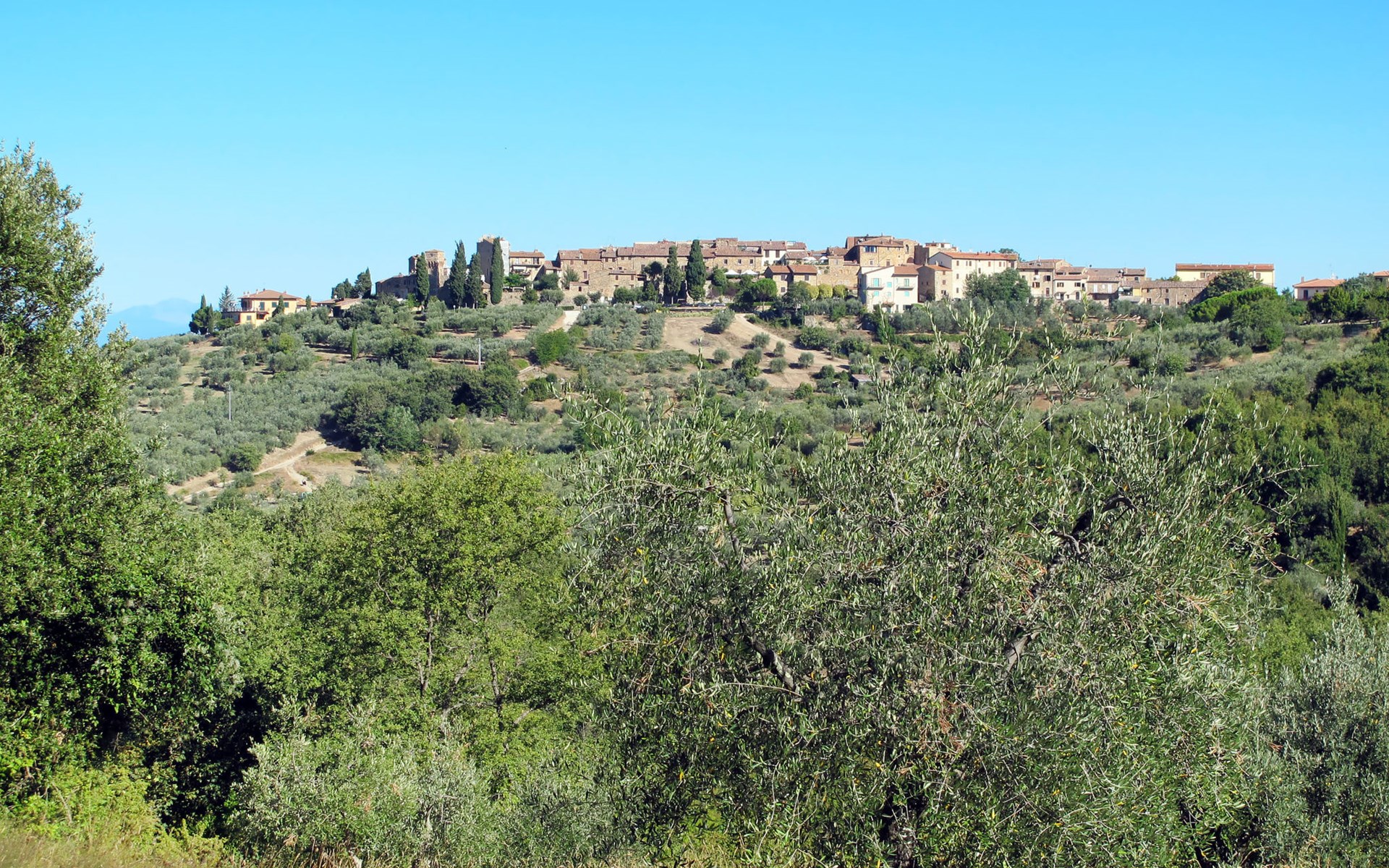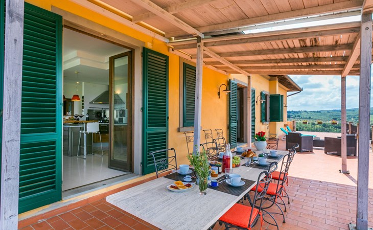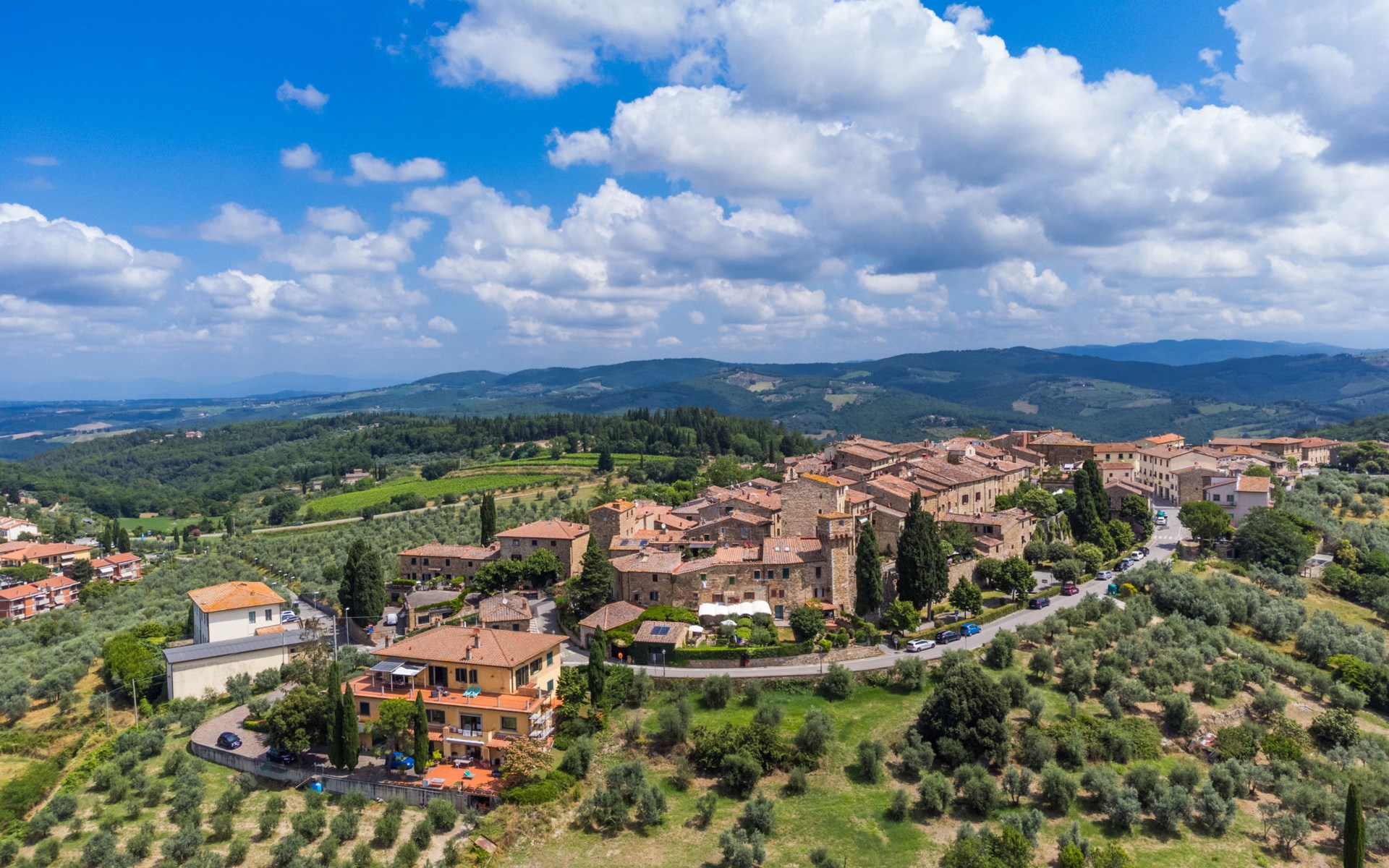 Large, comfortable house "Casa Lensi", 418 m a.s.l., 2 storeys, surrounded by fields and vineyards. 3 apartments in the property. In the resort 50 m from the centre of San Donato in Poggio, on the outskirts, 10 km from the centre of Castellina in Chianti, 20 km from the centre of Poggibonsi, in a central, sunny, elevated position on a slope, in the residential district, 96 km from the sea. For shared use: property (fenced). Private: terrace (100 m2), garden furniture, barbecue. In the house: burglar alarm system. Pre-arrival grocery service. Storeroom available. Parking (for 3 cars) at the house on the premises. Shop 100 m, grocery, supermarket 800 m, restaurant 100 m, bar, bakery, café, pedestrian zone 50 m, 3 minute walk to the centre, bus stop "San Donato" 300 m, railway station "Barberino-Zambra" 11 km, sandy beach "Cecina Mare" 96 km, outdoor swimming pool 7 km, indoor swimming pool 11 km. Tennis 4 km, walking paths from the house 100 m, children's playground 50 m, fishing possibilities 4 km. Nearby attractions: Firenze 30 km, San Gimignano 25 km, Siena 47 km, Greve in Chianti 19 km, Volterra 50 km. Please note: baby equipment (included). Groups of teenagers on request only. The owner lives in the same residence.