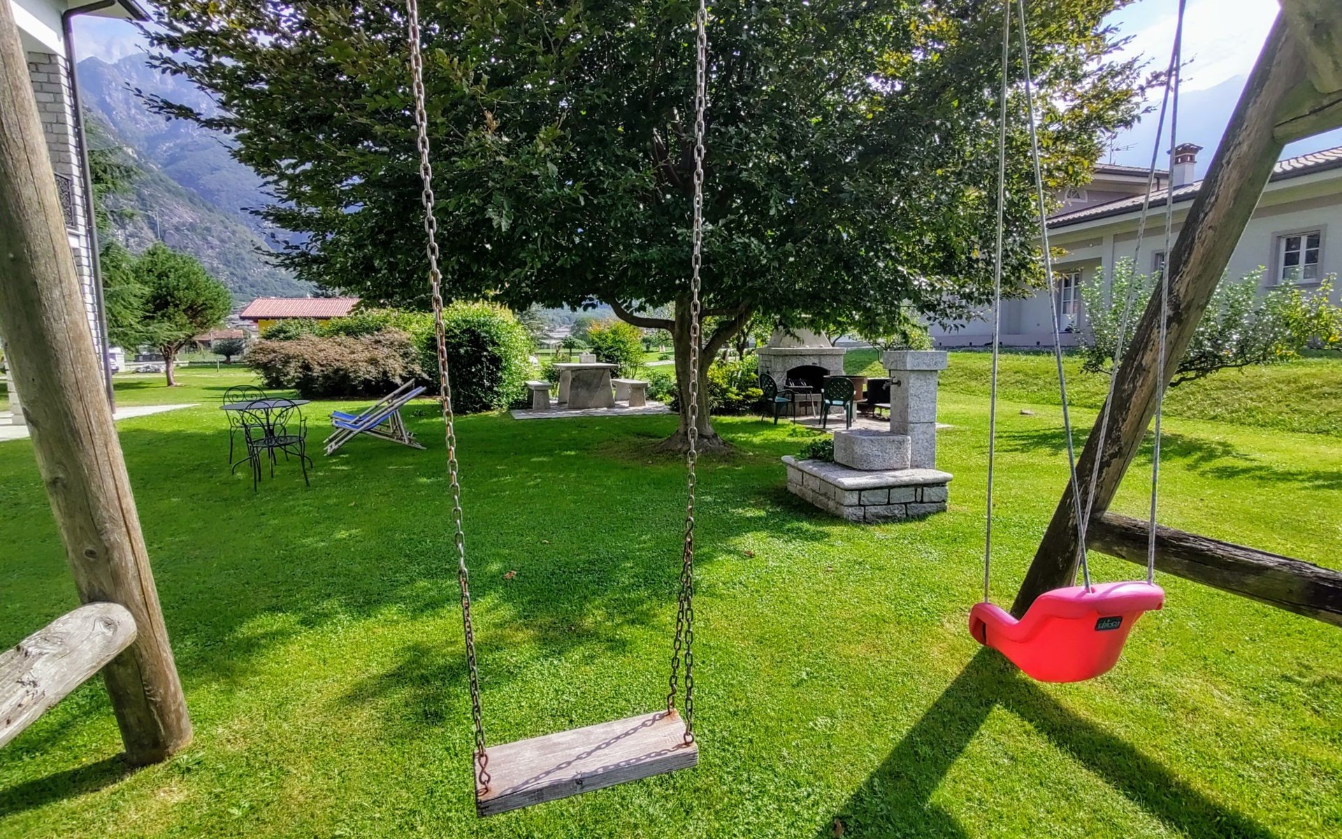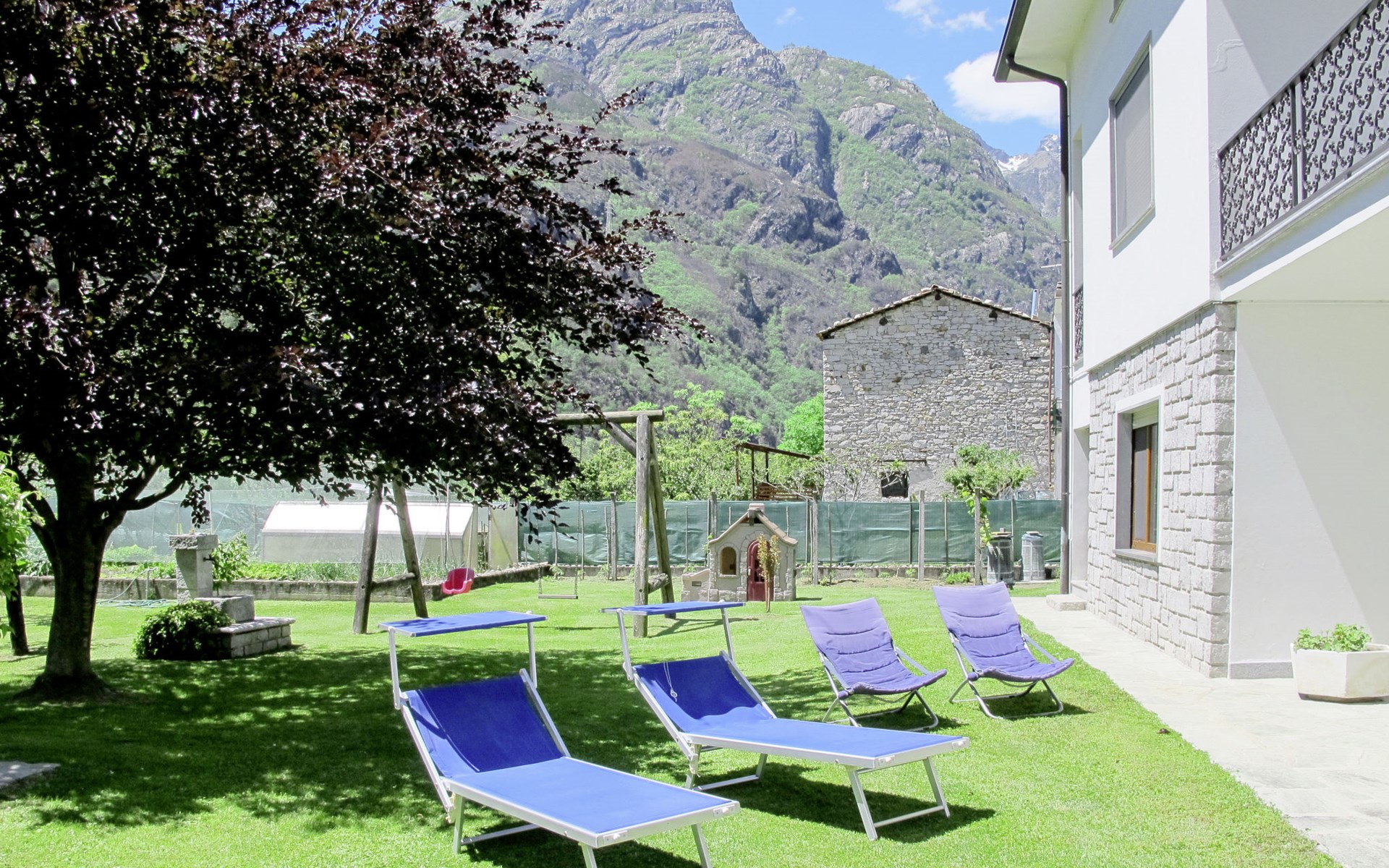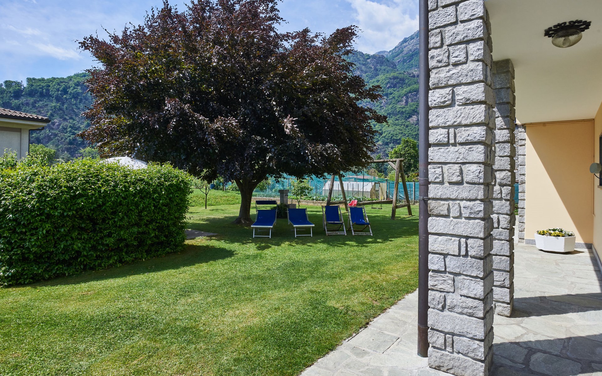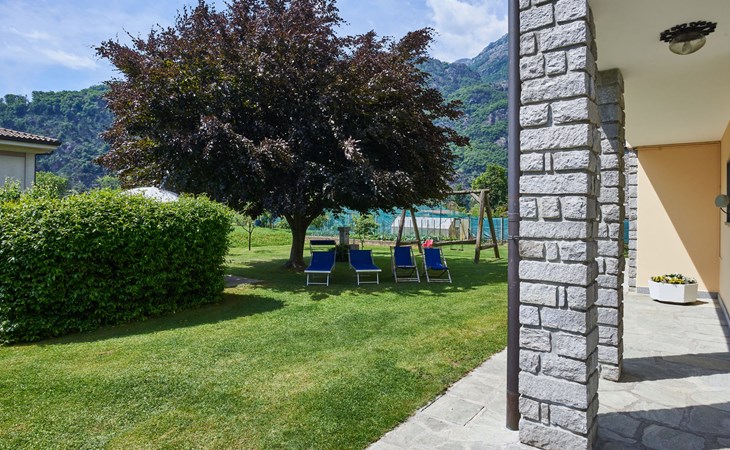 2-family house "Serena". In the district of Giumello 400 m from the centre of Novate Mezzola, 13 km from the centre of Chiavenna, 70 km from the centre of Como, in the residential district, 1.5 km from the lake, in a cul-de-sac. For shared use: large, well-kept garden (not fenced) with lawn and trees. Patio, barbecue (swing), parking on the premises. Supermarket 400 m, bus stop 600 m, railway station "Novate Mezzola" 500 m, sandy beach "Lido di Novate" 1.5 km pebble beach "La Punta (Lago di Como)" 12 km, indoor swimming pool 13 km. Marina 1.5 km, golf course (18 hole) 45 km, cycle lane 10 m, fishing possibilities 1.5 km. Well-known lakes can easily be reached: Lago di Mezzola 1.5 km, Lago di Como 12 km. Please note: the owner lives in the same residence.