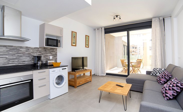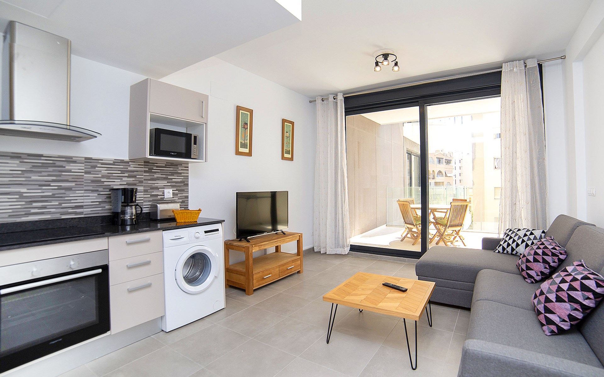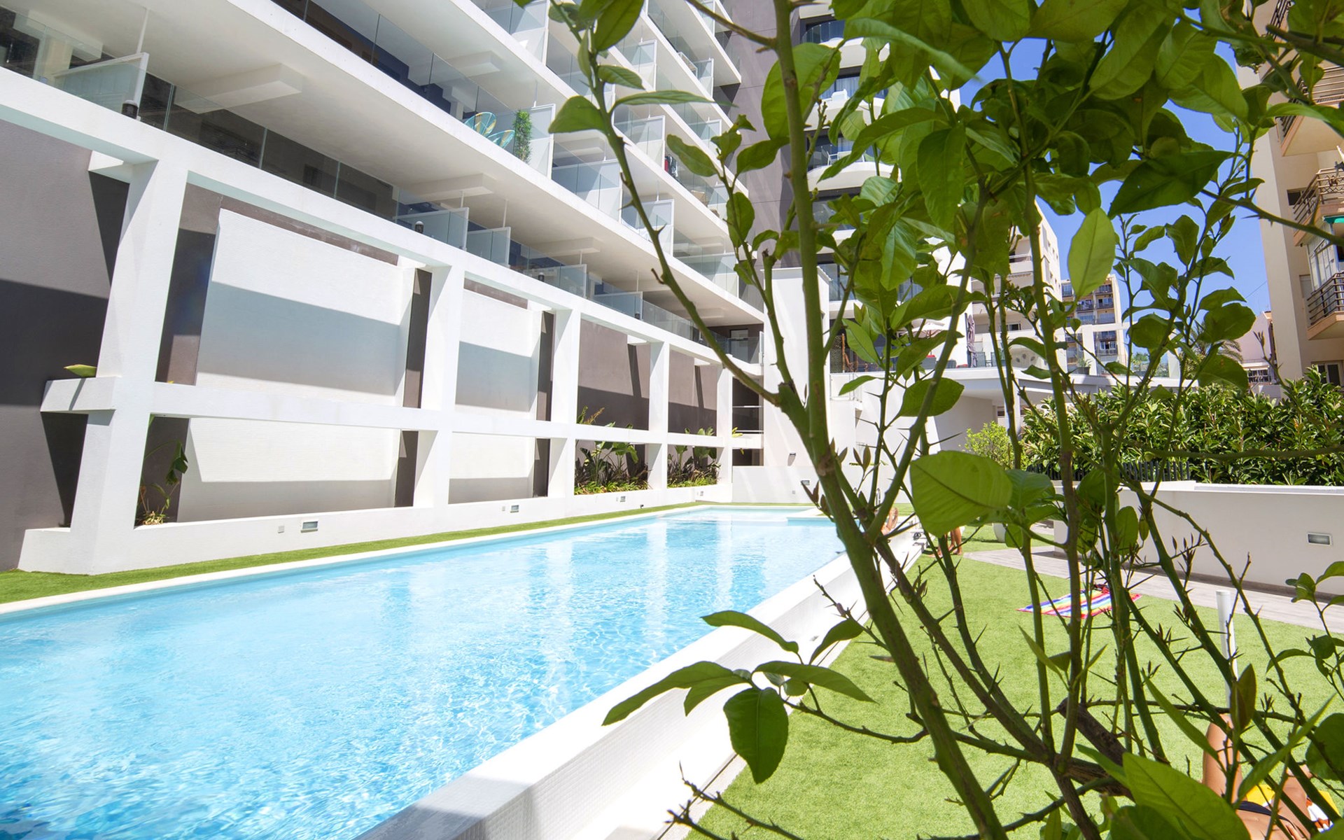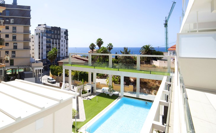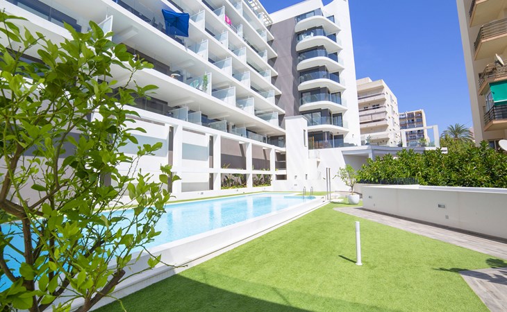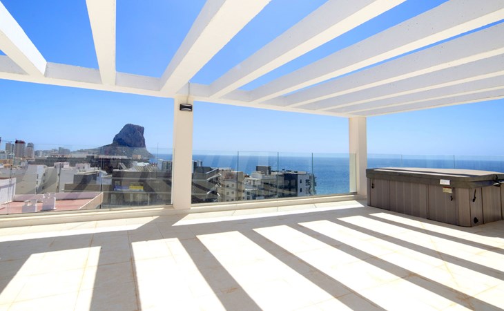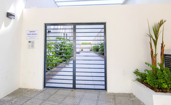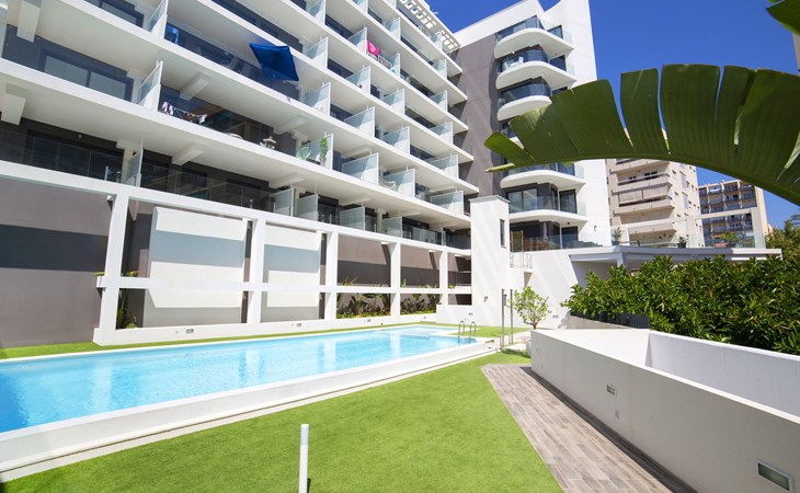 Calpe Centro: Modern, beautiful apartment block "Calpe Beach I", 10 storeys, built in 2019. 62 apartments in the residence. In the centre of Calpe, in a central position, excellent location: right in the centre but still quiet, 100 m from the sea, 100 m from the beach. For shared use: swimming pool (seasonal availability: 16.Apr. - 15.Oct. pool opening hours: 10:00-21:00). WC in the pool area, outdoor shower. In the house: solarium, lift, roof terrace. Grocery, supermarket 100 m, restaurant, bar, café 30 m, bus stop "Parada Bus" 100 m, sandy beach "Playa Arenal" 100 m. Sports harbour 2.4 km, marina 2.4 km, golf course (9 hole) 10 km, sailing school 2.4 km. Nearby attractions: Aqualandia, Terra Mítica, Mundomar, Terra Natura, Benidorm Palace (Benidorm).