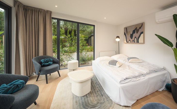 In addition to the stylish interior, the lodge offers air conditioning, which can both heat and cool, ensuring an optimal indoor climate in every season. Outside, the pergola not only provides shade or shelter but also includes the added luxury of an electric outdoor fireplace, perfect for ultimate relaxation outdoors.