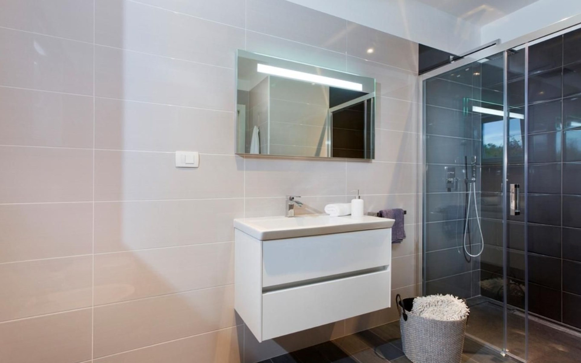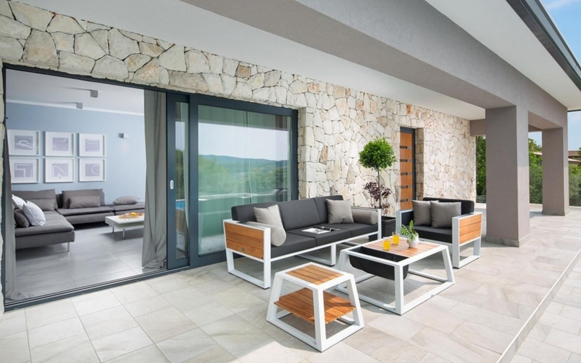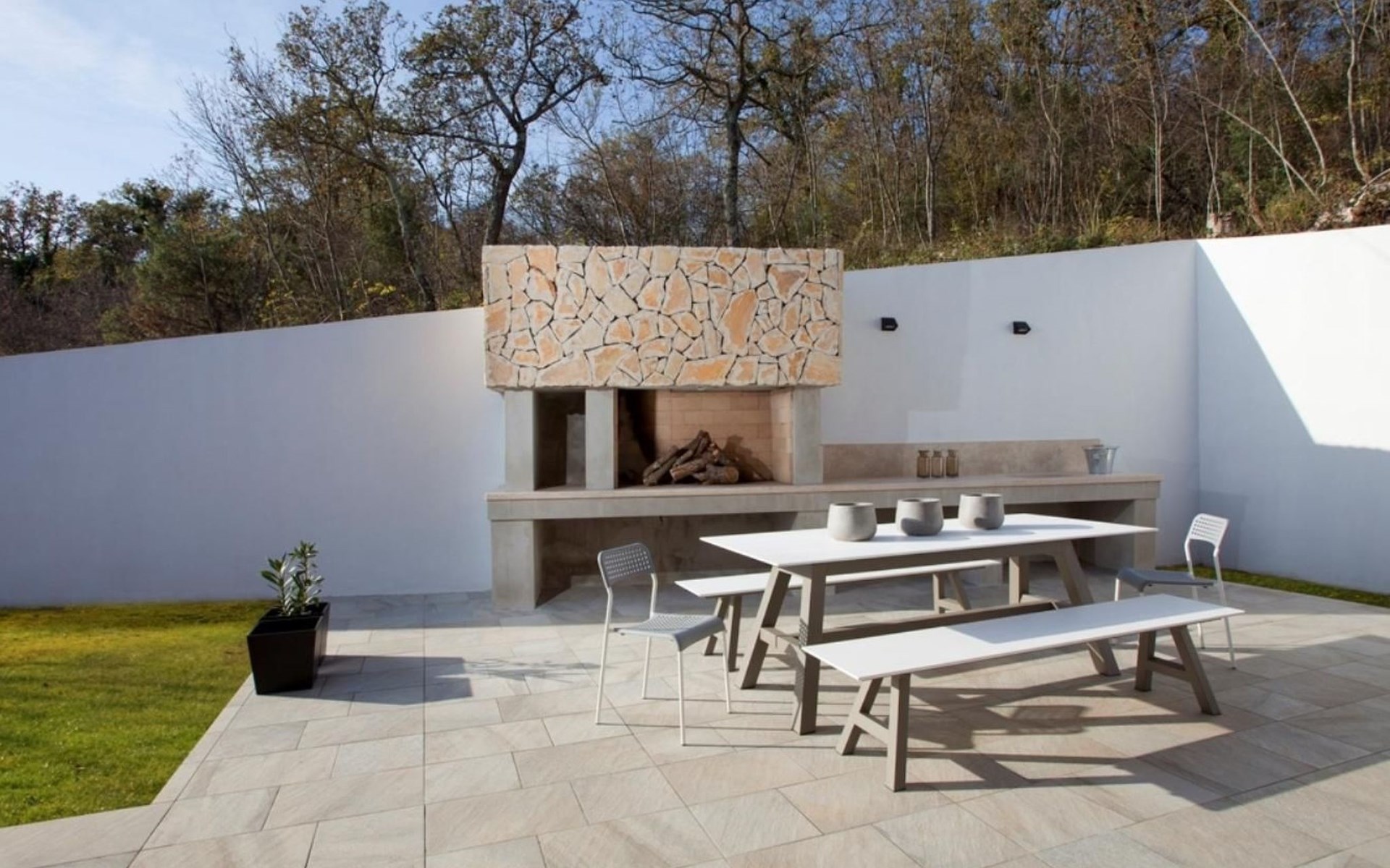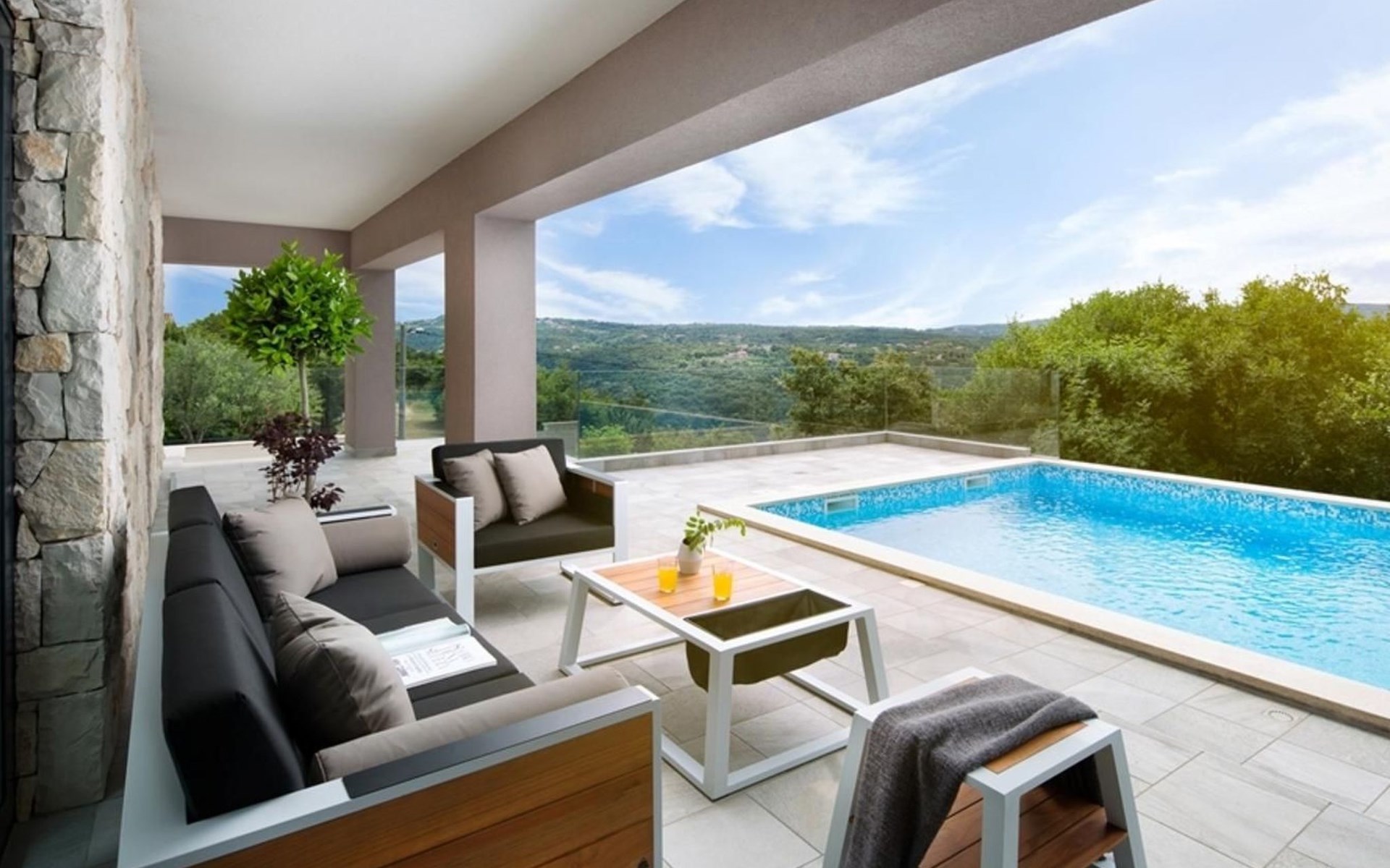 For a total of 8 guests, Villa Arsia offers 4 cosy and modernly designed bedrooms, 3 of them having their own spacious en-suite bathrooms. Modern style furniture and decor spreads over the whole 200m2 big interior. Natural materials, neutral colours, and the elimination of unnecessary detailing are found on both floors of Villa Arsia. The wide-open kitchen is fully equipped, the roomy living room has everything for fun film nights with the family, and it has also a direct exit to the terrace where the fun and memorable nights continue.